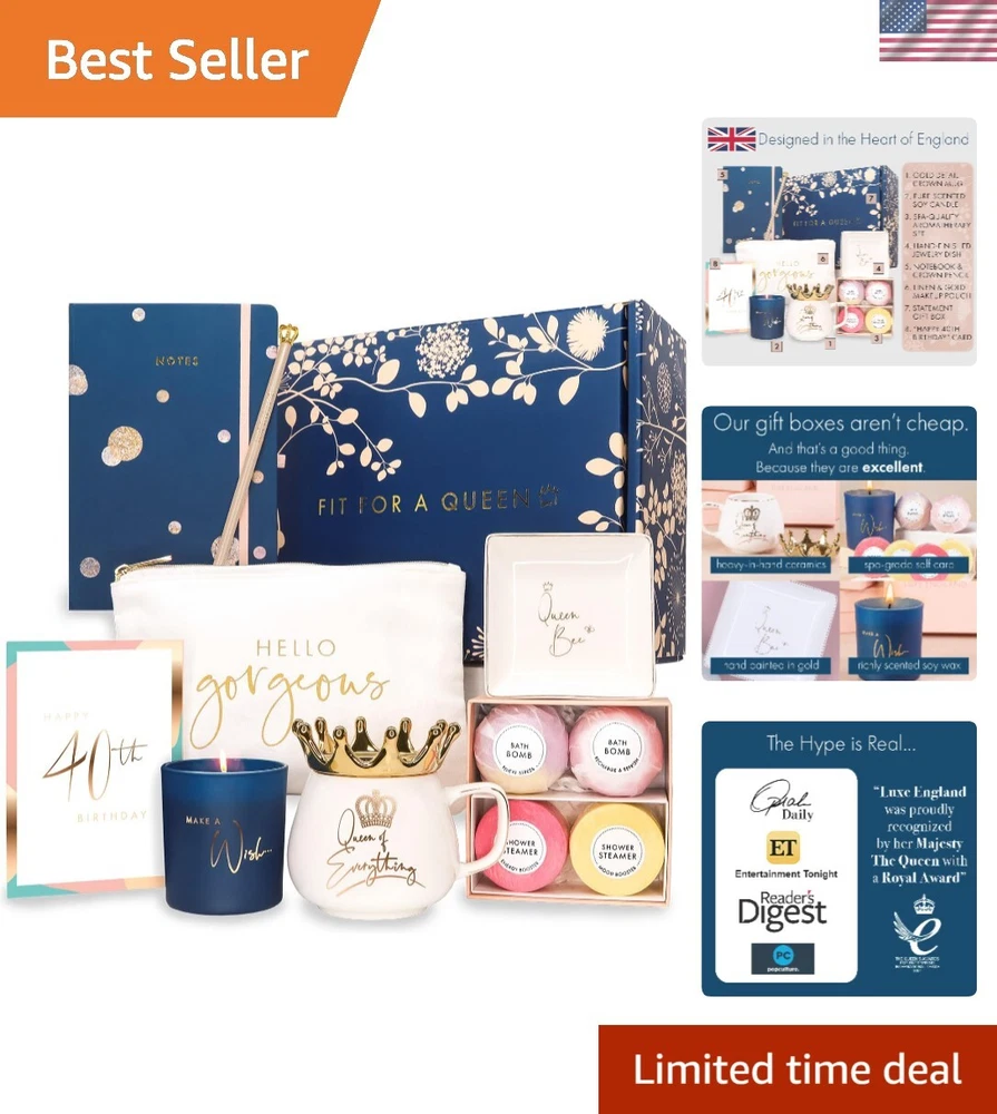 Royal 40th Birthday Gift Basket for Women - Luxury 40th Birthday Gifts for Women Designed in Britain โ€“ High-end Unique for Women Friend, Wife, Mom, Sister ๐Ÿ‘‘ LOOKING FOR THE TOP RATED 40th BIRTHDAY GIFT PROVEN TO IMPRESS? Gorgeous novelty gifts from an award winning BRITISH product! ๐Ÿ‘‘ Your gift box contains a 12oz coffee mug with crown lid, vanilla & lavender candle, lemon & rose bath bomb and shower steamer set, notebook with crown pencil, jewelry dish, makeup pouch and greeting card. ๐Ÿ‘‘ WOW HER WITH AN UNFORGETTABLE UNBOXING! Bursting with scent, fancy gift boxes and no crinkly plastic! If this isnโ€™t the BEST GIFT BOX sheโ€™s ever received, itโ€™s on us! ๐Ÿ‘‘ The luxurious choice to surprise any queen in your life on her 40th birthday! ๐Ÿ‘‘ Recommended by thousands of customers as best 40th birthday gifts for wife, friend, mom, sister, co-daughter, grandmother, aunt, boss, girlfriend or someone who has everything.