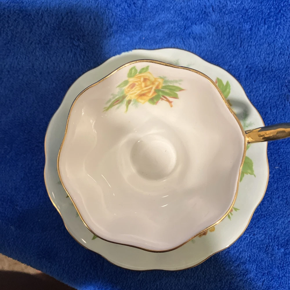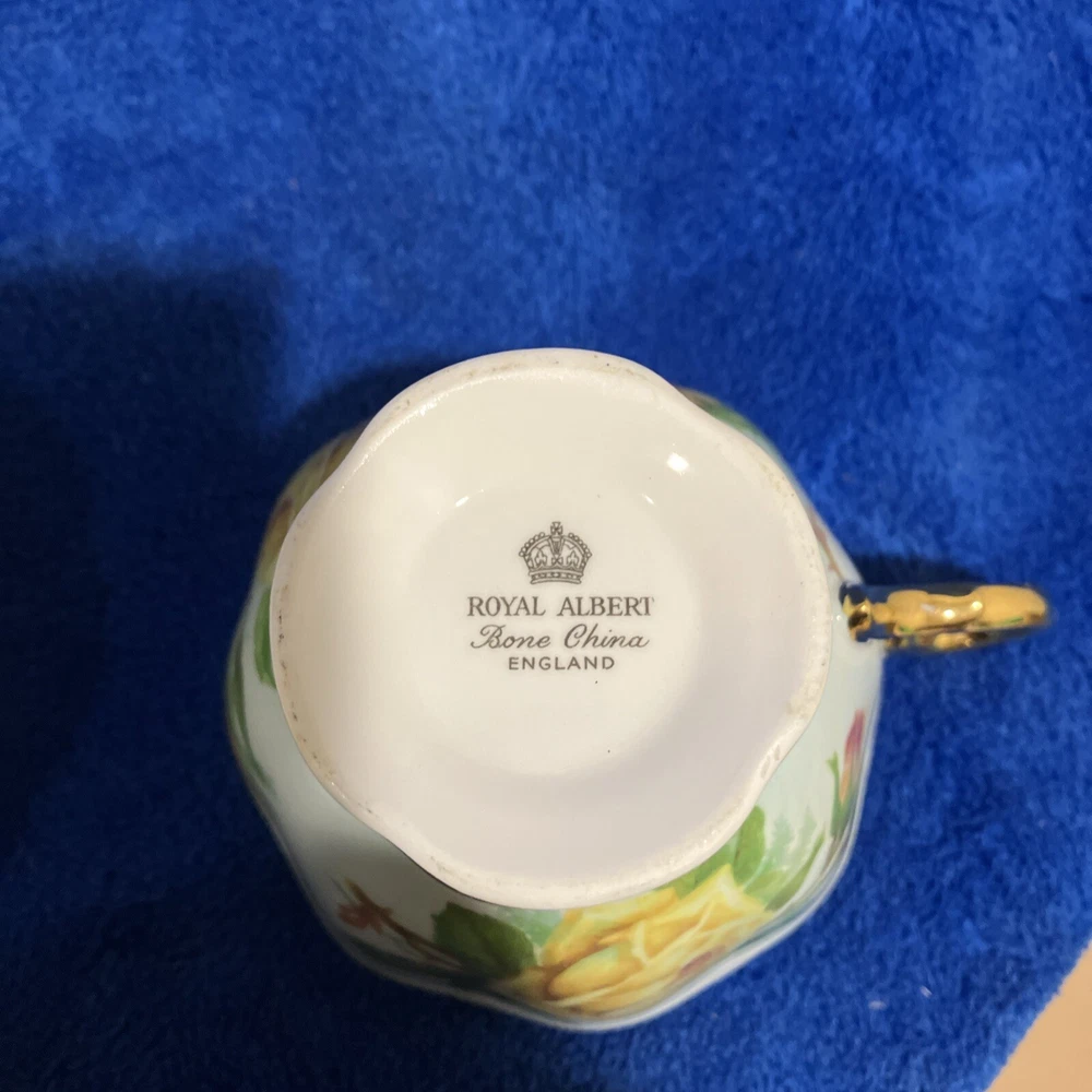 Royal Albert yellow rose pattern tea cup and saucer. No chips cracks or crazing in the glaze. Gold glaze around edge of cup and saucer as well as the handle. Set in very good condition. Combine shipping when purchasing multiple cups and saucers.