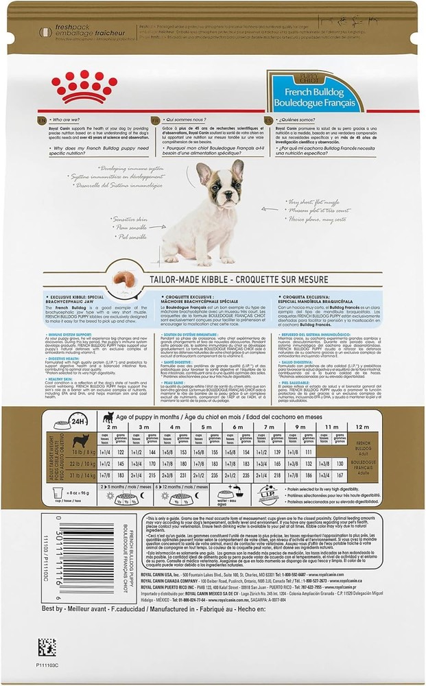 Serve up the tailored nutrition your French Bulldog deserves with Royal Canin Breed Health Nutrition French Bulldog Puppy Dog Food Dry Formula. Royal Canin makes it easier than ever to feed your puppy tailored dog food. This French Bulldog food features a customized curved-shaped kibble that is specially designed for your French Bulldog's short muzzle and jaw shape, making it easy for little dogs to pick up and chew. Not only that, but this complete and balanced puppy food provides the nutrition to help your best friend thrive. An exclusive mix of antioxidants and vitamin E in the dog kibble promotes healthy development of your puppy's immune system, while exclusive nutrients help support the skin barrier for healthy skin. Royal Canin French Bulldog food is formulated with high-quality protein and prebiotics to support digestive health and a balanced intestinal flora, contributing to optimal stool quality. Serve your French Bulldog Royal Canin Dog Food and promote your puppy's overall wellness with every meal. TAILORED NUTRITION: Check out the full range of Royal Canin wet and dry puppy food formulas that offer precise nutrition for dogs of all ages, sizes and breeds QUALITY AND SAFETY: Attention to the very smallest details helps Royal Canin deliver precise and effective health nutrition for pets MIXED FEEDING: Pairs well with Royal Canin Size Health Medium Puppy Thin Slices in Gravy Wet Dog Food DIGESTIVE HEALTH DOG FOOD: Healthy dog food helps to support a balanced intestinal flora and healthy digestion, contributing to optimal stool quality SKIN HEALTH: Exclusive nutrients help support the skin barrier for healthy skin IMMUNE SUPPORT PUPPY FOOD: Antioxidants and vitamin E in the dry dog food promote healthy development of your puppy's immune system CRUNCHY KIBBLE: Customized curved dog kibble shape specially designed for your French Bulldog puppy's short muzzle and jaw shape BREED HEALTH NUTRITION PUPPY DOG FOOD: Royal Canin Breed Health Nutrition French Bulldog Puppy Dog Food Dry Formula for purebred French Bulldogs 8 weeks to 12 months old Product Dimensions 3.5 x 13.5 x 23.5 inches; 10.5 Pounds Manufacturer recommended age 1 month and up Item model number 111109 Manufacturer Royal Canin Brand Royal Canin Flavor Chicken Age Range (Description) Puppy Item Form Kibble Specific Uses For Product Muscle Care Item Weight 10.5 pounds Manufacturer Royal Canin Item model number 111109 Item Dimensions LxWxH 3.5 x 13.5 x 23.5 inches Brand Name Royal Canin Target Audience Keyword French Bull dog Puppy Directions Royal Canin French Bulldog Puppy dry dog food is designed to meet the nutritional needs of purebred French Bulldogs 8 weeks to 12 months old Size 10.5 Pound (Pack of 1) Age Range Description Puppy Number of Items 1 Style Puppy Breed Recommendation Medium Breeds Specific Uses for Product Muscle Care Item Package Dimensions L x W x H 22.5 x 12.5 x 3.4 inches 8161174