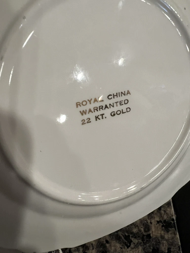 Vintage Royal China Warranted 22kt Gold Square Snack Cheese Salad Dessert Plate Square Scalloped Edges. Scene in the middle. Gold lace ornament and pretty pattern around the rim Some crazing. See pics. The mark on the back clearly reads "Royal China," which was the name of a prolific company located in Sebring, Ohio. Royal was founded in 1934 during the aftermath of the Great Depression.