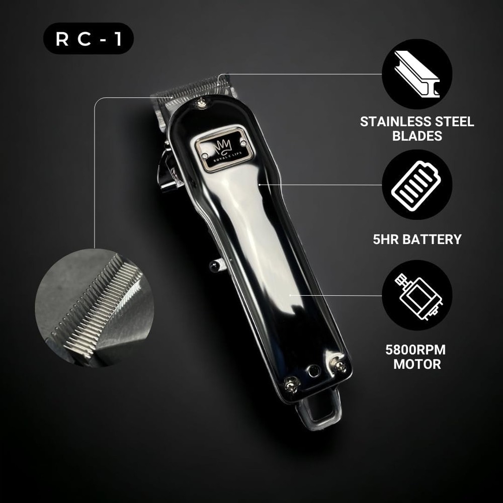 Royal Clips Hair and Beard Fade Kit – Professional Clipper, Trimmer & Foil Shaver Bundle for Men, Complete Haircut Set for Barbers, Home Use & Grooming – 5-Hour Battery, 10pcs Limit Combs, Silver Item Description About this item PROFESSIONAL FADE KIT: Our Hair and Beard Fade Kit is the ultimate set for at-home fades, trims, and shaves that look professional. Includes clipper, trimmer, and foil shaver for versatile styling and grooming. Ideal for home use or for barbers! HIGH-PERFORMANCE COMBO: With its ultra-powerful motor and precision blades, the clipper and trimmer creates seamless, smooth hair and beard trims. Adjustable settings and a 3+ hour battery life ensure you get the most out of every session. CLOSE & COMFORTABLE SHAVE: With its Double Foil design and durable all-metal body, the foil shaver offers a smoother shave. Ideal for achieving an ultra-close shave on the face and neck, giving you a consistently clean, polished appearance. COMPLETE GROOMING KIT: You can personalize your fade, trim, and style with this all-in-one package, comes with 10 limit combs in different sizes. Whether you’re a pro or a beginner, these will help you master any look—from crisp fades to precise beard lines. LONG-LASTING BATTERY: Royal Clips Fade Kit's high-capacity battery allows for 3+ hours of uninterrupted use. This helps you stay sharp without the need for frequent recharging, making it ideal for lengthy barbering sessions, home grooming, or travel. › See more product details Package Dimensions:8.94 x 8.07 x 5.31 inches; 1.54 Pounds Item model number:RC-FK1 Batteries:1 Lithium Ion batteries required. (included) Date First Available:April 21, 2023 Manufacturer:Royal Clips ASIN:B0C381K716 Best Sellers Rank:#137 in Hair Clippers Customer Reviews:4.5 4.5 out of 5 stars *Fade Kit 2.0 Precision & Power in Every Cut – Engineered for barbers and home stylists, the Fade Kit delivers sharp, clean fades with high-performance clippers and trimmers. *Fade Kit Complete Grooming Experience – From fades to finishes, this all-in-one kit includes professional-grade tools to achieve the perfect look effortlessly. *Fade Pack Perfect for Barbers & Grooming Enthusiasts – Stay organized and stylish with this premium fade pack, designed for convenience and performance. *Beard Kit Complete Beard Care in One Kit – Achieve a well-groomed look with premium tools designed for shaping, trimming, and styling your beard. Precision & Power in Every Cut – Engineered for barbers and home stylists, the Fade Kit delivers sharp, clean fades with high-performance clippers and trimmers. Complete Grooming Experience – From fades to finishes, this all-in-one kit includes professional-grade tools to achieve the perfect look effortlessly. Perfect for Barbers & Grooming Enthusiasts – Stay organized and stylish with this premium fade pack, designed for convenience and performance. Complete Beard Care in One Kit – Achieve a well-groomed look with premium tools designed for shaping, trimming, and styling your beard. Payment We accept payment only through PAYPAL Shipping We ship products worldwide through standard express courier service, it will reach within 7 to 10 days to abroad buyers, we ship the product after recieved clear payment and give full information about shipment to the buyer Return We accept product return within 7 to 21 days from delivery date but product should be in original position and not in damaged condition,the return shipping charges will be buyer responsibility