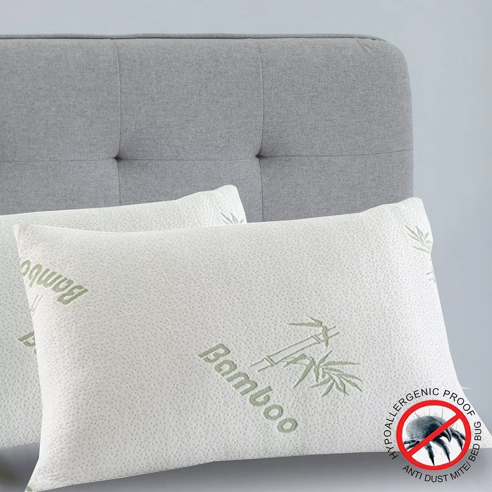 DESCRIPTION Experience the premium comfort you deserve with the Bamboo-Covered Memory Foam Pillow Twin Pack, designed by Royal Comfort. The memory foam interior is made to provide breathable all-round air flow and it works by gently contouring to the neck and head. It responds to both the body’s movement and heat, reshaping itself to evenly distribute the weight on the pillow, and eliminate painful pressure points. The pillow also features a bamboo-blended cover that is anti-microbial with moisture-wicking properties. The cover is conveniently both easily removable and machine-washable, for a longer-lasting effect. FEATURES: Brand: Royal Comfort High-Quality Memory Foam Gently Contours To Your Head and Neck Cover is Anti-microbial with Moisture-Wicking Properties Breathable All-Round Air Flow Suitable for Back and Side Sleepers Generous Loft and Fill Easily Removable and Washable Cover Handy Storage/Carry Bag for Convenience Size: 56cm x 36cm x 10cm (each pillow) Cover: 35% Rayon from Bamboo, 65% polyester, 230GSM, Knitted Fabric Pattern Inner Filling: 600g crumbed memory foam PACKAGE CONTENTS : 2 x Royal Comfort Bamboo-Covered Memory Foam Pillows (Twin pack)