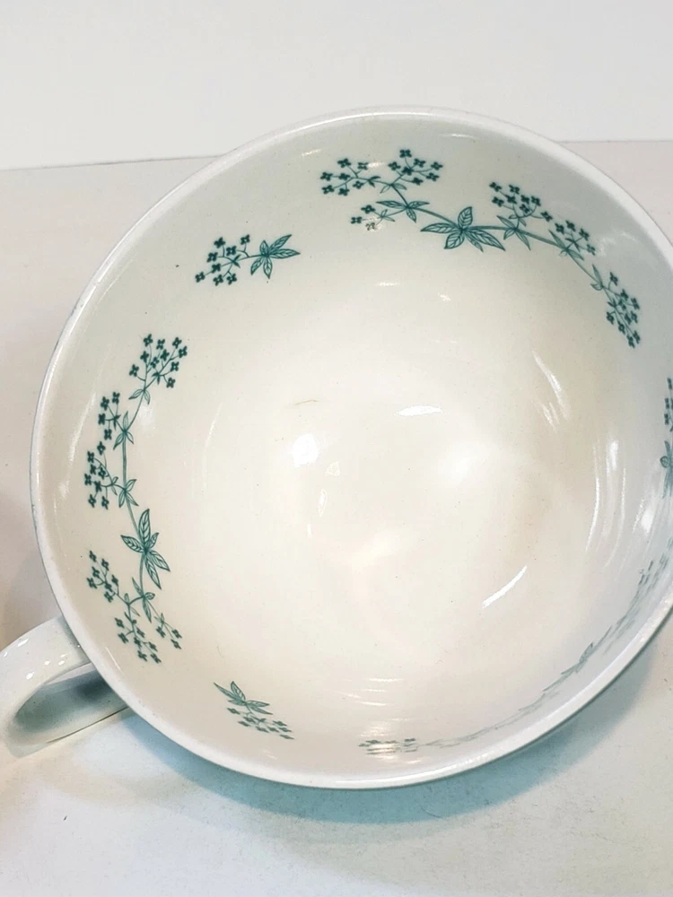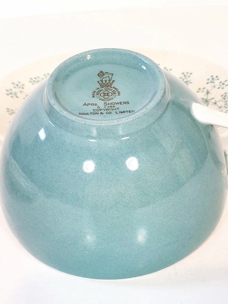 Royal Doulton April Showers Set Of 2 Tea Cups & Saucers D6435. 4 pcs 2 sets beautiful light blue color made in England . Saucers have a pattern the looks like crazing measures 6" across no chips or cracks. Tea cups are 3 3/4" across 2 1/4" tall one has a small mark on the inside see pictures it does not go all the way through besides that they are very pretty no chips or cracks .