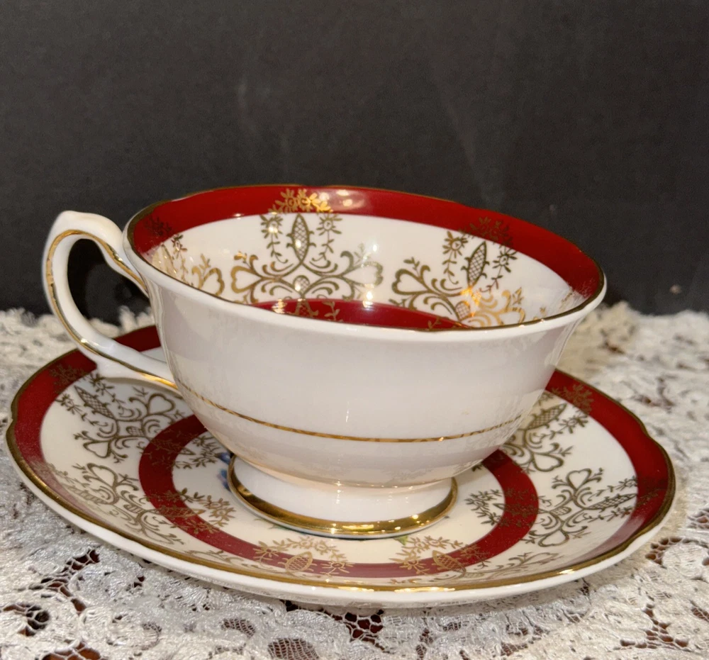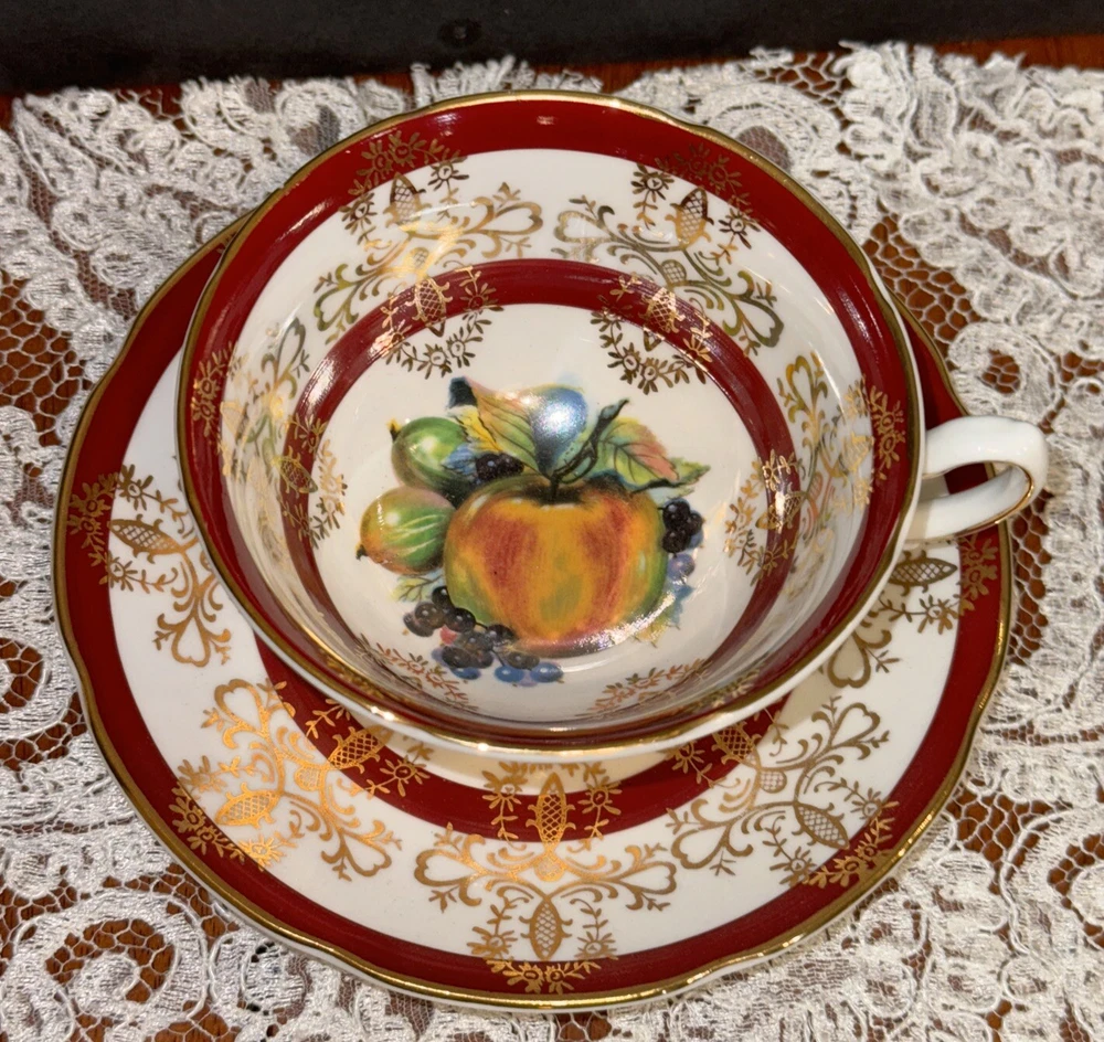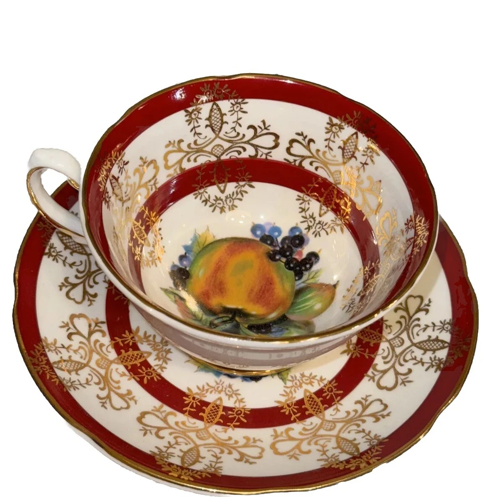 Sought after elegant burgundy tea cup and saucer set features a mix of peach or apple with blueberries and elderberries, all accented with gold. The set is made of fine bone china and was crafted in England Please let me know if you have any questions Check out the other teacups and saucers offered for sale in my store for sales and new inventory coming soon