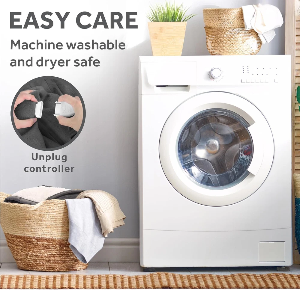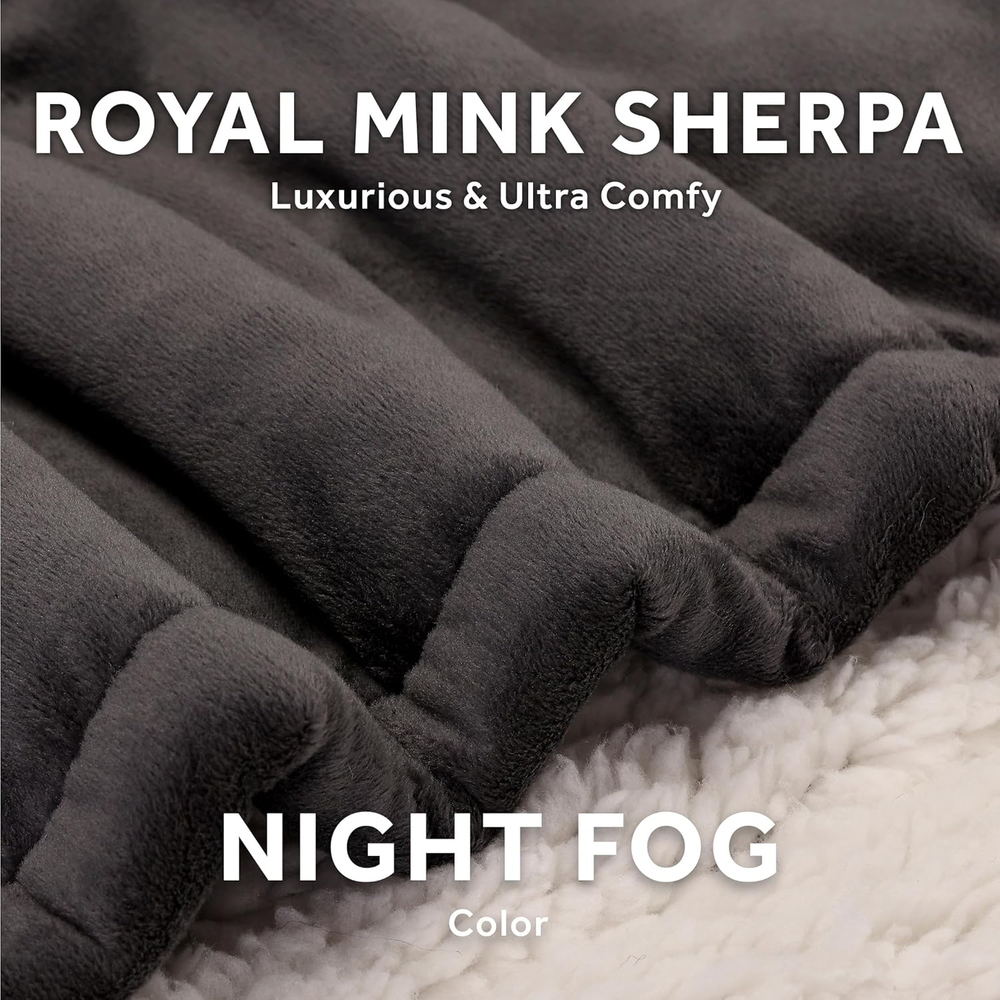 Polyester Easy to use electric throw with push button controller, with 4 heat settings and 4-hour auto-shut off function for peace of mind Luxurious and ultra comfy royal mink with reverse sherpa material for added warmth and comfort, stylish dark grey color 50" x 60", ideal size to snuggle up in Makes a great accessory while relaxing on couch, bed or your favorite chair Machine washable and dryer safe for easy care, 100% Polyester Snuggle up with the Sunbeam Royal Mink Sherpa Heated Throw to beat those winter chills. Indulge yourself with its luxurious and ultra comfy material with reverse side sherpa to keep you toasty all night long or warm as you unwind. Easy to use detachable controller with 4 heat settings and a 4-hour auto-shut off feature for peace of mind. Remove the controller and place the blanket into the washer and dryer for easy cleaning.