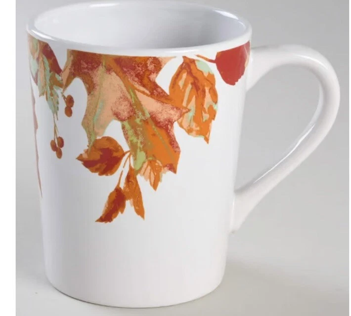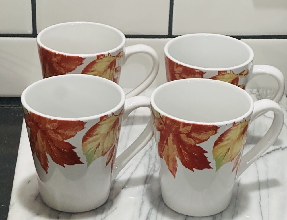 The set includes four medium-sized Royal Norfolk coffee cups featuring a contemporary design with painted leaves and acorns, perfect for Thanksgiving celebrations. The 12 oz ceramic cups are suitable for both hot and cold beverages and are decorated in a multicolor pattern. They are part of the Food & Drink theme, with a capacity to serve four individuals. These original coffee mugs are designed for unisex adults in a contemporary style, manufactured in 2023.