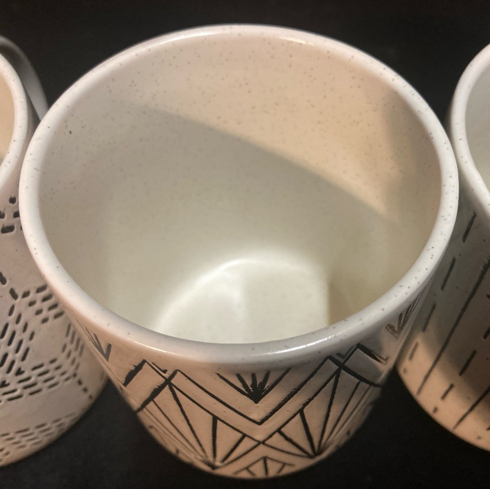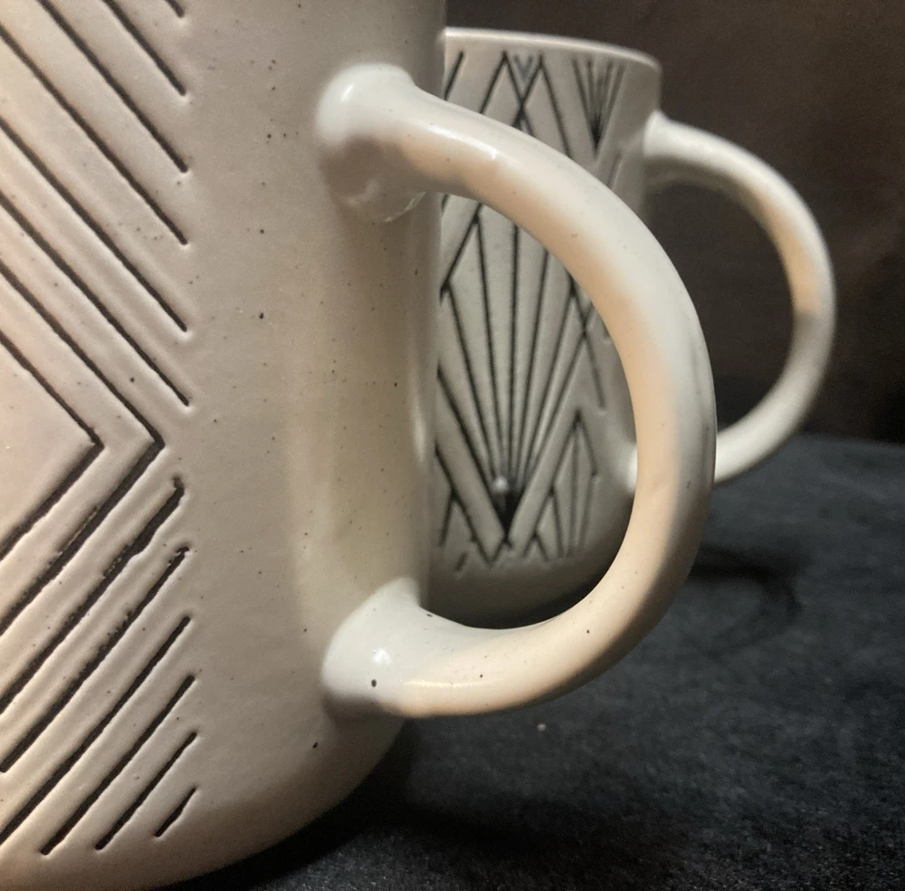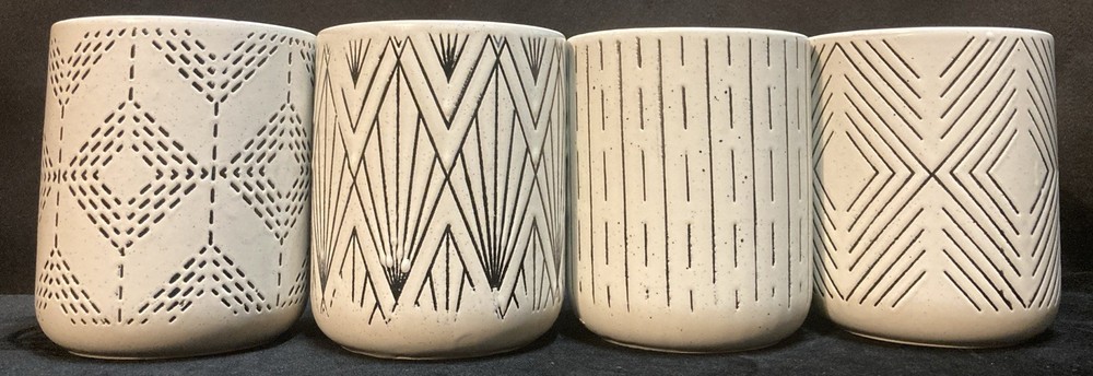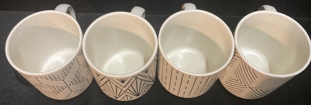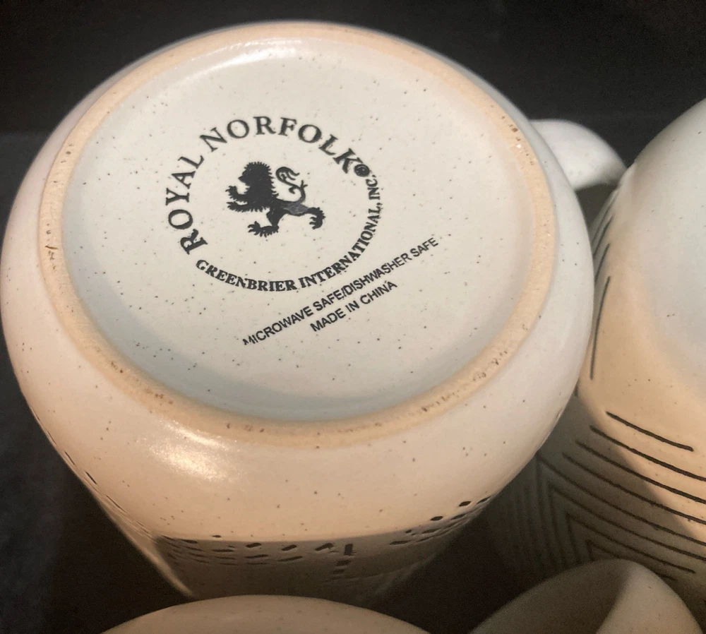 This set of four Royal Norfolk White Stoneware Coffee Mugs are a stylish and modern addition to any kitchen or dining area. This four-piece set features a white and black line pattern on round, 14oz mugs. The set is pre-owned but has never been used. It comes in very good, clean condition with no chips, cracks, or breaks. Please see pictures for details. If you have any questions or concerns, please do not hesitate to contact us. Check out our other items and message us if interested in more than one listing as combining items could save you money on shipping.