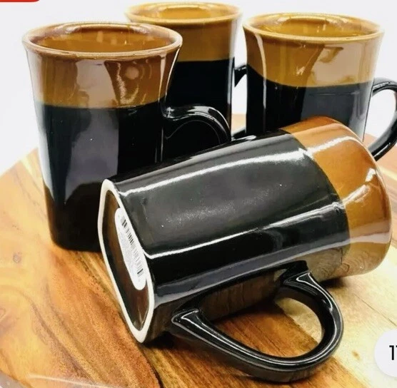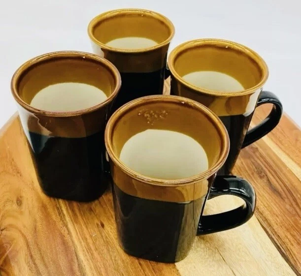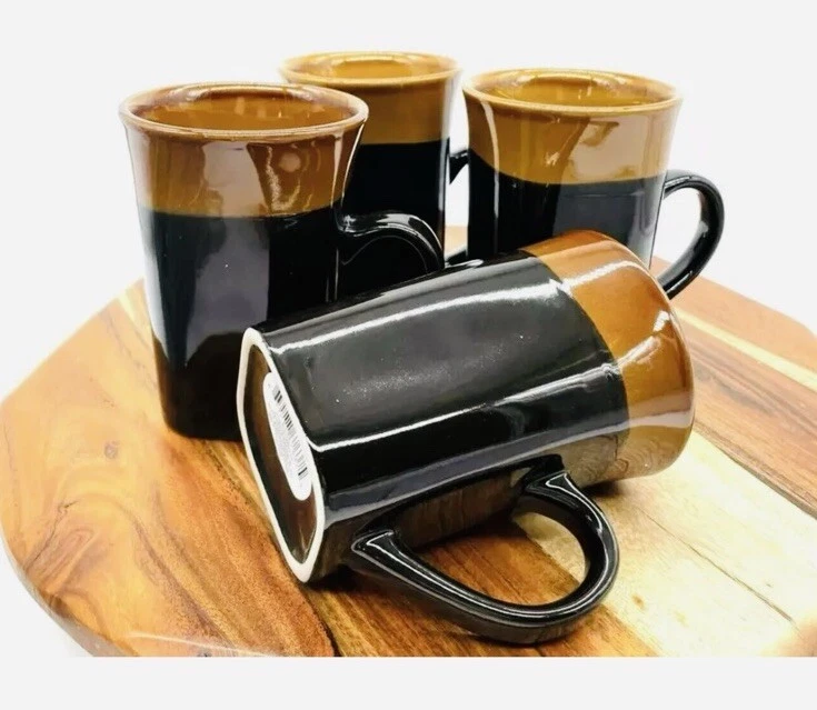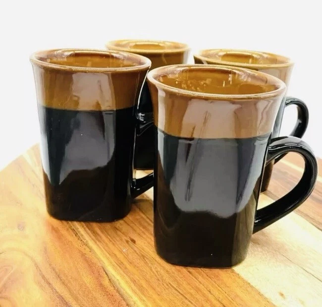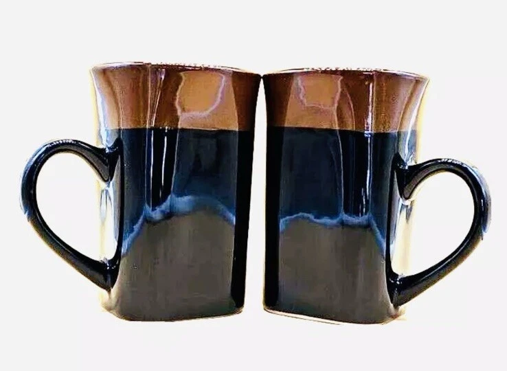 The Royal Norfolk Black & Brown Square Cocoa Coffee Mug set includes four 14 oz mugs made of stoneware. The square-shaped mugs stand 5 inches tall with a width of 3.5 inches, featuring a contemporary style with a solid black color and beach, nautical, and western themes. These mugs are suitable for hot beverages, microwave and dishwasher safe, making them ideal for all occasions. Each set includes Cappuccino Cup, Latte Mug, Coffee Cup, and Coffee Mug, perfect for enjoying your favorite drinks in a stylish and functional manner. Vintage style Royal Norfolk square stoneware coffee mug. Blue with brown band around rim. Capacity approximately 14 oz. Microwave and dishwasher safe. Approximately 5” tall x 3” long x 3” wide; 4 ½” wide (including handle).