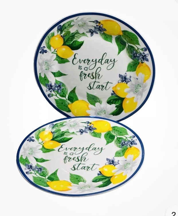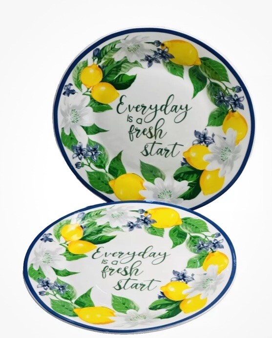 The Royal Norfolk Lemon Floral Salad Plate features a contemporary round shape with a 7.5-inch diameter and a glossy finish. The plates are adorned with a vibrant blue rim and a floral pattern, making them perfect for summer, casual, or all occasions. They are microwave and dishwasher safe, making them convenient for everyday use. This set includes two decorative plates from the Summertime product line, manufactured in 2024 in China by Royal Norfolk.