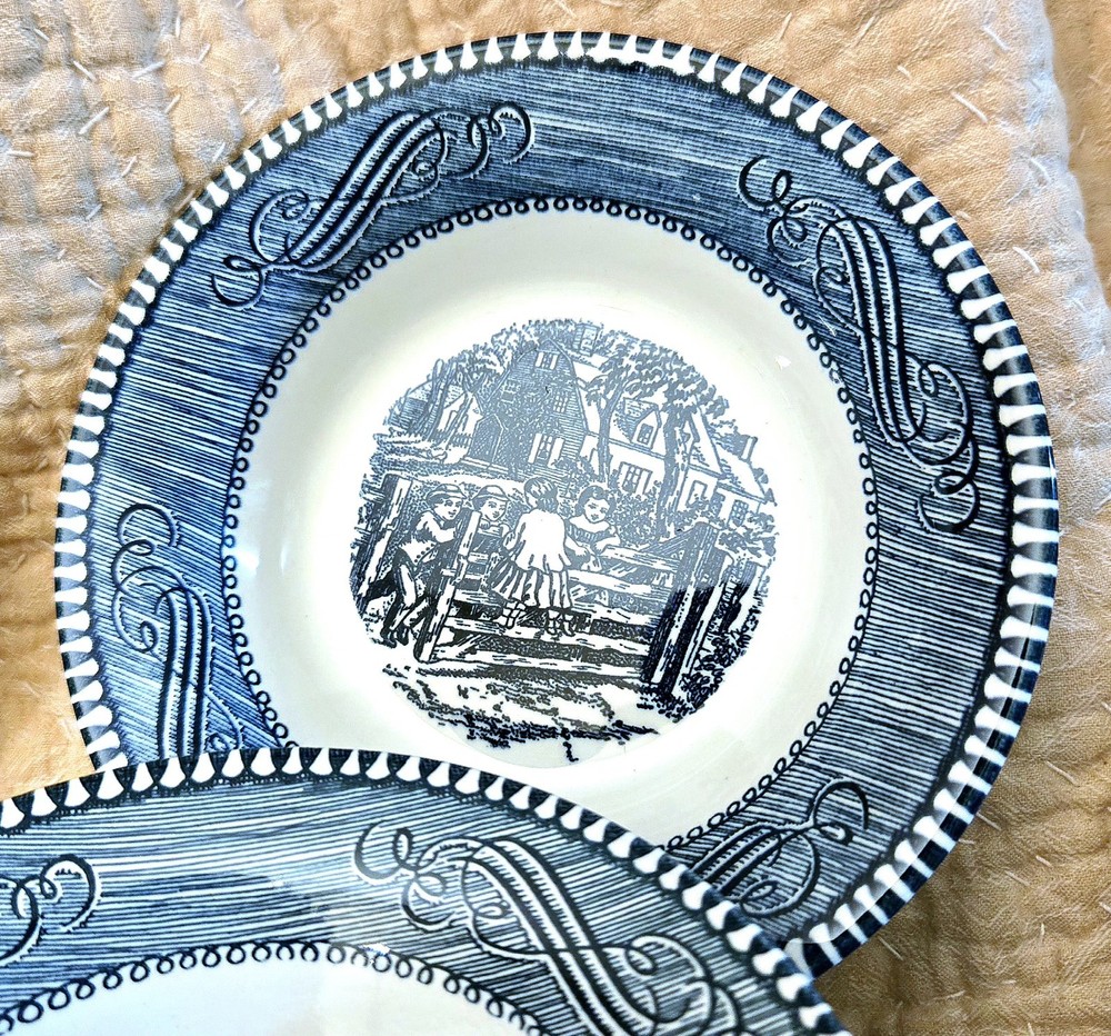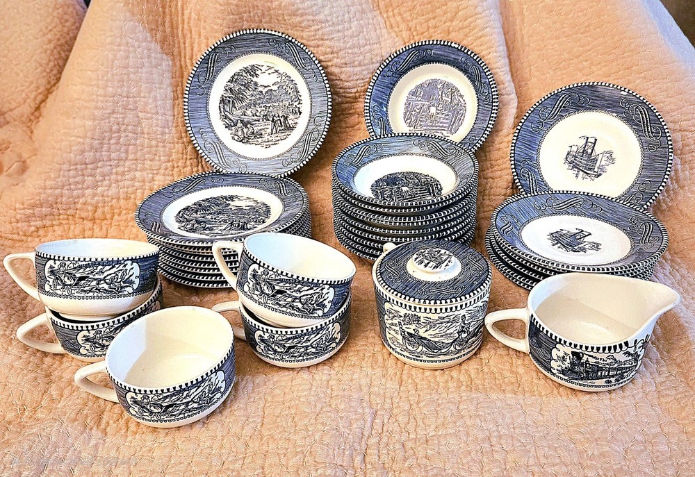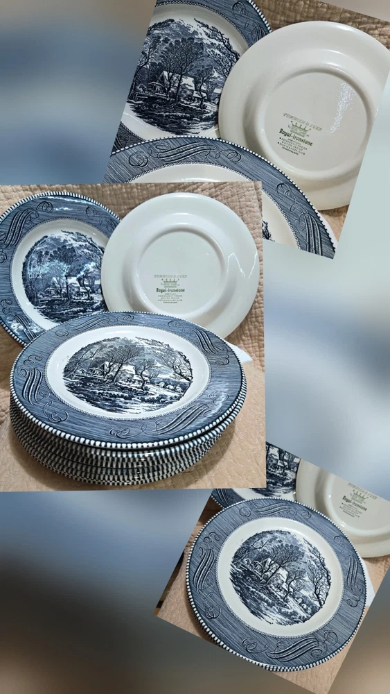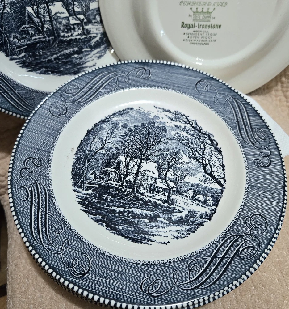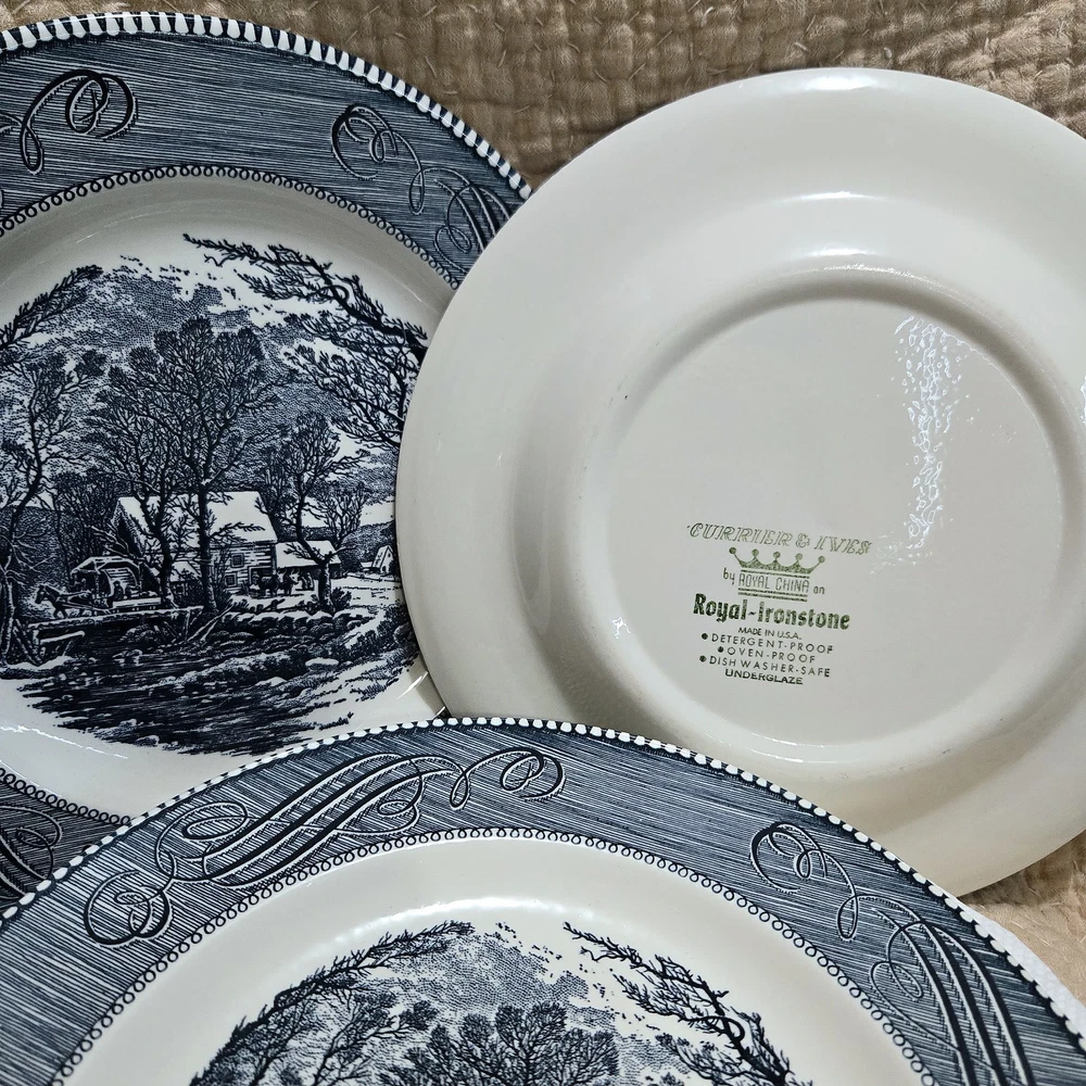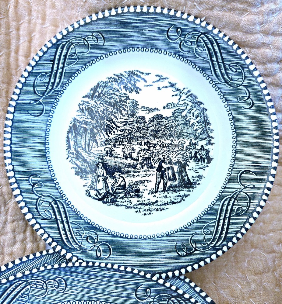 Color: blue and white Theme: Early American Occasion: All Occasions Country/Region of Manufacture: United States Era: Mid 20th Century (1941-1969) Time Period Manufactured: 1950-1959 Material: ceramic , porcelain Style: Colonial Features: oven proof, dishwasher safe Pattern: Old Grist Mill Vintage: Yes Culture: American Shape: Round Antique: Yes Item Diameter: varies Type: Collector Plate Production Technique: Pottery Brand: currier & Ives Production Style: Art Pottery Origin: USA
