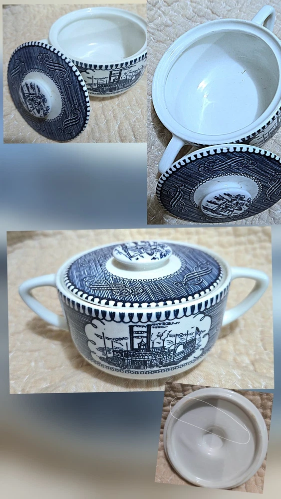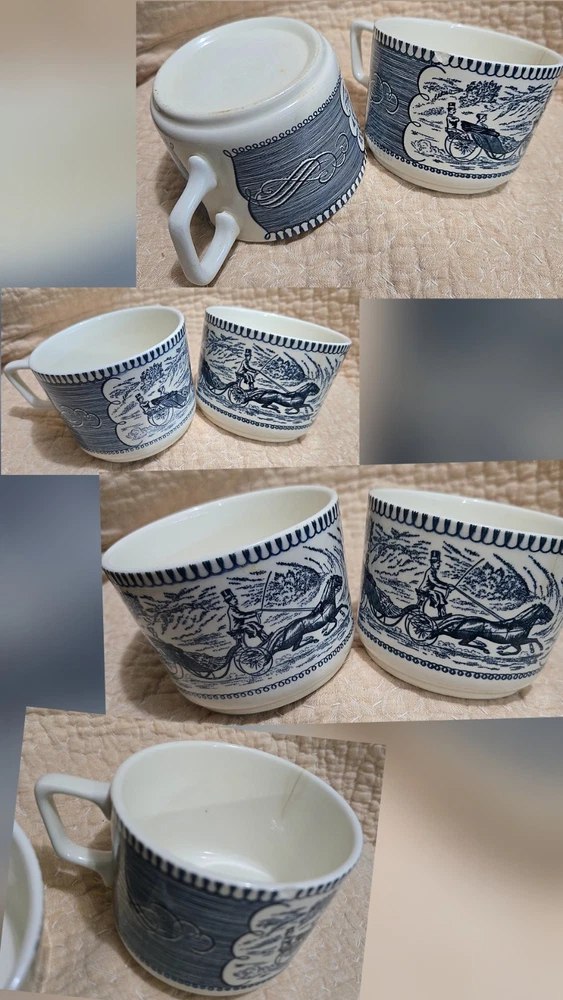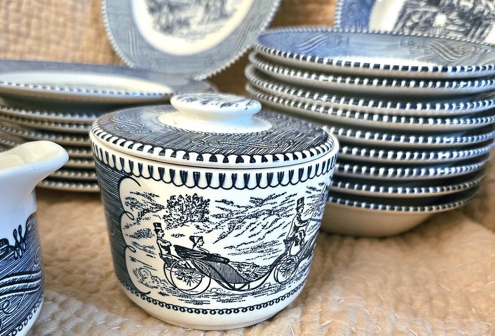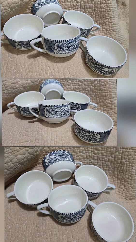 The Currier & Ives Blue & White Collection "Old Grist Mill" By Royal is a vintage collector plate originating from the USA. Made of bone china and porcelain, this round plate features a blue and white color scheme with a Colonial style and Early American theme. Produced in the late 20th century, this oven-proof and dishwasher-safe plate showcases American culture and pottery techniques from the 1940-1970. Perfect for all occasions, this collector plate by Currier & Ives is a nostalgic addition to any decorative collection. 1 creamer, 1 sugar bowl set, 10 fruit/dessert sauce bowl, 9 bread & butter saucer, 2 blue mugs, 7 tea cup and saucer set, and 5 teacups, also If sold individually priced at over 400.00, get now all for 185.00. In excellent shape, just a beautiful collection. The teacups are made of bone china and are often part of a set that includes saucers with a different pattern, such as a riverboat design. These collectible pieces were first produced in the 1950s and continue to be popular today. Some dinnerware, including cups, can fetch higher prices. For example, a 21-piece set was listed at $550. Correction: lid to sugar has hairline crack , price listed is discounted to accommodate. Also including 1 blue mug with hairline and 1 chip.