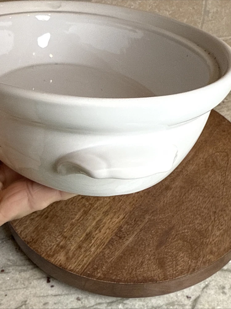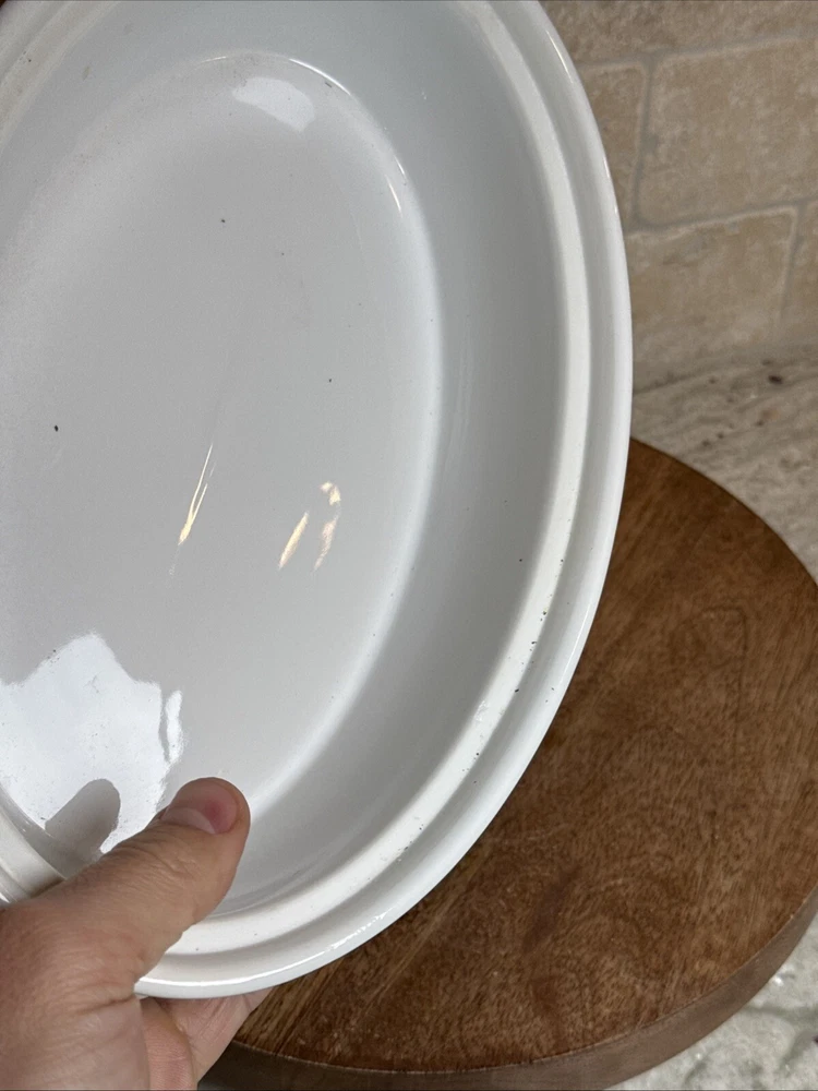 This is a gorgeous covered vegetable dish. There is a little smudging in the foot, that's about it - see photos. The sides of the dish have berries and shocks of wheat. The lid is covered with beautiful renderings of fruit. Bountiful harvest. • Length: 9 3/8 in • Height: 2 1/8 in • Special Characteristics: GLD HDLS • Porcelain • Crafted in England