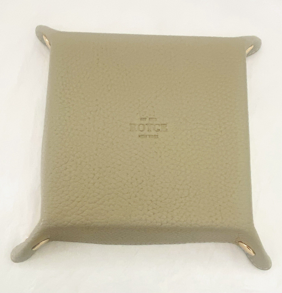 Royce Leather Signature Valet Tray Taupe Jewelry with AY Monogram. Snaps on each corner which allows to lay flat. Top Nappa Leather. Measures 6x6x1.5". The Royce Leather Signature Catchall Tray in beige is a square-shaped jewelry organizer made of leather, featuring a personalized AY monogram. This tray is designed to hold necklaces, bracelets, rings, and earrings, making it a stylish and practical way to store and display your favorite accessories. Made in New York by Royce , this valet organizer is suitable for both men and women and adds a touch of sophistication to any vanity or dresser or great for travel. Catchall Valet Tray Keep your everyday essentials organized with our catchall valet tray, a timeless blend of function and craftsmanship. Made from premium full-grain leather, this elegant tray is designed to hold keys, wallets, watches, and other small items, keeping your space clutter-free. Hand-stitched and finished with precision, the valet tray features a structured yet flexible design with snap-button corners for easy assembly and storage. Whether placed on a nightstand, desk, or entryway table, it adds a touch of sophistication to any space while ensuring your essentials are always within reach. Perfect for home or office use, this handcrafted leather tray makes an excellent gift for those who appreciate quality and organization.