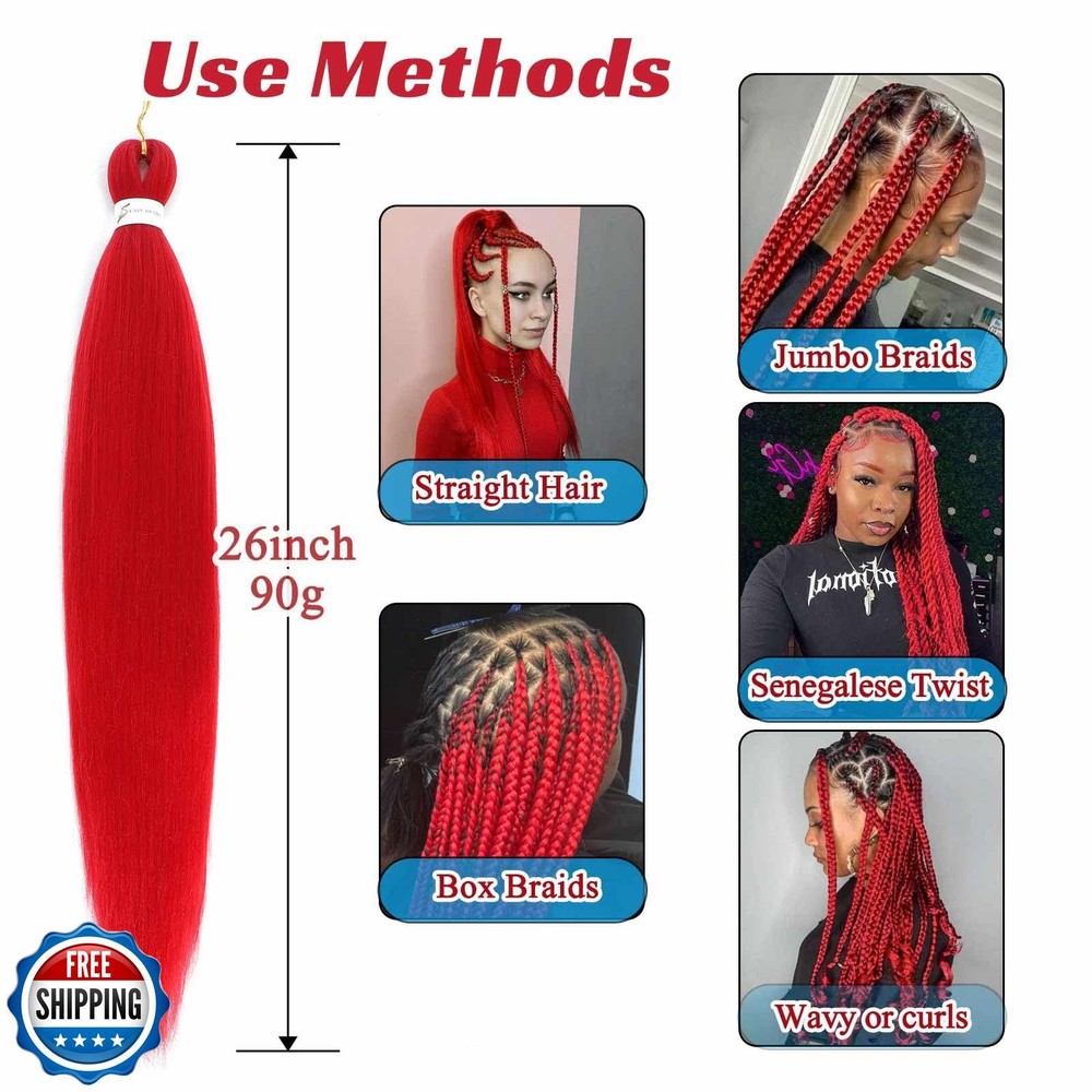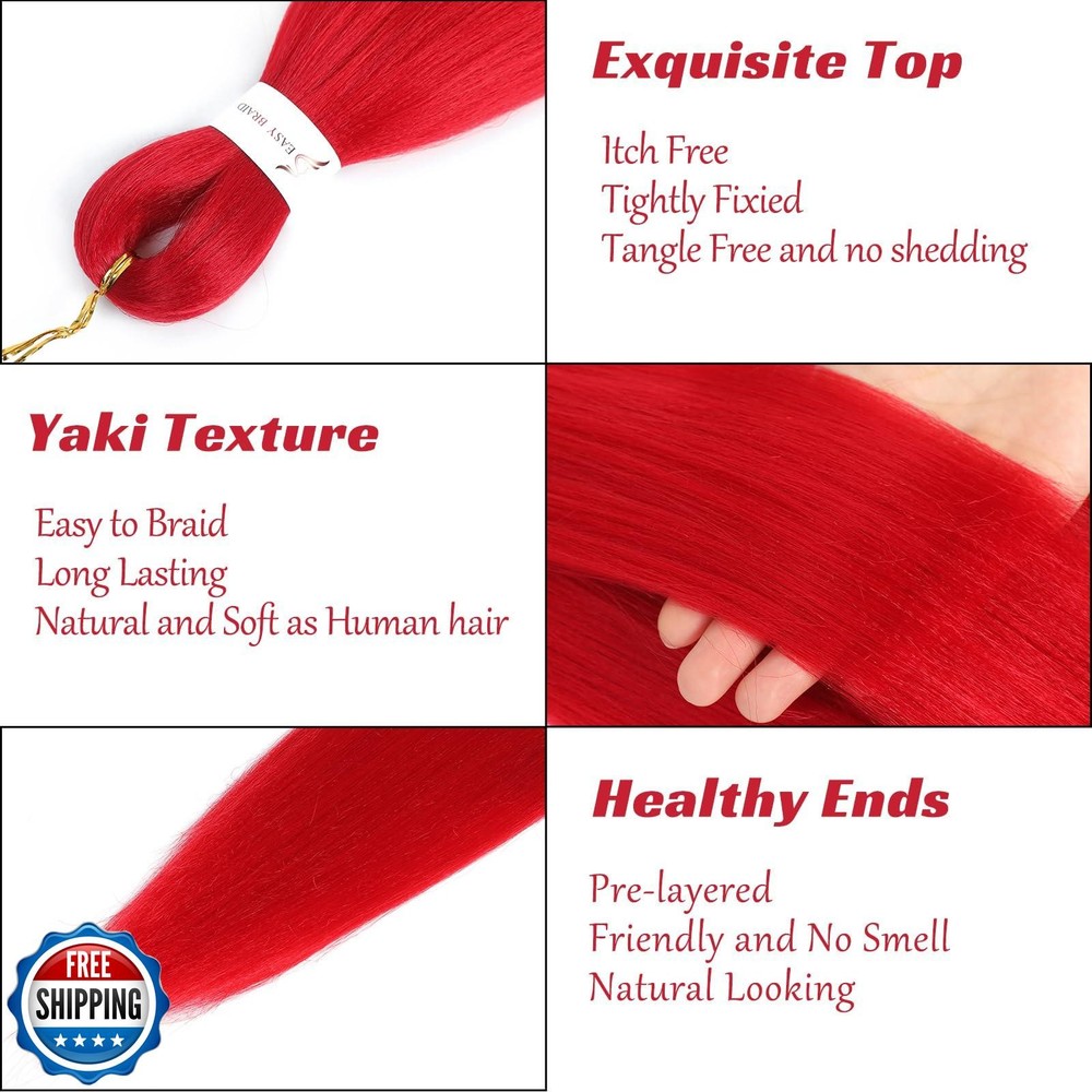 Royota Red Braiding Hair Pre Stretched Easy Hair Extension Yaki Synthetic Prestretched Soft Knotless Hair Box Crochet Twist Braiding (6pcs,Red,26inch) Features 【Hair Material】100% red Pre stretched braiding hair made with high quality Low Temperature synthetic fiber, creat a natural look. Super Soft and Skin Friendly, Feel Like Real Human Hair. 【Hair Quality】It's easily to change the braiding hair style in 75℃/85℃ hot water, you will get box braids, crochet hair, senefalese twist crochet etc.It's also easy to install and could be used as straight hair directly. 【Hair Details】For our prestretched braiding hair, folded length 26inch(equals to about 66cm),52inch when unfolded, about 90 gram/pack, 3packs/lot with free needle hook, usually 5-7 packs are enough for a full head. 【Suitable Occasion】This Easy braiding hair can make Box Braids, Crochet Braiding Hair, Senegalese Twist crochet, buns or ponytails you like, perfect for twists, braids and locs. 【Useage】Fits perfectly for Different Occasions, for Daily Use, Party, Date, Wedding, Festivals, Performance, etc. Shipping Free & Fast Shipping: We offer free shipping to most of the USA with a normal delivery time of 3-7 days. However, due to the current situation, additional delivery time (up to 3 weeks) may be required for some items. Alternative Carriers: We may use alternative carriers (e.g., USPS, FedEx, UPS) to ensure your package arrives safely and on time. Due to the use of multiple carriers, we are unable to provide a tracking number automatically. Handling Time: Orders are processed and shipped within 1-2 business days of receiving cleared payment. Shipping Restrictions: Shipping to Alaska, Hawaii, Puerto Rico, Guam, and other US territories may incur shipping charges or delivery restrictions. Please contact us before ordering, or your order can be refunded/cancelled. State Restrictions: Certain items may not be shipped to California due to state regulations. Contact for Tracking Updates: If you require tracking updates or have any concerns about the delivery of your order, please feel free to contact us, and we will be happy to assist you. Return Policy 30-Day Hassle-Free Returns: If you are not completely satisfied with your purchase, you can return the item for free within 30 days of receiving it for a full refund or exchange. Easy Return Process: Contact us, and we will provide you with a prepaid return shipping label and detailed instructions. No Restocking Fee: There are no restocking fees for returns. However, the buyer is responsible for return shipping costs if the return is not due to a seller"s error. Refund Processing: Refunds will be processed within 1 business day of receiving the returned item in its original condition. Feedback Your feedback is extremely important to us. We strive to provide the best products and customer service possible. If you are satisfied with your purchase, please take a moment to leave us a positive review. If you have any concerns or issues with your order, please contact us before leaving negative feedback. We are committed to resolving any problems and ensuring your satisfaction. Contact Us If you have any questions or concerns, please feel free to reach out to our customer support team. You can contact us through the eBay messaging system. We are available Monday to Friday, 9:00 am to 5:00 pm EST, and we will do our best to respond to your inquiry within 24 hours. Thank you for supporting our small family business!