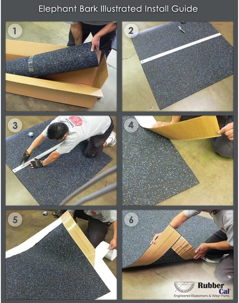 Rubber Cal Floor Mat Offers exceptional UV and water resistance, making them great outdoor floors for a balcony or a patio An ideal exercise floor that provides impact protection and vibration reduction for home and commercial gyms Rubber flooring mats with ultra easy DIY installation without the need for messy adhesive or expensive installers Green floor option that is available in 6 unique colors to conform to the aesthetics of any application; a great eco-friendly flooring option! Versatile recycled material ideal for garage mats, deck floor, cellar floor covering, flooring or concrete basement floors, flooring for a home gym, and even as dog kennel mats 's 3/16-inch thick Elephant Bark rubber flooring mats are hard-wearing, lightweight, and easy to install rubber runners. This flooring recycled from passenger car and commercial truck tires is an flooring option. It is made in the America from US tires that otherwise would end up in landfills. US tires that are discarded are shredded and molded into shape to form what is an affordable and durable flooring product. with its superior protection against UV and ozone, it can be used as outdoor floors for a concrete patio or deck floor covering for a slippery pool area. These rubber flooring mats also contain ozone-resistant EPDM which helps reinforce the resilient nature of this product. The durable and cost-conscious nature of these rubber runners makes them perfect as garage mats, cellar floor covering, flooring or concrete basement floors, and even as dog kennel mats. The 3/16" or 3./16-inch Elephant Bark is not only a green floor option for the environmental consumer, but offers impact resistance and anti-slip qualities that any exercise floor can benefit from. This product was designed to endure abrasive conditions, while still protecting the underlying surface from heavy machinery or weights. This is the ideal flooring for a home gym Among the most appealing aspects of this product is the ease of installation. Simply lay the material down in the designated area and use a double sided adhesive tape to ensure that the flooring will stay firmly to the ground. In addition to the easy of installation, the availability of varied lengths minimizes waste and makes for an overall affordable DIY project. From the Manufacturer 's 3/16-inch thick "Elephant Bark" rubber flooring mats are hard-wearing, lightweight, and easy to install rubber mats. This flooring is recycled from passenger car and commercial truck tires that otherwise would end up in landfills. The discarded tires are shredded and molded to form an affordable, durable flooring. It can be used as outdoor floors for concrete patios or a deck floor covering for a slippery pool area. These rubber flooring mats also contain ozone-resistant EPDM which reinforces the resilient nature of this product. The durable and cost-conscious nature of these rubber mats makes them perfect as garage mats, cellar floor covering, concrete basement floor covering, and even dog kennel mats. The 3/16-inch "Elephant Bark" offers impact resistance and anti-slip qualities that any exercise floor can benefit from. This product was designed to endure abrasive conditions, while still protecting the underlying surface. One of the most appealing aspects of this product is the ease of installation. Simply lay the material down in the designated area and use a double-sided adhesive tape to ensure that the flooring stays firm to the ground. In addition, the availability of varied lengths minimizes waste and makes for an overall affordable DIY project.