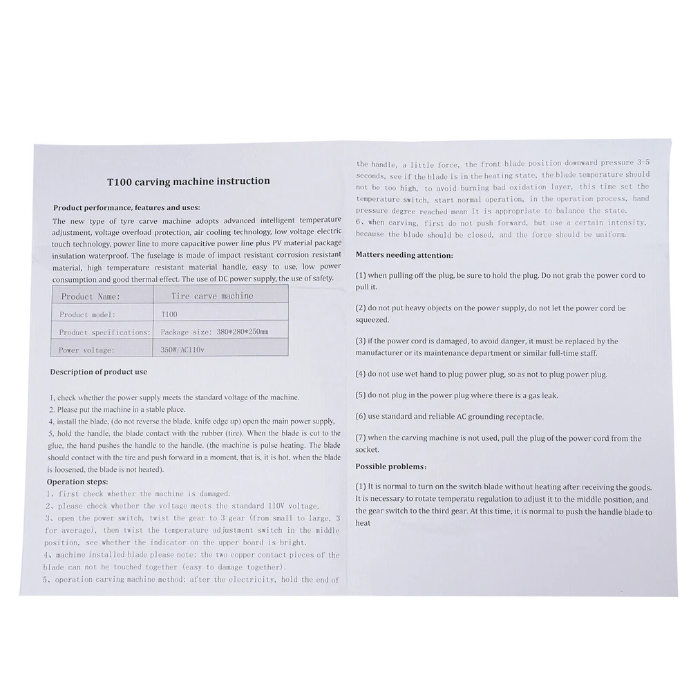 Specifications: Input Power: 110V/60Hz Maximum power: 400W Host specification: 230×100×102mm (9"×3.94"×4") Tool holder handle: 200×38mm (7.8"×1.5") Movement mode: manual Blade specifications: 2-10mm Gross weight: 6KG Package size: 38×28×25cm Package Content: 1 × Tire Groover Machine Rubber Tire Groover Auto Regroover Car Truck Tire Grooving Tool 400 W 110 V Performance Characteristics: The control box of this machine adopts an advanced microcomputer temperature control system, and the body adopts anti-impact and corrosion-resistant materials, which is convenient to use, low power consumption and good thermal effect. Use 24v DC power supply, safe to use. After setting the temperature, the machine keeps the temperature at the required temperature. Engraving pattern : can be: U-shaped, V-shaped, etc. Suitable for: deepening the tread pattern, retreading old tires, etc. Carving pattern specifications: width 3-20mm, depth 7-16mm, with blade heating system, making rubber cutting easy and free. Specifications: Input Power: 110V/60Hz Maximum power: 400W Host specification: 230×100×102mm (9"×3.94"×4") Tool holder handle: 200×38mm (7.8"×1.5") Movement mode: manual Blade specifications: 2-10mm Gross weight: 6KG Package size: 38×28×25cm Package Content: 1 × Tire Groover Machine Payment Delivery details Terms of sales About us Contact us Payment We accept ebay payment 。 Fees such as import duties, taxes are not included in the item price or shipping costs. These charges are the buyer's responsibility. Delivery details Shipping: 2-9 working days to: USA Terms of sales We maintain high standards of excellence and strive for hundred percent customer satisfaction. Feedback is very important to us. We hope that you contact us immediately before you give neutral or negative feedback, so that we can address your concerns. It is impossible to address issues if we do not know about them! About us Your satis faction is our ultimate goal. We work hard to earn your trust and future business. Our certified technicians have tested each item before shipping. The unit comes with 1 year limited warranty on all manufacturing defects. a) If you receive a defective item, you may return it or ask for a discount. Please contact us within 14 days after you receive the package. b) What you returned must be intact and in its original packaging as re? u. Customer is responsible for shipping costs of the returned item. c) We will cover the cost of shipping back t with the shipping rate indicated in the registration page. We will send you a new unit or refund the full payment you paid. Thank you. Contact us Business Hour Business Hour: Monday To Friday: 8:30 AM to 5:00 PM (Beijing China time) Due to time zones, our reply to your questions may not be immediately. But within above working time, we will reply your email within 24 hours. If it's non-workdays, please kindly be patient and wait till Monday. Please contact us with ebay message. Please feel free to contact us if you have any questions. Monday To Friday: 8:30 AM to 5:00 PM (Beijing China time) Due to time zones, our reply to your questions may not be immediately. But within above working time, we will reply your email within 24 hours. If it's non-workdays, please kindly be patient and wait till Monday. Please contact us with ebay message. Please feel free to contact us if you have any questions. On Jan 14, 2025 at 20:08:26 PST, seller added the following information: