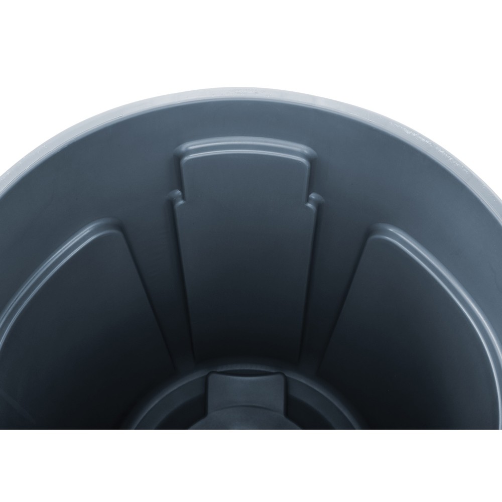 This gray 32 gallon container without lid features the renowned durability of the BRUTE™ line with all‐plastic professional‐grade construction that will not rust chip peel and resists dents. It has reinforced rims for added strength built‐in handles that make carrying easy and prevent jamming when nesting and a double‐ribbed base that increases stability and dragging capacity. No container is more versatile. Model #: 2632 Professional‐Strength Construction Seamless Design Innovative Venting Channels Make Lifting Liners up to 50% Easier Integrated Cinches Secure the Liner All‐Plastic Construction Will Not Rust Chip or Peel Dent‐Resistant Reinforced Rims and Base Molded‐In Handles Double Ribbed Base UV Resistant Stackable Assists In Complying with HACCP Guidelines Guaranteed to Never Fade Warp Crack or Crush Use with FG263100 lid * Large item may incur additional shipping charges