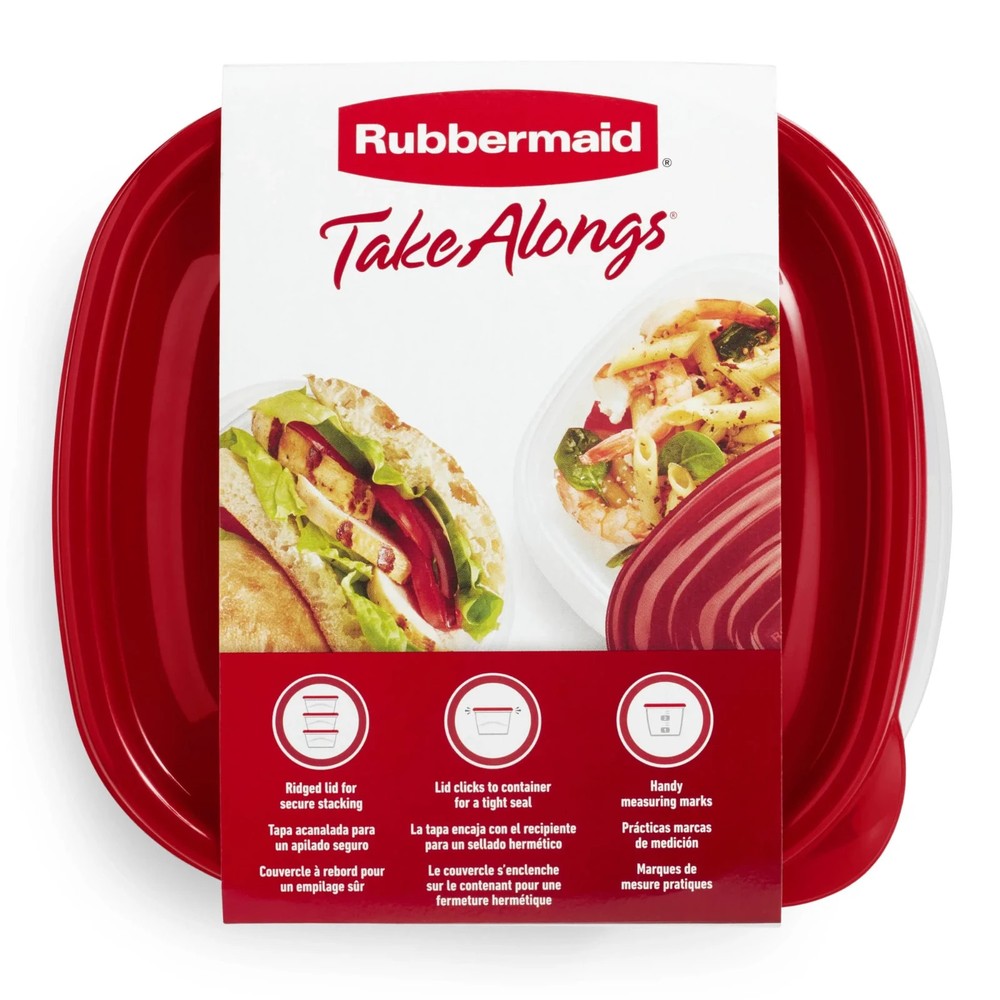 Store, organize and pack a variety of foods with this 20-piece set of Rubbermaid TakeAlongs Food Storage Containers. The sizes make them ideal as meal-prep containers, and they're great for snacks, pantry, and leftover storage, too. The snap of the QuikClik Seal lids helps you know they're closed tight, and graduation marks are great for portion control. These stackable BPA-free containers are freezer and top-rack dishwasher safe and have microwave-safe bases safe for reheating. This convenient set includes five 2.9 cup containers and five 5.2 cup containers, plus lids. Rubbermaid TakeAlongs Food Storage Containers, 10 Piece Set, Red Five 5.2-cup deep square containers Five 2.9-cup square containers QuikClik Seal ensures lid is locked in place Rubbermaid food storage container set is microwave, freezer, and dishwasher safe QuikClik Seal containers seal tight and stack for easy transport Freezer- and top-rack dishwasher-safe; microwavable base BPA Free