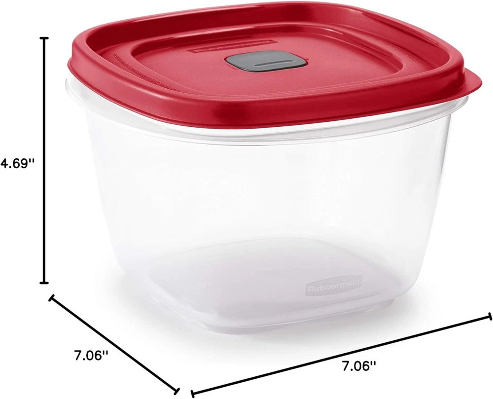 Food storage containers feature EasyFindLids that snap on to container bases as well as same-size lids, so you can always find lids when you need them Plastic food containers lids with vents to help prevent moisture buildup and allow you to microwave splatter-free with the lid on Containers nest easily for compact storage, so your cabinets stay organized Thick, durable container walls for everyday use BPA free, and built to withstand a wide range of temperatures, so they're top-rack dishwasher safe, microwave safe for reheating only with the lid vents open, and freezer safe Great meal prep containers Includes one 7-cup food storage container and lid These Rubbermaid food storage containers feature vented tops for splatter-proof microwaving with the lid on and less moisture buildup. The EasyFindLids snap to container bases as well as same-size lids, so you can always find lids when you need them, plus the containers nest together for compact storage. These versatile containers are great for leftovers, meal prep, and more, and have thick, durable walls for everyday use. They're BPA-free, and are built to withstand a wide range of temperatures, so they're top-rack dishwasher safe, microwave safe for reheating with the vent open, and freezer safe.
