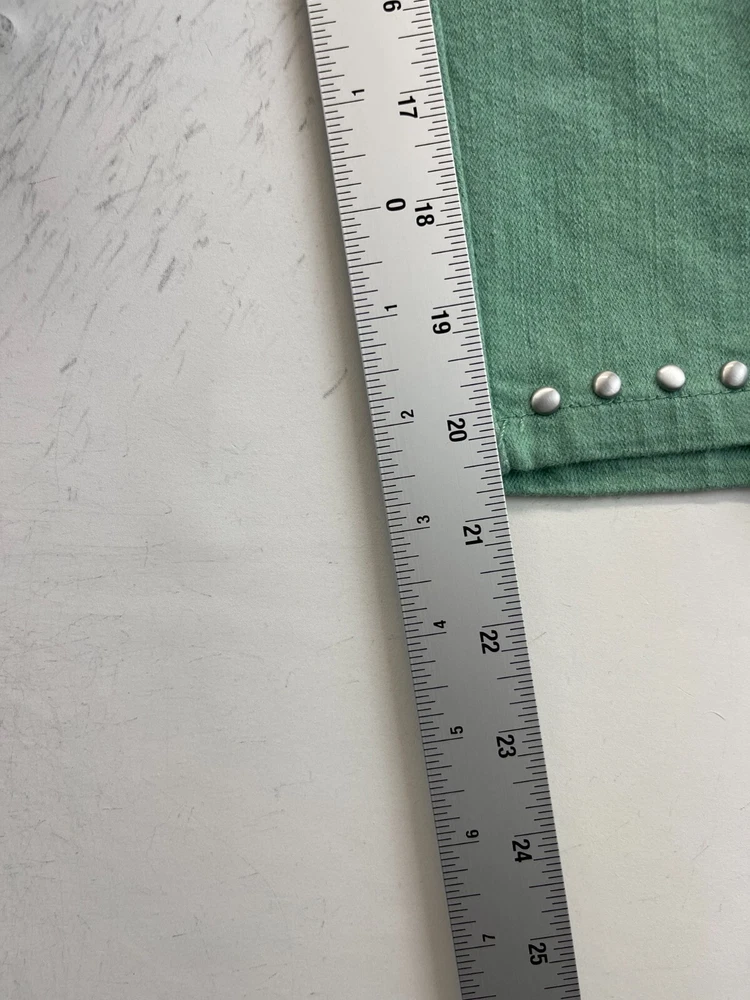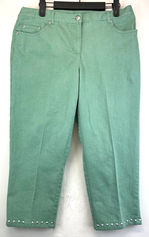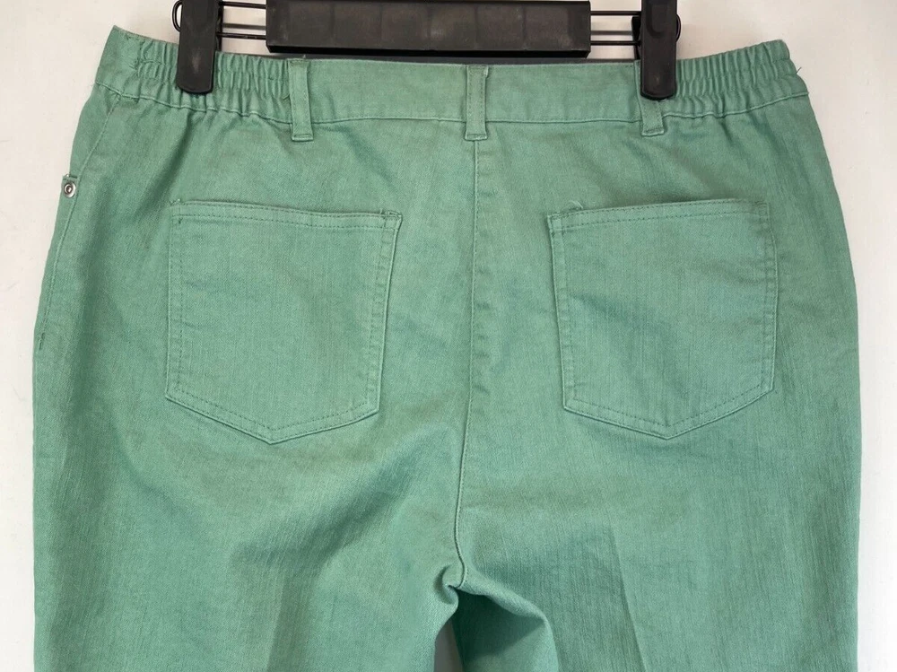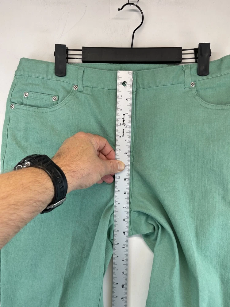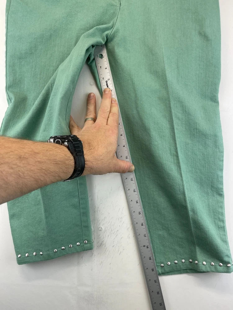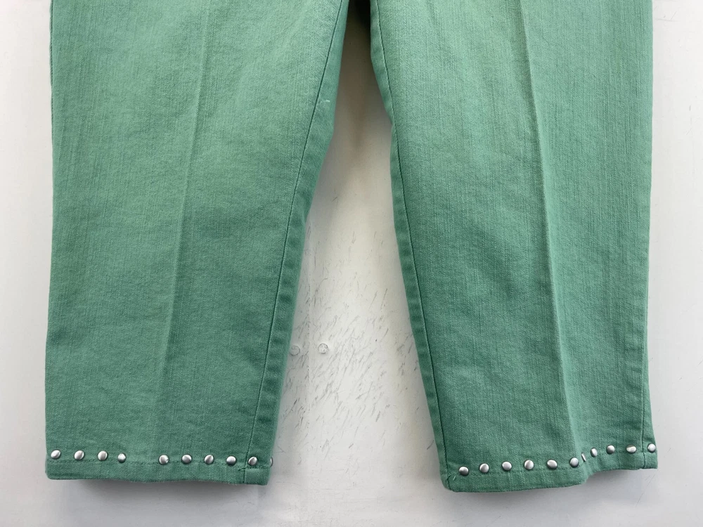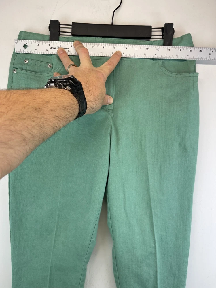 Elevate your wardrobe with these stunning Ruby Rd. Petite Capri Pants. Perfect for any occasion, whether it be for travel, workwear, or casual wear, these pants come in a beautiful green color and are made of a comfortable blend of polyester, spandex, and cotton. The pants feature an elastic waistband and pockets for added convenience, while the studded accents give them a touch of bohemian flair. The mid-rise fit and straight leg style make these pants flattering for any body type, and they are available in a Women's Size 12P. These pants are machine washable and have a flat front, making them easy to care for and perfect for everyday wear. Add these fun and preppy pants to your collection today! Very good preowned condition with normal preowned wear and issues. Please see all photos. For clothing specifically, see photos for all measurements and/or any issues if applicable. Pay close attention to the measurements as the size of the garment may quite possibly be different than the actual measurement(s) due to washing, shrinkage, or stretching as these are used clothes. The size in the title is the size on the tag of the garment. See photos for measurements of actual measurements as they may differ. ALWAYS CHECK THE MEASUREMENTS IN THE PHOTOS. This will remove any questions on measurements as well as always cover the possibility of human error in the listing(s) in the case of a typo or oversight. All clothing and shoes have been washed/cleaned, and comes from a smoke free environment. If shoe trees appear in the photos, they are for photography purposes only to illustrate how the shoes look filled out, and are not included. I am available for questions. I accept or negotiate reasonable offers. Have an amazing day. Thank you.