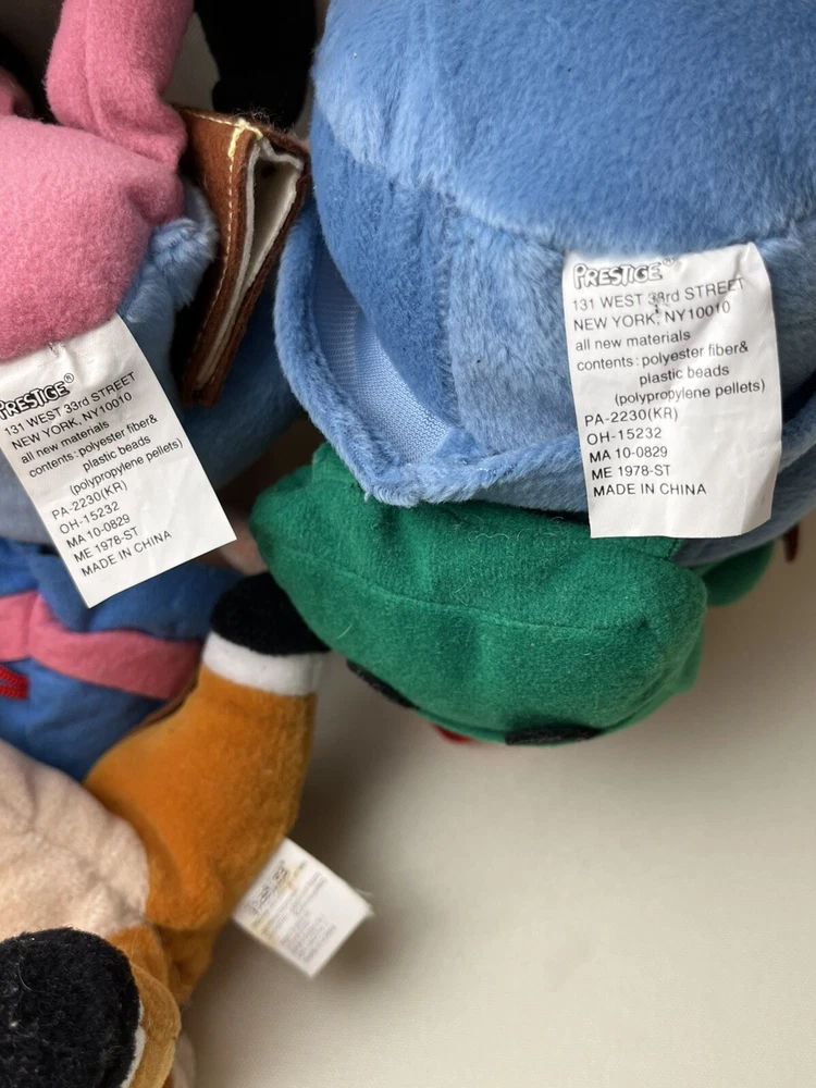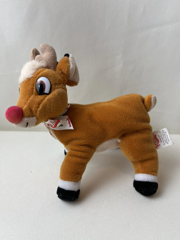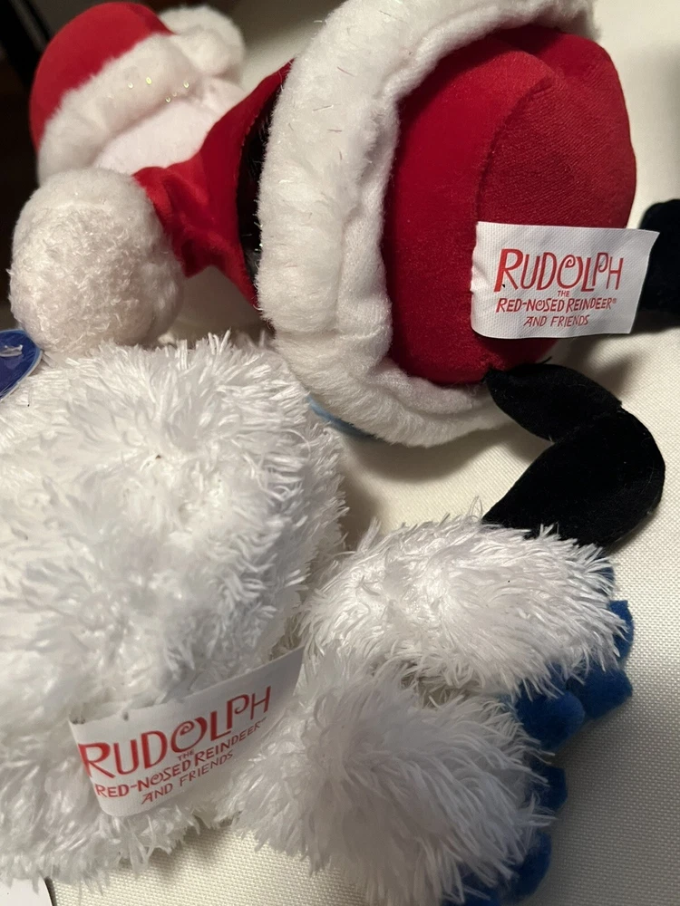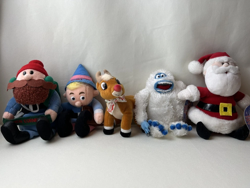 This is a lot of 5 Rudolph the Red-Nosed Reindeer movie plush toys featuring characters - Hermey, Rudolph, Yukon Cornelius, Santa & Abominable Snow Monster. These plush toys were manufactured between 2000-2005 and are made of mixed materials including polyester, felt, and cloth. Santa & Abominable Snow Monster were manufactured in 2005 by Commonwealth Toy & Novelty Co., NWT. Yukon, Rudolph & Hermey were manufactured in 2000 by Prestige, pre-owned.They are colorful and perfect for Christmas decorations or as collectibles.