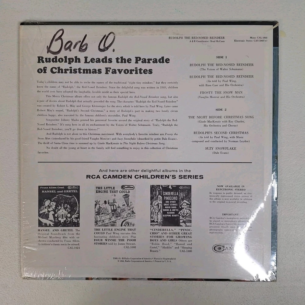 Case Type:Cardboard SleeveSpeed:33 RPMRecord Grading:Very Good Plus (VG+)Record Size:12"Style:ChristmasSleeve Grading:Very Good Plus (VG+)Genre:HolidayRecord Label:CamdenArtist:VariousMaterial:VinylType:LPRelease Title:Rudolph the RED-Nosed ReindeerInlay Condition:Very Good Plus (VG+)Seller Notes:“Plays Well shrink still on jacket”Format:RecordRelease Year:1965