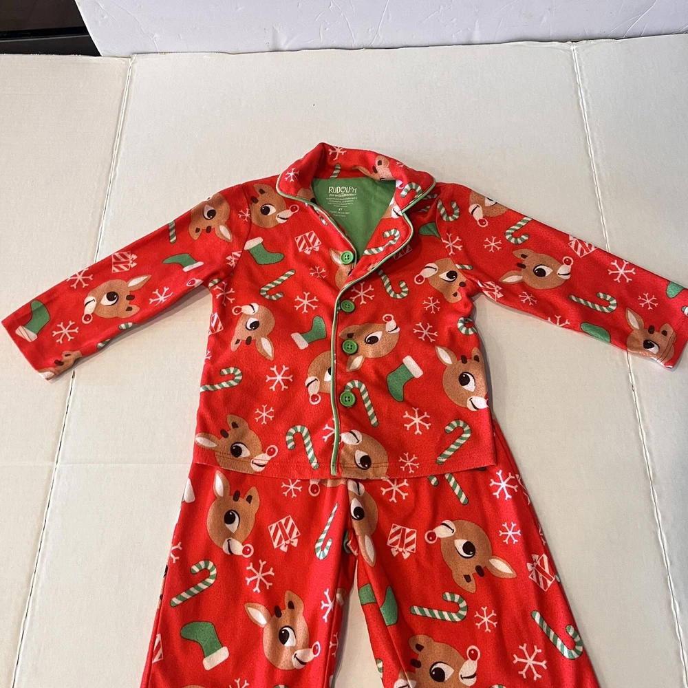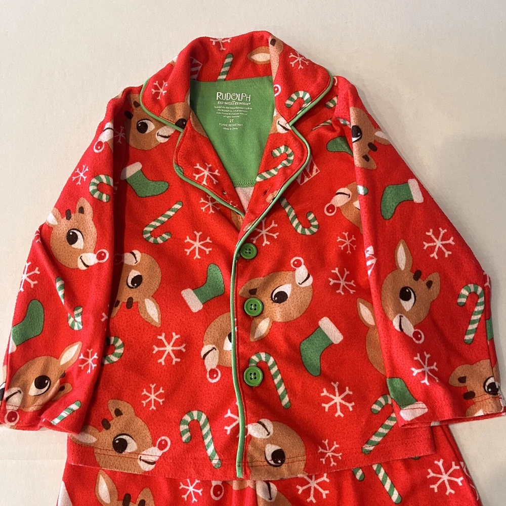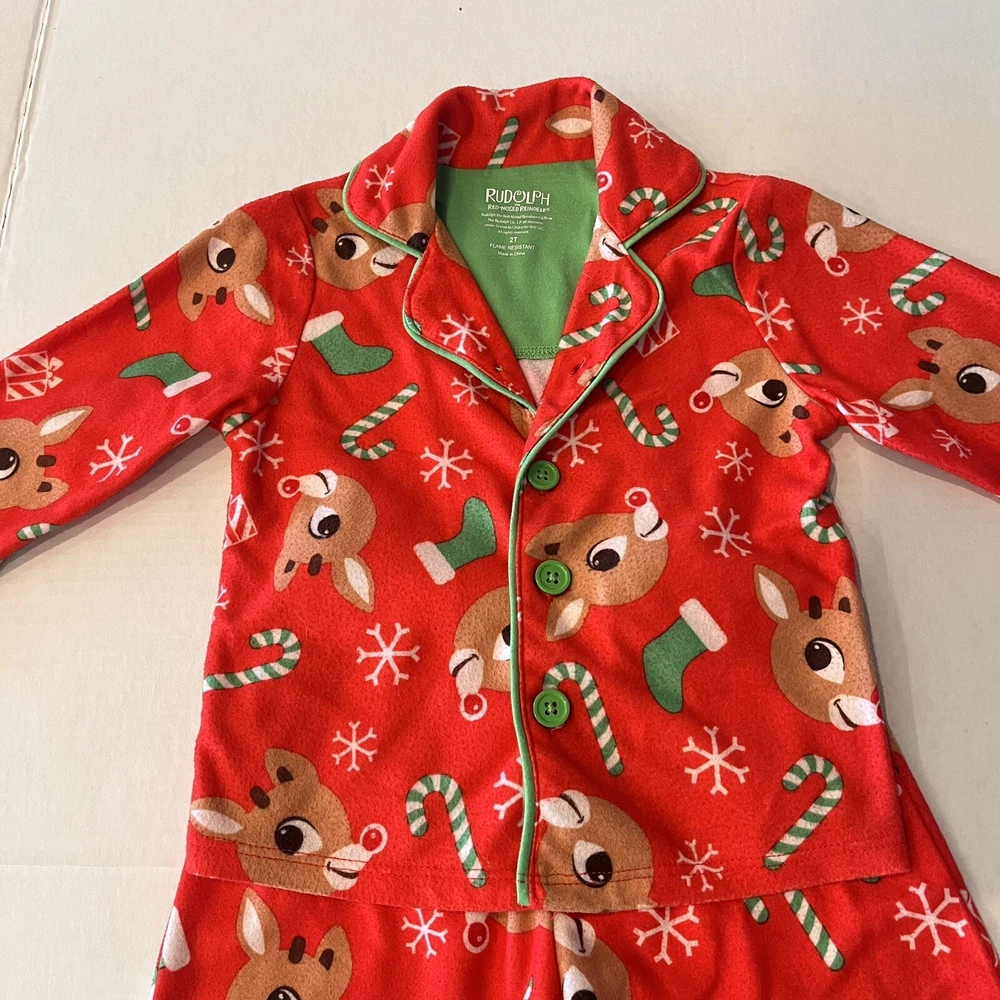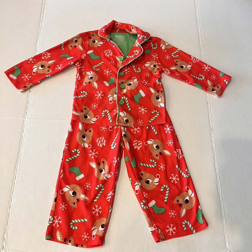 Get your little one ready for the holiday season with this adorable Rudolph the Red Nosed Reindeer pajama set. The set includes a cozy flannel print top and matching pants, both featuring the beloved character and his iconic red nose. Made from soft polyester fabric, this pajama set is perfect for keeping your child warm and comfortable during the chilly winter nights. The set is designed for kids in size 2T and features a festive Christmas theme that is perfect for the holiday season. Whether you're looking for a comfortable and cozy pajama set for your child or simply want to add to your collection of Rudolph the Red Nosed Reindeer merchandise, this pajama set is a must-have. Please see photos for any wear and condition as this is a used item. From a smoke free environment. Item shown is the exact item you will receive. T5