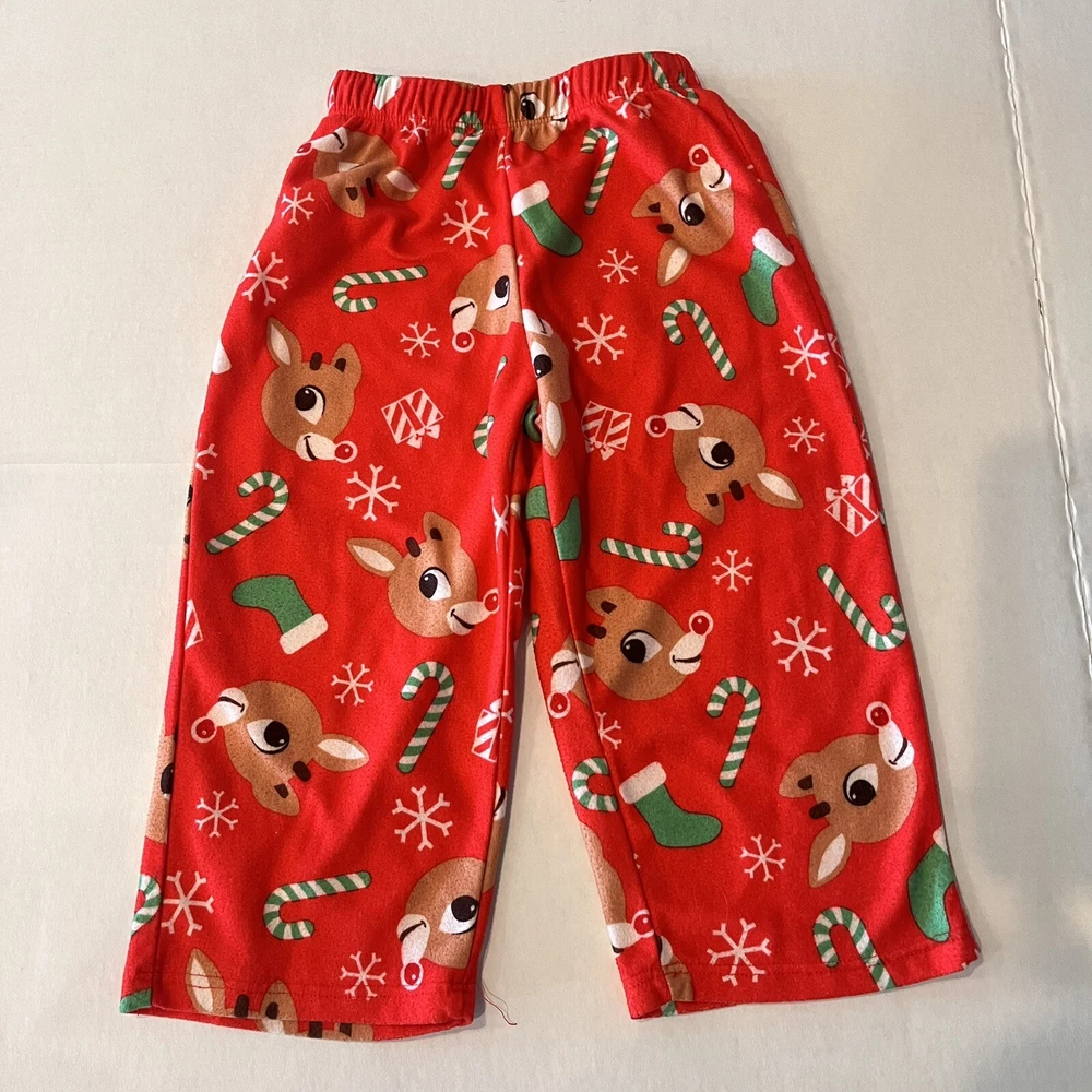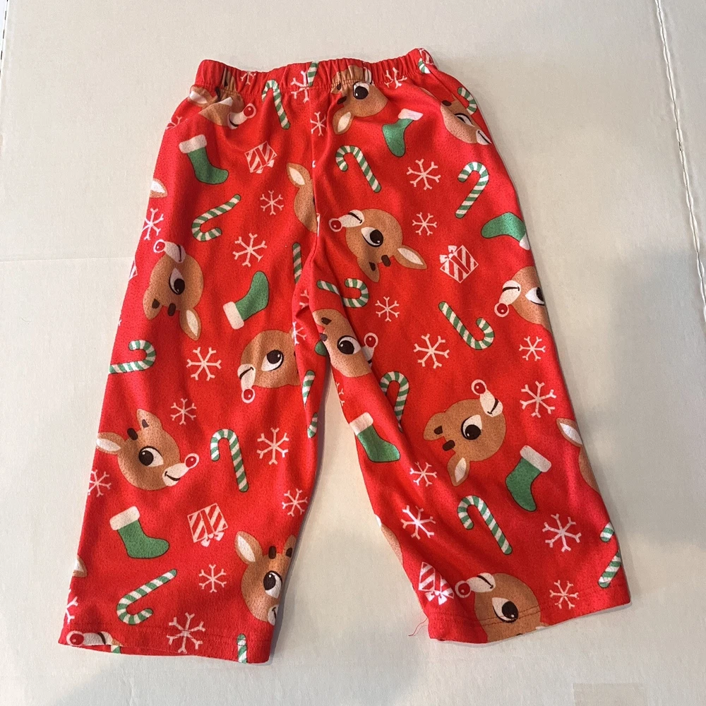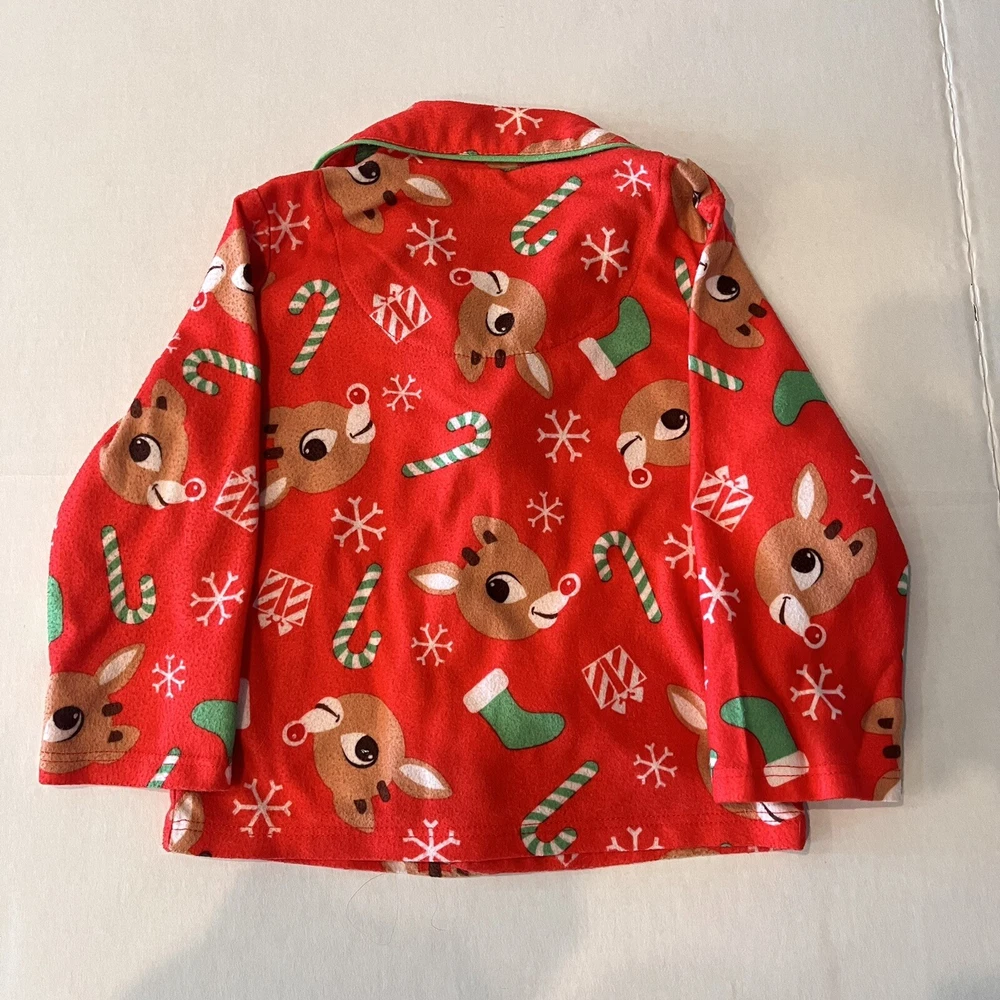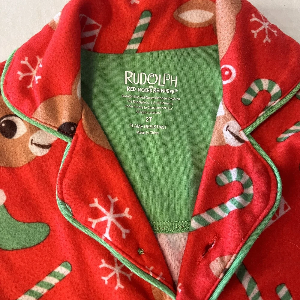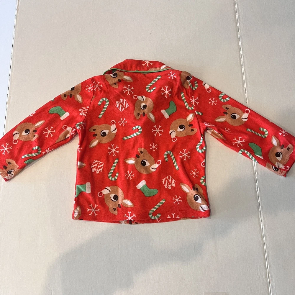 Get your little one ready for the holiday season with this adorable Rudolph the Red Nosed Reindeer pajama set. The set includes a cozy flannel print top and matching pants, both featuring the beloved character and his iconic red nose. Made from soft polyester fabric, this pajama set is perfect for keeping your child warm and comfortable during the chilly winter nights. The set is designed for kids in size 2T and features a festive Christmas theme that is perfect for the holiday season. Whether you're looking for a comfortable and cozy pajama set for your child or simply want to add to your collection of Rudolph the Red Nosed Reindeer merchandise, this pajama set is a must-have. Please see photos for any wear and condition as this is a used item. From a smoke free environment. Item shown is the exact item you will receive. T5