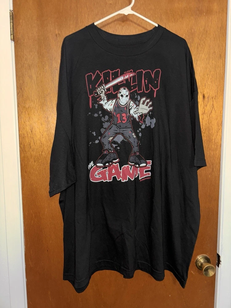Get ready to slay the game with this Ruffneck Jason Friday The 13th Retro 13s T-Shirt. This black cotton shirt features a crew neck and short sleeves, perfect for any casual occasion. The shirt is machine washable for easy care and maintenance. The shirt's design features the iconic Jason Voorhees from the classic movie series, Friday the 13th. The shirt is available in size 4XL and is a regular fit for men. This T-shirt is a must-have for any fan of the horror genre and the Retro 13s theme.