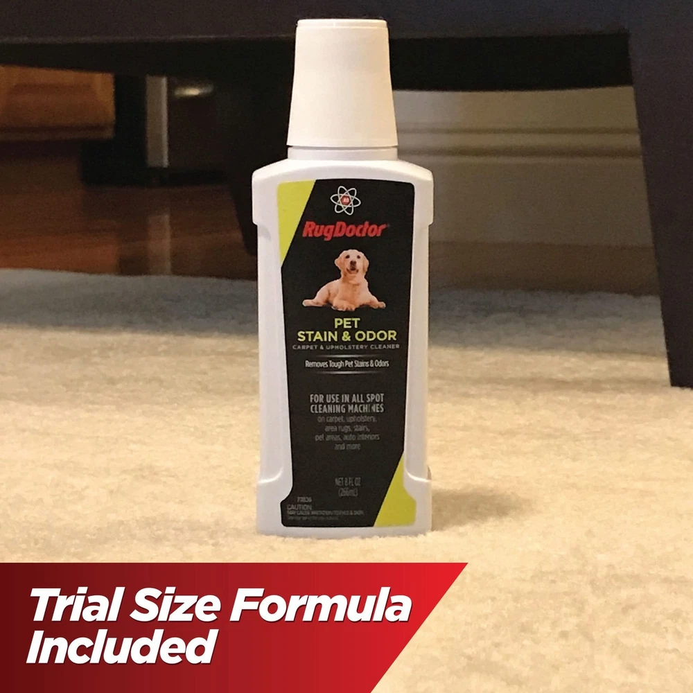 Rug Doctor Pet Portable Spot Cleaner Model PSC-2 Carpet Cleaner The Rug Doctor Pet Portable Spot Cleaner Model PSC-2 is a compact and lightweight carpet cleaner designed for residential use. With a corded power source and 120v voltage, it offers a 12-inch cleaning path width and utilizes bagless filters for easy maintenance. This handheld spot cleaner comes in a vibrant red color and includes a brushless brush tool, making it convenient for quick clean-ups and spot removal on carpets. The portable design, along with its included cleaning solution, makes it a practical choice for keeping your carpets fresh and clean. Please review the photos. The left reservoir has a minor dent, however, the cleaner works fine.