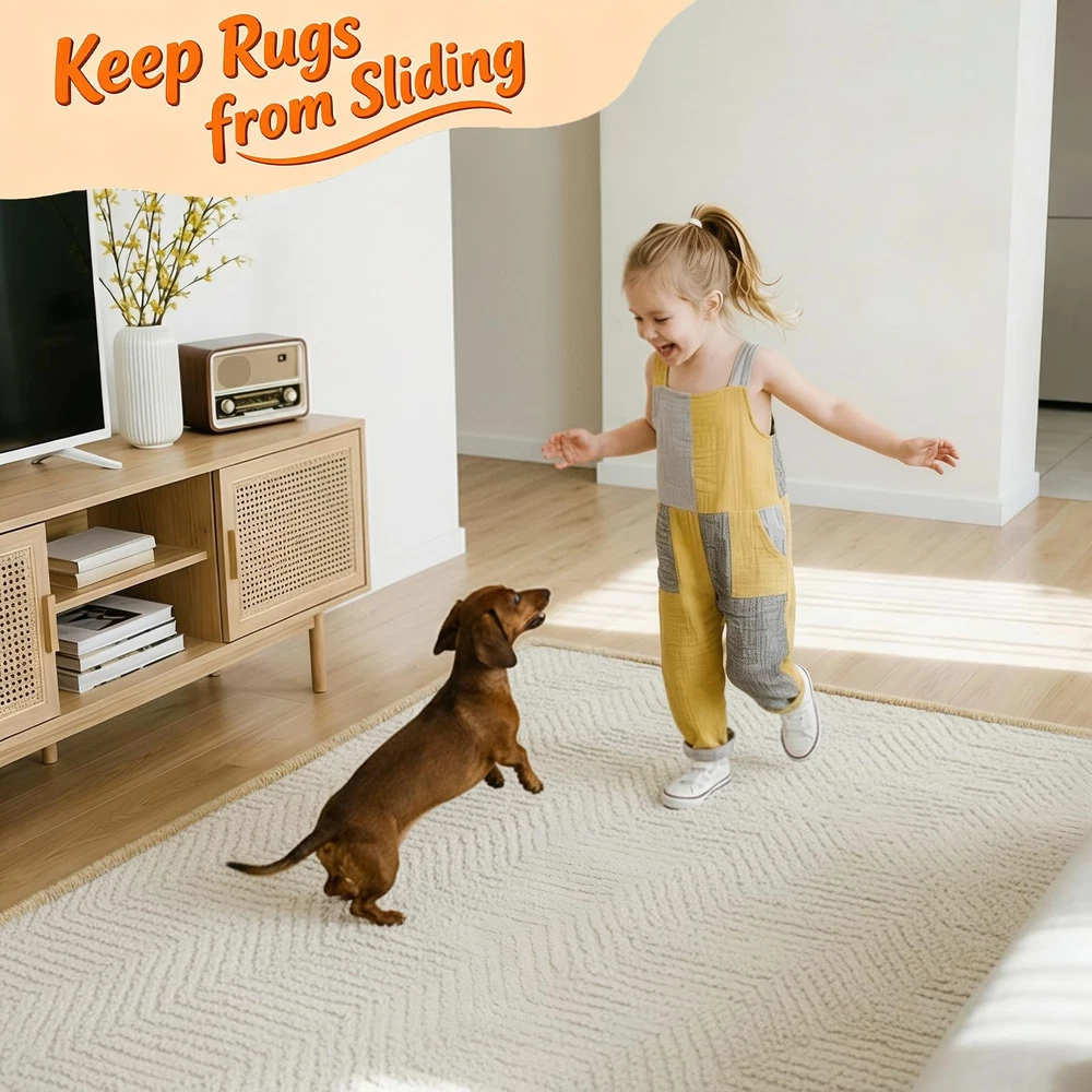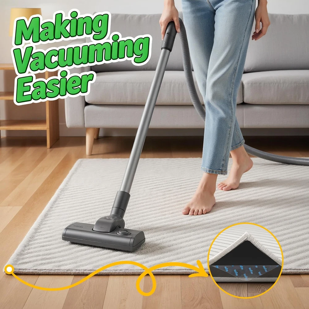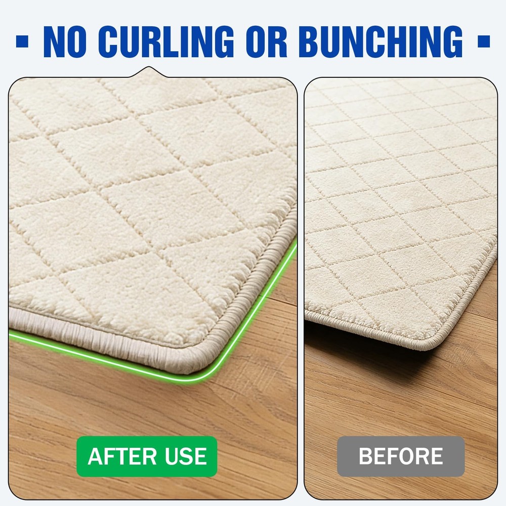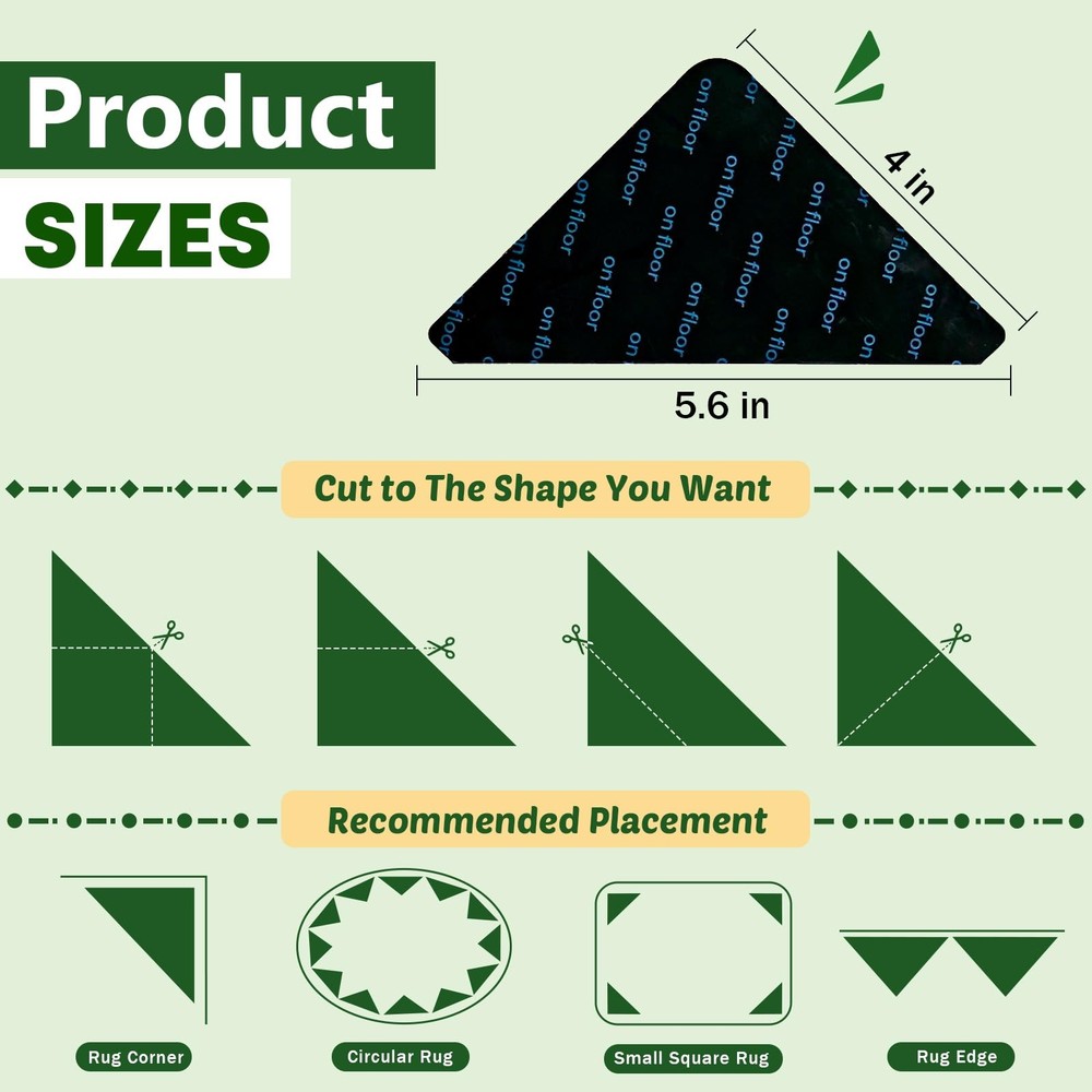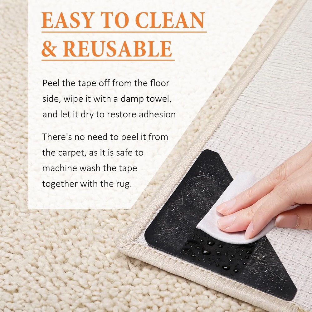 Say Goodbye to Slipping and Wrinkled Rugs! Carpet Grip Tape is the ideal solution for keeping your rugs securely in place. Featuring unique "Carpet-to-Floor" technology, it provides a strong hold that effectively prevents rugs from sliding on smooth surfaces and eliminates dangerous curled corners—instantly creating a safer, neater, and more aesthetically pleasing space. This ultra-thin and discreet tape works reliably in most home environments. Your complete satisfaction is our commitment, order now to enjoy a tidy and worry-home! TRIANGLE DESIGN FOR MAXIMUM GRIP: These rug corner grippers feature a triangular shape that conforms snugly to rug corners and edges, which maximizes adhesive for a superior hold. They can also be trimmed to fit irregular edges or custom shapes. NON-SLIP & ANTI-CURL: The rug tape effectively prevents rugs from sliding, shifting, or corner curling. It keeps your rugs lying flat and secure, even in high-traffic areas. REUSABLE: The carpet tape's adhesive can be restored after cleaning it with a damp cloth or washing it with the carpet; just let it dry afterward. (Tip: Only peel off the floor side while keeping the carpet side attached to prevent damage to the carpet.) EASY INSTALLATION: Equipped with dual-sided adhesive tabs labeled for clarity—apply the “on rug” side to your rug bottom and the “on floor” side to your floor, then press firmly to secure a strong bond. Always start with clean, dry surfaces. COMPATIBILITY NOTES: Ideal for use on most hard floors. Not recommended for rugs with fluff, jute, or backing, and should not be used to secure rugs over carpeted surfaces.