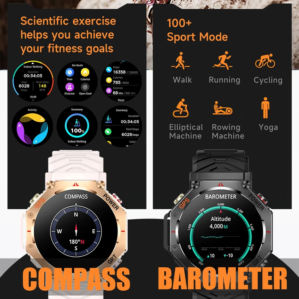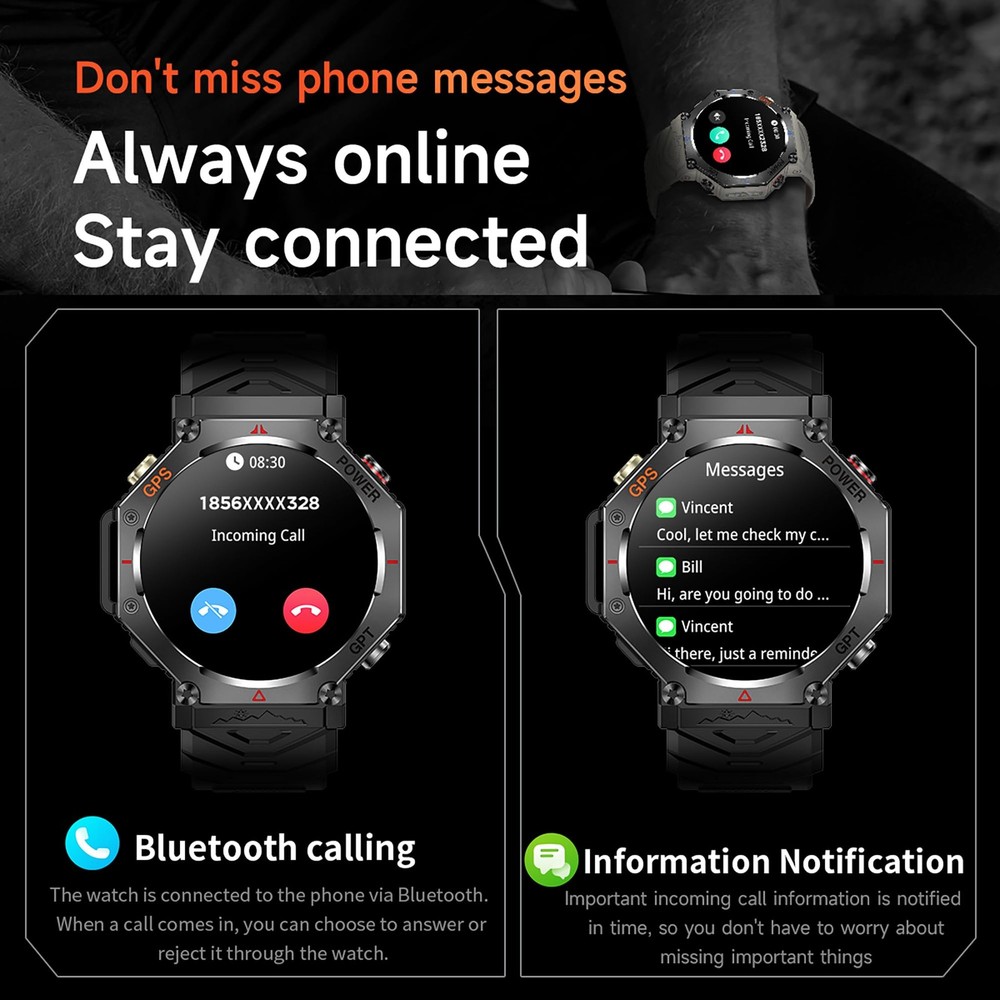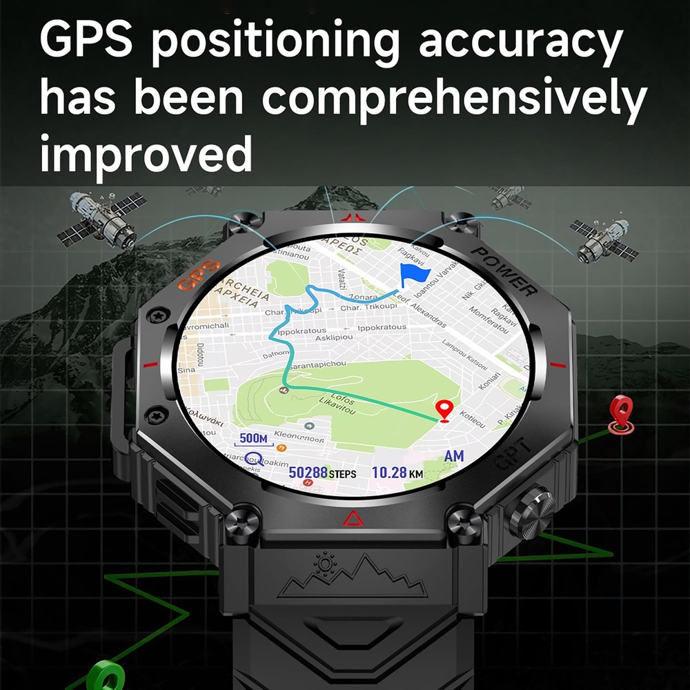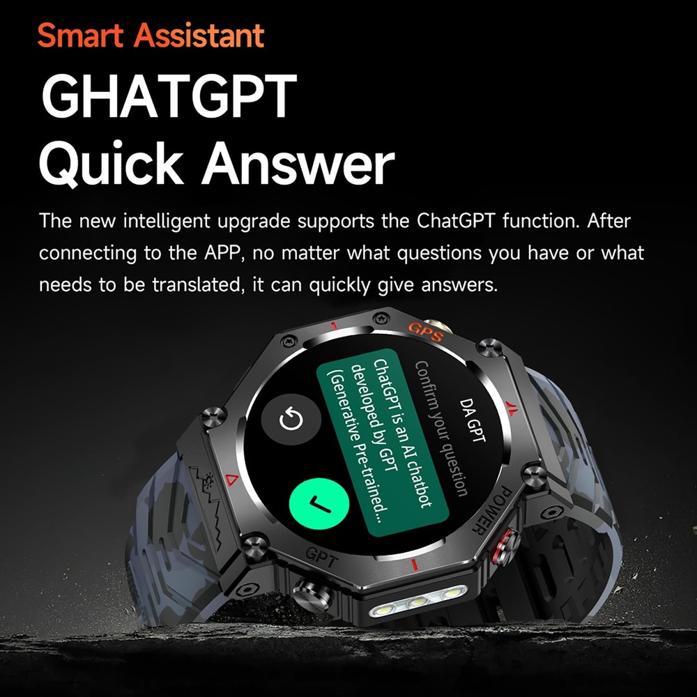 *Outdoor tactical smart watch compatible with Android phones and iOS phones,convenient your life. *MULTIFUNCTION: - GPS Function - Flashlight - AI Watch Face/GPT - Altimeter - Barometer - Compass - Heart Rate Monitor - Pedometer:steps,calories,distance - Bluetooth Call - Multi-Sports Modes - Notification Push - Sleep Monitor - Calculate *HARDWARE: Screen Size:1.39-inch TFT full color screen,resolution:360*360 Dual Bluetooth:Bluetooth 5.3 Battery:530mAh APP Name:DaFit Operate Type:Full Touch Screen Full Charge Time:About 2H Standby Time:One full charge gives you(5-7 days of working time),standby time up to 90 days *REQUIRES: Device Supported Languages:English,French,Italian,Spanish,Arabic,German,Polish,Portuguese,Malay,Czech,Turkish,Russian,Greek,Persia,Czekh,Hebrew IOS 9.0 or above,Android 5.0 or above *SPECIFICATION: Case Material:Zinc Alloy Band Material:Silicone Clasp Type:Buckle Dial Case Diameter:46mm(1.81") Dial Case Thickness:12.6mm (0.49") Band Length:256mm(10.08") *NOTES: - Waterproof:IP67 Waterproof - DO NOT suitable for hot water bathing,diving,swimming,water-related work. *WHAT'S IN THE BOX? - 1*Watch - 1*Watch Box - 1*User Manual - 1*Charging line *Any questions,please kindly contact us,we would always offer best solution to you. GPS Smart Watch : The GPS positioning accuracy ensures you're always on track, it also support altimeter,barometer,compass,etc.Whether you're hiking, running, or simply navigating a new city. Track your steps, distance, and location with precision Smart Assistant on Your Wrist : Get instant answers and translations with the power of AI right on your wrist. Simply connect to the app and ask away! This intelligent assistant is ready to help you with any question, making your life easier and more efficient Flashlight Function : This rugged smartwatch features a powerful flashlight, perfect for outdoor activities or simply navigating in low-light conditions.Light up your path wherever you go Stay Connected : Don't miss important calls or messages! This smartwatch allows you to answer or reject calls directly from your wrist via Bluetooth, and receive real-time notifications for texts and other alerts. Stay connected without constantly checking your phone Track Your Fitness Journey with 100+ Sport Modes : This smartwatch offers over 100 sport modes to accurately track your workouts, from walking and running to cycling and yoga.Set goals, and stay motivated on your path to a healthier you