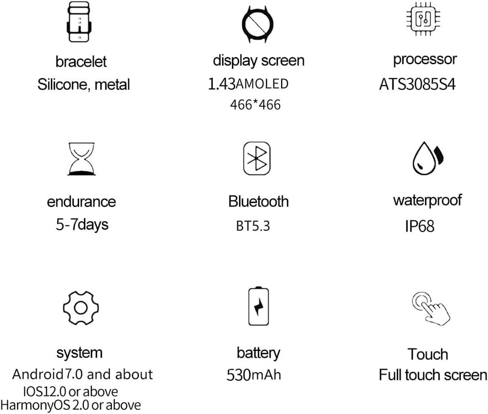 Rugged GPS Smartwatch for Men with 1.43" AMOLED Always-On Display Experience precision and durability with this rugged GPS smartwatch designed for men who love adventure and fitness. Key Features: 1.43" AMOLED Display: Vivid 466×466 resolution with always-on mode for clear visibility anytime. Built-in GPS & Outdoor Sensors: UC6228CI GPS, compass (QMC6308), altimeter, and barometer for accurate navigation and environment tracking. Bluetooth 5.3 Calling & Voice Control: Make and answer calls directly on your wrist. Hands-free voice assistant support. Offline Alipay Payment: Seamless payments without phone connectivity. Advanced Health Monitoring: Real-time heart rate, SpO2, blood pressure, sleep, stress monitoring, plus breathing exercises and sedentary alerts. Durable & Waterproof: IP68 rating protects against water, sweat, and dust for all weather conditions. Long Battery Life: 530mAh battery offers 5–7 days use, up to 30 days standby, with magnetic charging cable included. Multi-Language Support: Supports 20+ languages including English, Spanish, German, and more. Additional Functions: Music control, step counting, calories tracking, weather forecast, custom dials, world clock, calculator, message push, stress test, breathing training, and more. This rugged smartwatch combines robust outdoor features with comprehensive health tracking to keep you connected and informed on every journey.