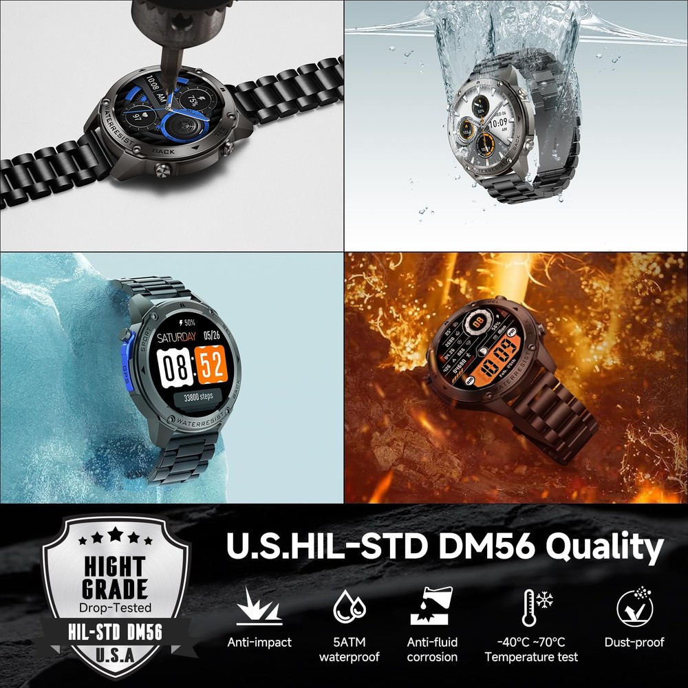 1* Smart Watch 1*Changer 1* Usual Manual 1* Silicone Watch Band 1* Stainless Steel Watch Band。 BUILT-IN GPS & 6 SATELLITE POSITIONING SYSTEMS - DM56 smart watches for men Built-in GPS, The military-grade dual-band and 6-satellite system allows fast positioning in (8-45 seconds), 2-3 times faster than normal single-band 4 satellite positioning smartwatches, The tracker watch also includes an internal compass, altitude pressurization, and altimeter sensors that show your current position, altitude, and air pressure. MILITARY GRADE STANDARD (MIL-STD-DM56) STAINLESS STEEL BODY - The DM56 smartwatch features Panda King glass screen with a Mohs hardness of up to 9H, strong enough to withstand various screen-damaging behaviors. The military-grade stainless steel material makes it indestructible and highly durable. It has successfully passed 15 military standard tests (MIL-STD-DM56), including salt spray, rain, impact, and more, making it capable of easily facing any harsh environment. SWIMMING WATCH & EXTREMELY DAMAGE RESISTANT - rugged military-grade watch has a fully enclosed ultra-thin case design, reaching 5ATM waterproof level, it can be easily immersed in 50M deep water, designed for swimming/diving enthusiasts; with the top durability against extreme conditions: Nothing will beat it, toughness and resistance guaranteed. Blue collar workers, mechanics, truck drivers, HVAC engineers, etc. No more stress for broken and scratched watches. 500MAH SUPER LARGE CAPACITY BATTERY - The DM56 features a 500mAh battery, twice the capacity of traditional smartwatches. It also adopts industry-leading super power-saving AI algorithms to minimize power consumption. Under normal usage, the battery lasts up to 2 weeks. In power-saving mode, functions such as sports mode and health index measurement can be used continuously for more than 40 days. 1.43" ULTRA LARGE AMOELD DISPLAY - The screen has up to 100% RGB color gamut, brightness up to 1000NIT, the display is clearer and more gorgeous. "Always On Display" mode, where the watch always shows the time even when its "asleep", the display never sleeps. ANSWER/MAKE CALLS & AI VOICE ASSISTAN - A very handy tool built in the Bluetooth watch. Use your voice to give instructions and the voice assistant will do the rest. You can ask questions, play your desired music, and check weather, set alarms and timers. You can also make voice calls through the voice assistant, makes the scenes that are inconvenient to hold a mobile phone (For example: driving) in daily exercise and life more concise and smart. HEALTH MONITORING & 170 EXERCISE MODE - fitness watch collects health data real-time monitoring function. Helps you monitor all-day sleep, 24-hour heart rate, and real-time blood oxygen. The fitness band includes a pedometer to keep track of the calories burned throughout the day. Supports up to 170 sports modes and 6 Intelligent Sports Recognition, Our fitness tracker collects data with pinpoint precision and accuracy, ensuring that every workout is counted. MESSAGE NOTIFICATIONS AND MORE - Social media notifications, receive and read texts, screen flashlight, countdown timer, music controls, With access to 500-plus exquisite watch faces (to be added) right on your wrist, including many specifically for "Always On Display" mode.