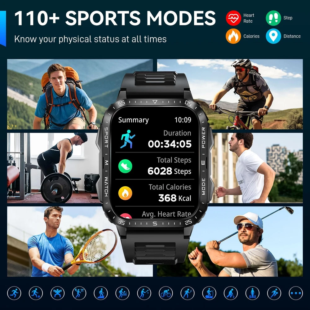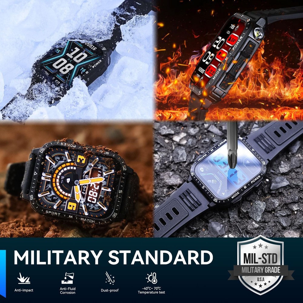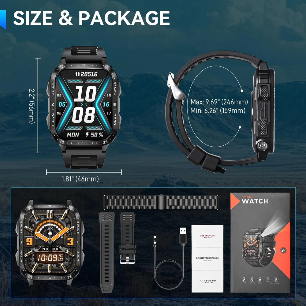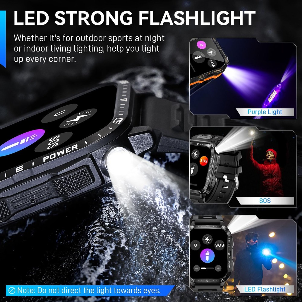 is a leading global smart wearable brand offering smartwatches and health and fitness devices. Adhering to the spirit of craftsmanship, carrying forward innovative ideas, and integrating classic culture and fashion concepts into brand creation. has become an excellent brand with good reputation in the industry. Main Features: 1. LED flashlight 2. 3ATM Waterproof 3. 2.0” TFT screen, 240*282 pixels high resolution 4. 430mAh battery, can be used about 5-7 days Specifications: Product Name: Smart Watch for Men Screen Size: 2.0” inch Screen Type: IPS Resolution: 240*282 pixels Battery Capacity: 430 mAh Working Hours: About 5-7 days Standby Time: About 15-20 days Charging Type: Magnetic charging Charging Time: About 2-3 hours Watch Weight: About 0.23lb / 108g APP Name: DaFit Bluetooth Version: BLE 5.3 Compatible System: Support mobile phone version iOS 10.0 and above Android 6.0 and above. Package Including: 1 x Smart Watch 1 x Watch Band 1 x Charging Cable 1 x User Manual 1 x Gift Box LED Flashlight Rugged Smartwatch: military smart watch for men is equipped with a bright LED flashlight and compass, with a lighting distance of up to 6-10 meters, so you are no longer afraid of the dark and getting lost when traveling! Ideal for camping, hiking and night-time adventures. rugged smart watches successfully passed 12 military tests, is rugged, waterproof, dustproof, and can handle all the extreme environments 2.0’’ HD Big Screen & 430mAh Battery: tactical smart watch for men boasts a robust 430mAh battery that lasts 5-7 days on a full charge and offers a standby time of up to 25 days. men smart watches with 2.0" inches extra large HD full touch screen, which are rugged zinc alloy metal bezel. The big screen smart watches with 240*282 high resolution is ideal for outdoor enthusiasts Convenient Communication Features: Smart watches for men android and ios phones compatible with one-click stable bluetooth connection. The fitness watch adopts Bluetooth 5.3 technology. Comes with built-in HiFi stereo speakers and a microphone. Features such as direct calling, smart message notifications from WhatsApp and Facebook, and AI voice assistance enhance its usability, making Android smart watch a smart addition to your daily routine Fitness Tracker & 110+ Sports Modes: Fitness tracker watches also support 110+ sports modes, you can choose the sports modes as you like in the Da Fit APP to meet your diversified needs. The military smartwatch for men can record your health data like calories, steps and distance in real-time. When you are walking, running and other sports, the sports smart watch accurately collects your body data and synchronizes to your phone, giving you insights into the whole day's activity clearly More Efficient Life & DIY Watch Faces: The outdoor sports watches has many built-in functions including smart notifications, music control, camera control, weather forecast, sedentary reminders, alarm clock, stopwatch, timer, etc. Watch Built-in 5 watch faces, We also offer you a variety of online dials, connect to the APP to freely download different styles of watch faces in the watch face center and support custom watch faces Great Compatibility & After-Sales Service: fitness watch for men is compatible with most iPhone android phones, used with DaFit App, supports Android 6.0 iOS 10.0, Bluetooth 5.3 and above. can provide a 1 year replacement service. Any questions, please contact us at any time
