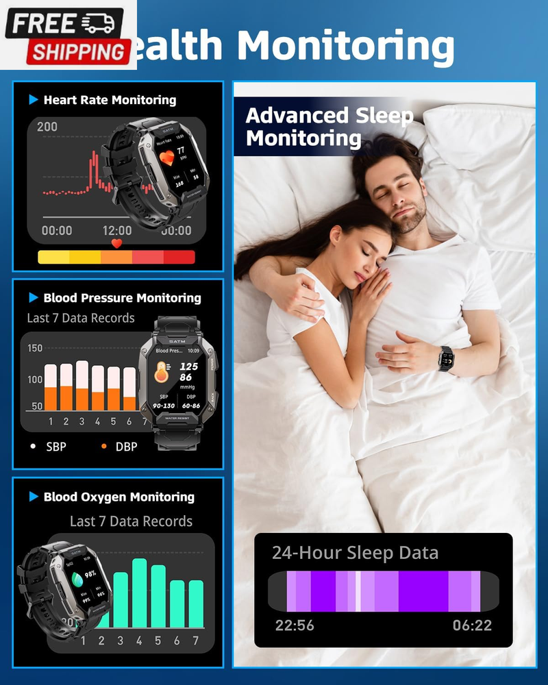 This military smartwatch is a game-changer! The 2.01" HD display is super crisp, and Bluetooth calling works flawlessly. I love the 100+ sport modes—perfect for tracking my workouts. The IP68 waterproofing means I can swim with it worry-free. Heart rate and blood pressure monitoring are accurate, and battery life lasts days. Fast shipping, great customer service, and the 30-day guarantee make this a no-brainer purchase. Highly recommend for anyone wanting a rugged, feature-packed smartwatch!