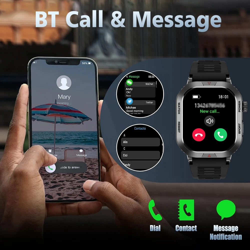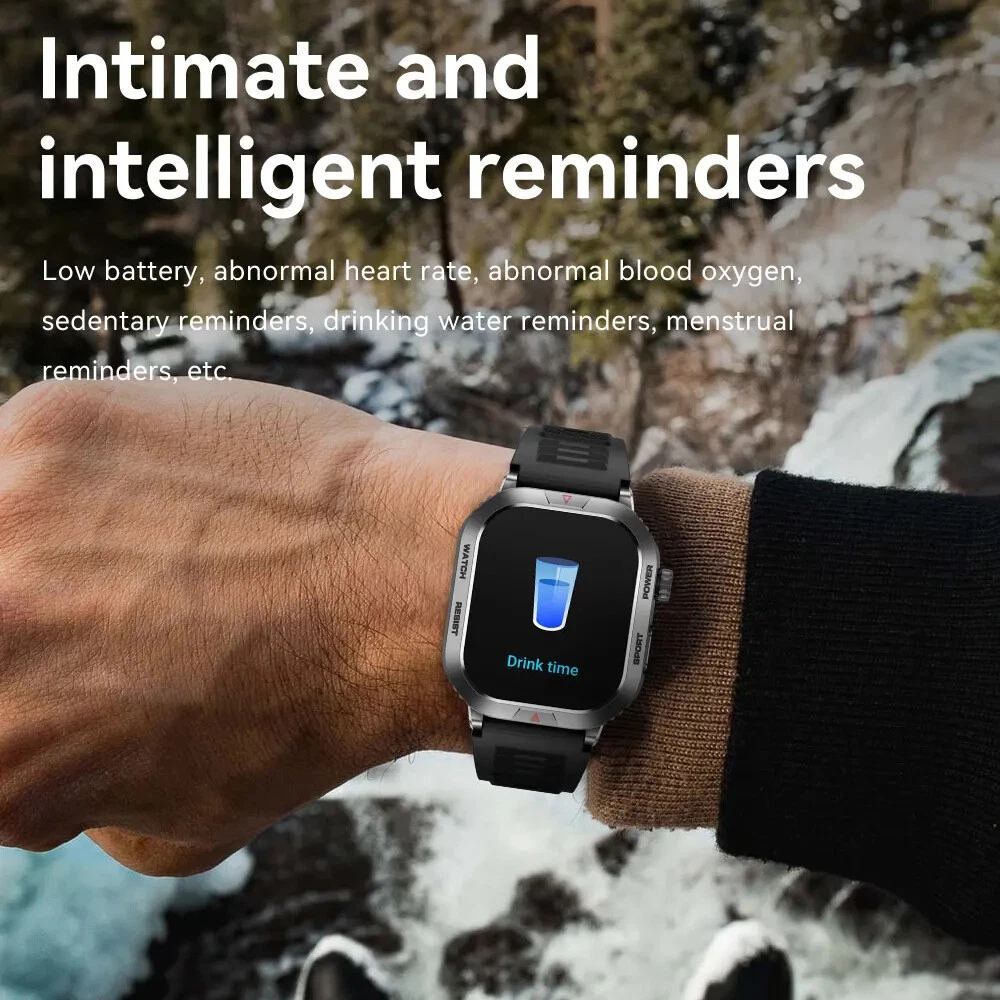 Features: 【Tough Performance】This fitness tracker watch has over 100 comprehensive workout modes for any activity, from walking to running, cycling, rock climbing, yoga, etc., which can accurately and easily track daily data such as activity, distance and calories for any purpose. The large capacity 300mAh battery is fully charged in 2 hours and lasts 3-7 days per charge, which can be extended to 30 days in standby mode. 【Wireless Calls and Message Notifications】 Make wireless calls on your smartwatch simply by connecting through the app, take calls, receive message vibration alerts and app updates - all on your wrist without having to constantly check your phone while driving, exercising, or engaging in activities where it's difficult to hold your phone. The Tactical Smartwatch keeps you informed without distraction so you can fully focus on what you're doing. 【Military Grade Certification and Full Metal Frame】Military smartwatches undergo 15 of the most rigorous durability tests to simulate harsh conditions such as deserts, rainforests and arctic weather. This proves that only a watch designed to adapt to any environment can be smart enough to be easy to use. It is IP68 water resistant and can handle splashes, sweat, etc. such as hand washing or light rain (not suitable for swimming or prolonged immersion). 【Ultra High Resolution & Customise Your Unique Style】 The smartwatch makes it easy to personalise its watch face. Its 2-inch HD display has a high resolution of 240*296, providing unrivalled visibility even outdoors. With the app, you can access more than 500 customisable dials and use the images to create personalised dials that showcase your unique personality and style. Specifications: Product Type: Smartwatch Model Number: ZW66 Apps: Fitcloudpro Main Control Chip: 8959T6 Sensor: 3-axis gravity sensor Operation mode: Multi-touch screen + two physical buttons + encoder Screen size: 2 inches Resolution: 240*296 Waterproof rating: IP68 Bluetooth version: 5.1 Speaker: Support LED torch: support Charging method: magnetic suction Battery capacity: 300mah Charging time: 2 hours Use time: 3-7 days of normal use (user use method and frequency situation) System requirements: Android 4.0 and above IOS8.0 and above Main features: pedometer, exercise time, exercise mileage, calorie consumption, sleep monitoring, save 30 days of exercise, sleep data, real-time heart rate measurement (dynamic, static), blood pressure measurement (can be set up to measure blood pressure regularly), blood oxygen measurement, body temperature, custom alarm clock reminder, sedentary reminder, incoming call reminder, information push (SMS/QQQ/WeChat), custom dials, a large number of online dials, flipping the wrist to light the screen Gmail,Snapchat,Push the information prompted by the mobile phone custom alarm clock reminder, sedentary reminder, incoming call reminder, push messages (SMS/QQQ/WeChat) Language support: Simplified Chinese, English, Japanese, Korean, German, French, Spanish, Arabic, Russian, Traditional Chinese, Ukrainian, Italian, Portuguese. Machine size: 56.74*46.27*12.68mm Strap length: 265.28mm Wristband material: silicone Body material: zinc alloy Product colour: black Package Included: 1*smart watch 1*Charging cable 1*User manual Attention: 1.Wearable devices monitor human activities through electronic sensors. They are at the level of consumer electronics. Some deviation is normal. The health test results of the watch are for reference only and cannot be compared with medical devices. When the watch is placed on the surface of an object, there will be test results such as heart rate/blood pressure. This is normal and not a product defect. 2. As the firmware is updated, the user interface will be updated accordingly. Pictures are for reference only, everything is subject to the actual product. 3.This product is an electronic product. Do not use this product for bathing. Do not expose it to high temperatures. Do not immerse it in water. 4.Please download the APP and bind the watch first, do not use your mobile phone Bluetooth to link the watch directly. If it is already connected, please remove the matching watch from the Bluetooth matching device of your mobile phone. 5.Due to the difference of light and screen, the colour of the item may be slightly different from the picture, thank you very much!