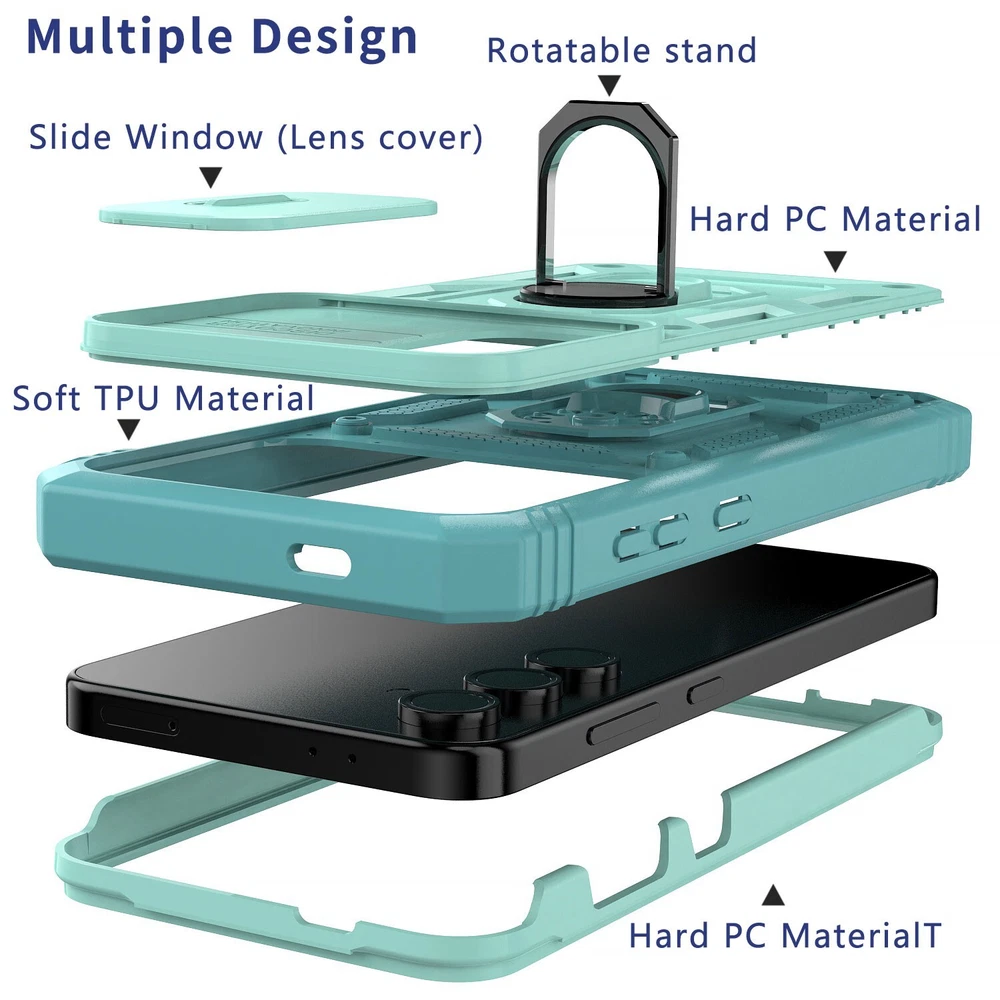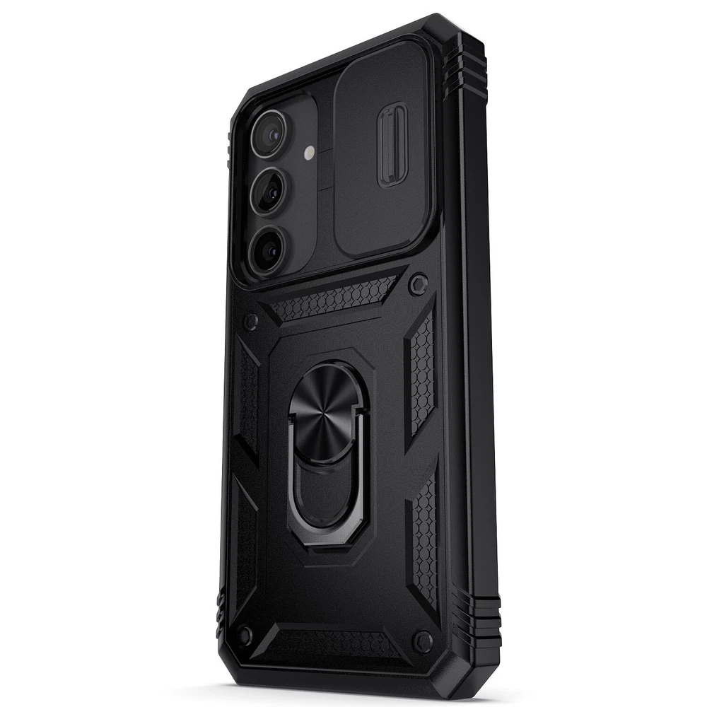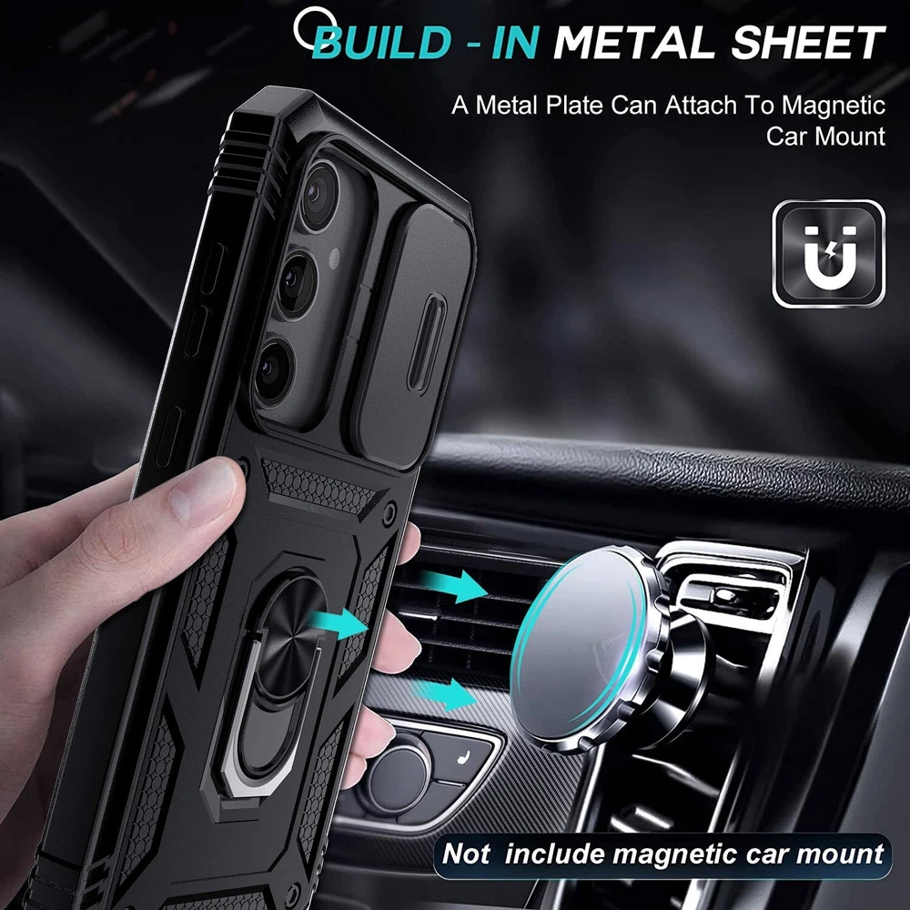 Compatible With: For Samsung Galaxy S24 FE Features: ▪ High Quality: The frame is made of flexible TPU silica gel which avoids your phone falling from high place. The back side of the case is made of hard PC that provides scratch protection. ▪ with Side Camera Cover: Slide cover design for protecting and hide the camera perfectly. ▪ Built-in kickstand: 360 kickstand Ring Stand offers convenient hands-free viewing from either landscape or portrait two different angles; ▪ Magnetic Car Mount: Built-in metal magnetic sheet which can be directly adsorbed stably to the magnetic car mount holder. (Not includes the magnetic car mount holder.) ▪ Precise Cutouts: Precise design, Easy access to all ports, buttons, and features. ▪ Raised edges design ensures extra protection for the screen and camera. Package: 1x Shockproof Ring Stand Cover with Slide Camera Case