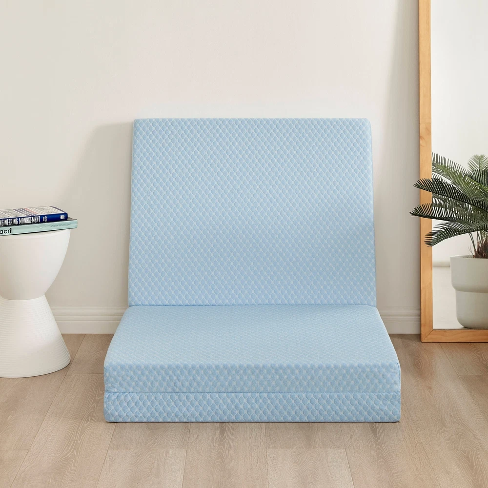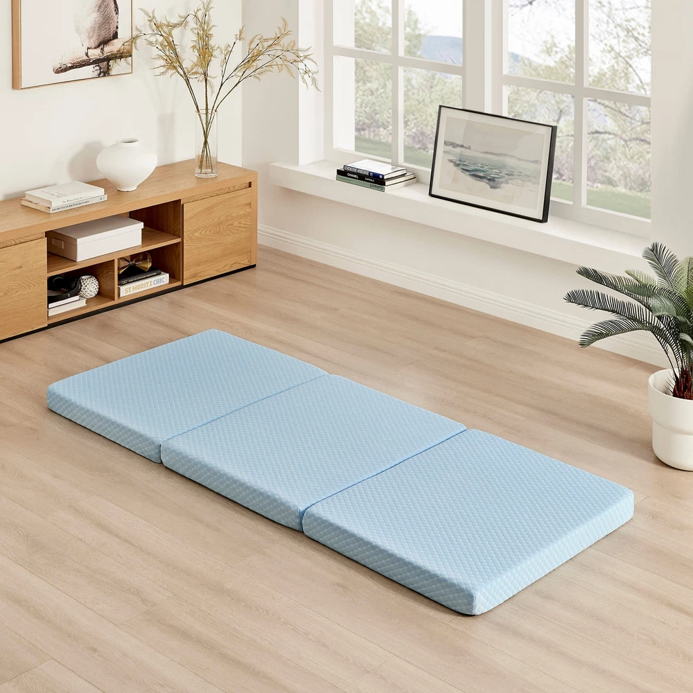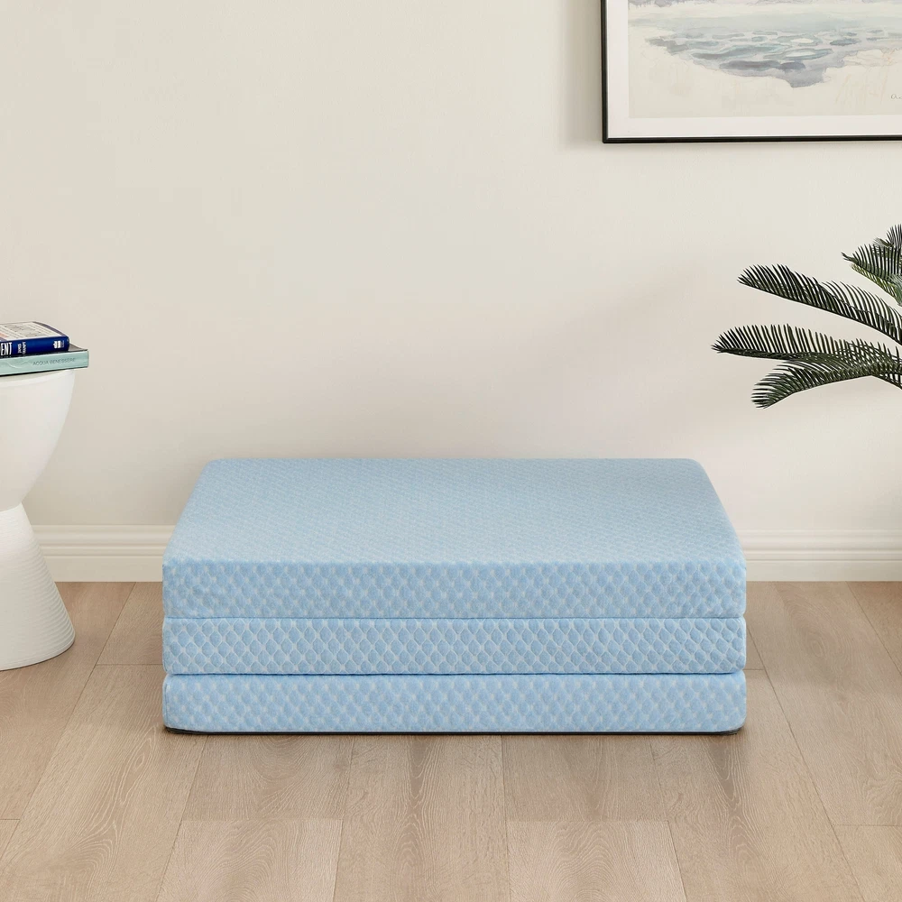 Runfine tri-fold mattress topper that you'll easily be able to handle.If you have a big family with more teenagers and children, or maybe there are frequent guests, relatives visiting, then our foldable mattress toppers are the most worthy investment for you.You can take is as a temporary mattress. It provides an additional seat when necessary. The convertible foldable mattress can be changed freely among lounger chair and bed to satisfy your different needs.When you or your partner shift the position in bed, the entire bed with this durable mattress topper won't move so that you won't disturb each other.Tips:1: Topper is compressed and shipped in a box, takes 24-48 hours to decompress2: If your pets sleep in bed with you, you may need to clean the topper more often than usual. Free Shipping Over $49.99* Details RunFine 3 Inch Tri Folding Mattress Topper Twin with Washable CoverTrifold Product Description: Runfine tri-fold mattress topper that you'll easily be able to handle.If you have a big family with more teenagers and children, or maybe there are frequent guests, relatives visiting, then our foldable mattress toppers are the most worthy investment for you.You can take is as a temporary mattress. It provides an additional seat when necessary. The convertible foldable mattress can be changed freely among lounger chair and bed to satisfy your different needs.When you or your partner shift the position in bed, the entire bed with this durable mattress topper won't move so that you won't disturb each other.Tips:1Topper is compressed and shipped in a box, takes 24-48 hours to decompress2If your pets sleep in bed with you, you may need to clean the topper more often than usual.