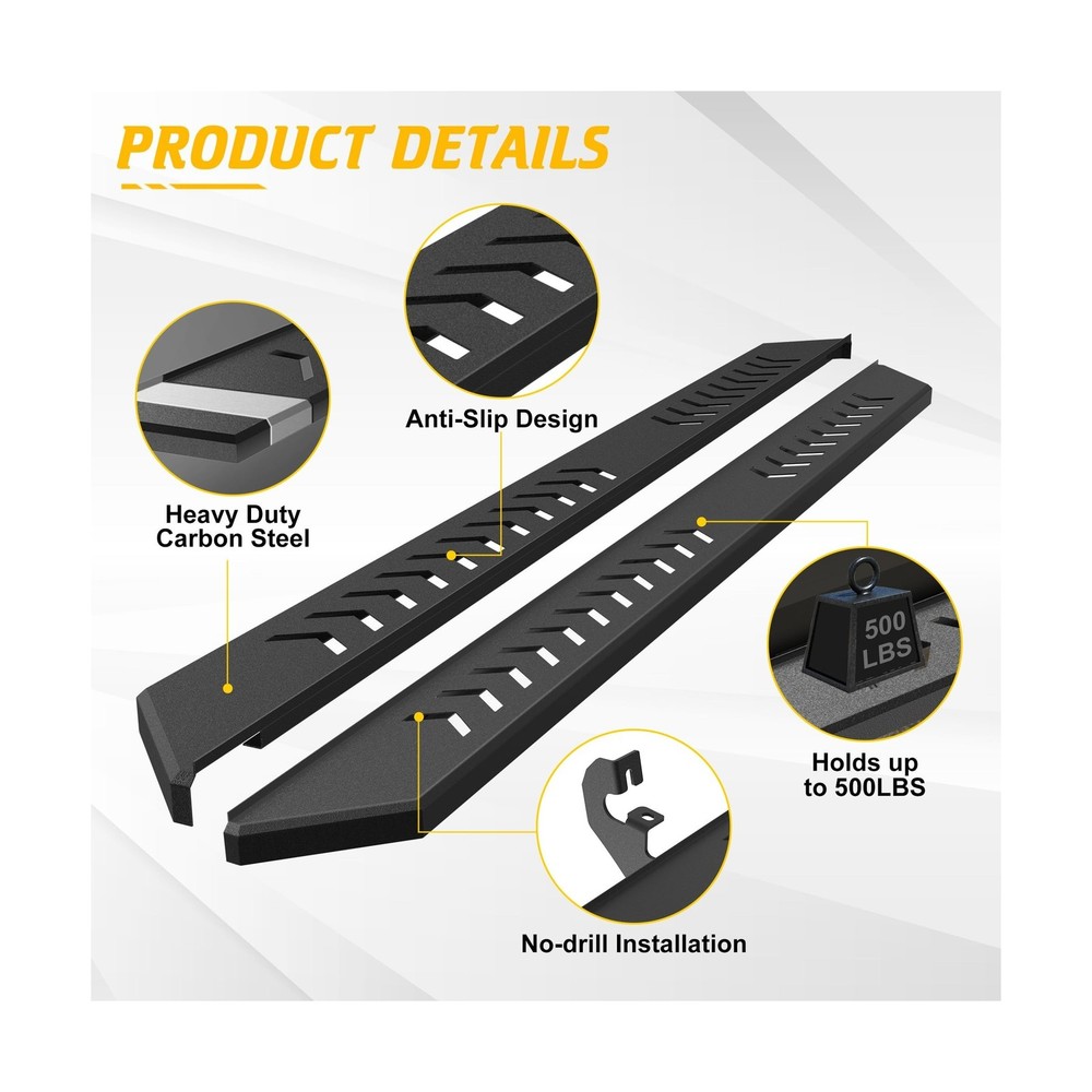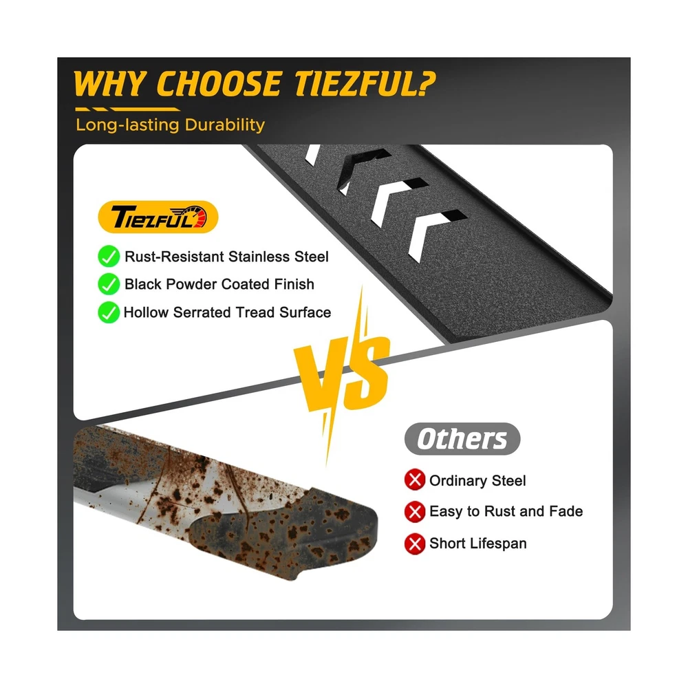 Running Boards Compatible with Ford F150 2015-2025 SuperCrew Cab 4 Full Size Doors, Anti-Slip Side Steps Fit for F250 F350 2017-2025 Super Duty Crew Cab, Texture Black Nerf Bars Steps Description Features: Durable Carbon Steel Construction: Made from high-quality carbon steel, these running boards support up to 500LBS. The power-coated finish resists rust, ensuring long-lasting durability and a sleek appearance Enhanced Accessibility: Featuring a 6-inch wide side steps design, these running boards provide a safe and convenient solution for the elderly, children, and pets to easily enter and exit your vehicle. Also ensures a certain distance from the ground to facilitate access to all types of rough roads All-Season Work:Whether navigating rain, snow, or mud, the anti-slip treads keep your footing secure. The satin-black finish complements your trucks look, while the seamless construction resists dirt buildup. Elevate functionality without sacrificing style No-Drill Installation: Transform your vehicle in under half an hour! Our side steps come pre-drilled to align perfectly with factory mountsno cutting or welding required. The side steps are pre-assembled with 6 heavy-duty brackets, and the kit includes all necessary bolts and illustrated instructions for a DIY-friendly setup. Ideal for both novice and experienced users Product Details: Color: Black Running Boards Brand: TIEZFUL Material: Carbon Steel Exterior Finish: Black Power Coating Finish Item dimensions L x W x H: 86 x 5 x 5 inches Vehicle Service Type: Fit for Ford F150 SuperCrew Cab 2015-2025 & F250 F350 Super Duty Crew Cab 2017-2025 Weight Limit: 500 Pounds OEM Part Number: Fit for 2015 2016 2017 2018 2019 2020 2021 2022 2023 2024 2025 Ford F150 SuperCrew Cab Fit for 2017 2018 2019 2020 2021 2022 2023 2024 2025 F250 F350 Super Duty Crew Cab See more Automotive Fit Type: Vehicle Specific Fit Manufacturer: TIEZFUL Color: Black Running Boards Brand: TIEZFUL Material: Carbon Steel Exterior Finish: Black Power Coating Finish Item dimensions L x W x H: 86 x 5 x 5 inches Vehicle Service Type: Fit for Ford F150 SuperCrew Cab 2015-2025 & F250 F350 Super Duty Crew Cab 2017-2025 Weight Limit: 500 Pounds OEM Part Number: Fit for 2015 2016 2017 2018 2019 2020 2021 2022 2023 2024 2025 Ford F150 SuperCrew Cab Fit for 2017 2018 2019 2020 2021 2022 2023 2024 2025 F250 F350 Super Duty Crew Cab Automotive Fit Type: Vehicle Specific Fit Manufacturer: TIEZFUL Model: Fit for Ford F150 2015-2025 SuperCrew Cab & F250 F350 2017-2025 Super Duty Crew Cab 4 Full Size Doors Product Dimensions: 86 x 5 x 5 inches Item model number: TZ8203 Manufacturer Part Number: 8203 Special Features: Accessibility, Heavy-Duty Durability, Matte Black Finish, anti-slip, rust-resistant Date First Available: June 5, 2025 Delivery We Do Not Ship Outside of the Continental US. Return Policy All items qualify for returns within 30 days of receipt. Seller is responsible for return shipping on any item that is not damaged. Feedback We take our reputation seriously, we buy and sell online, so we understand the value of trust. If you are unsatisfied with your order, please contact us and we will work with you to resolve it to your satisfaction.