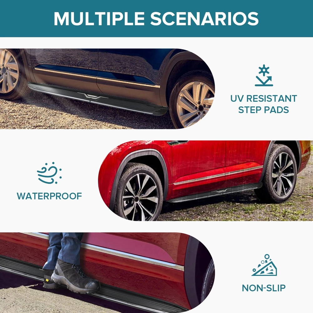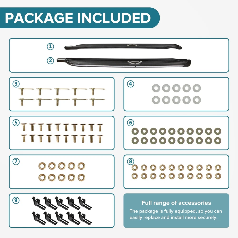 Specification Color: Black+silver Type: Step Nerf Bar Placement on Vehicle: Left, Right Fitment Type: Performance/Custom Material: Stainless Steel,ABS Shape: Rectangular Mounting Hardware Included: YES Package Size: 85.43*9.65*6.69 Package Weight: 31.75 Fitment 2018-2024 Volkswagen Atlas Features & Benefits 1. PREMIUM QUALITY MATERIAL: The Running Boards are constructed from aircraft grade extruded value Stainless Steel. This high-quality build ensures rust-resistance and the ability to support up to 500lbs, promising a long-lasting performance. 2. EASY INSTALLATION: The package includes all necessary mounting parts and an installation instruction manual. Designed to fit seamlessly into your VW Volkswagen Atlas 2018-2022 2023 2024's existing mounting points, these side steps require no drilling, making the installation process smooth and hassle-free. 3. SAFETY-ORIENTED DESIGN: The Running Boards feature a slip-proof step pad, ensuring secure and easy access into and out of the vehicle for you, your family, and friends. 4. VERSATILE APPLICATION: These Running Boards are not just functional but also add a stylish touch to your VW Volkswagen Atlas. Suitable for models from 2018 to 2024, they serve as a valuable addition to your vehicle. On Nov 19, 2024 at 01:36:25 PST, seller added the following information: On Nov 22, 2024 at 02:00:46 PST, seller added the following information: