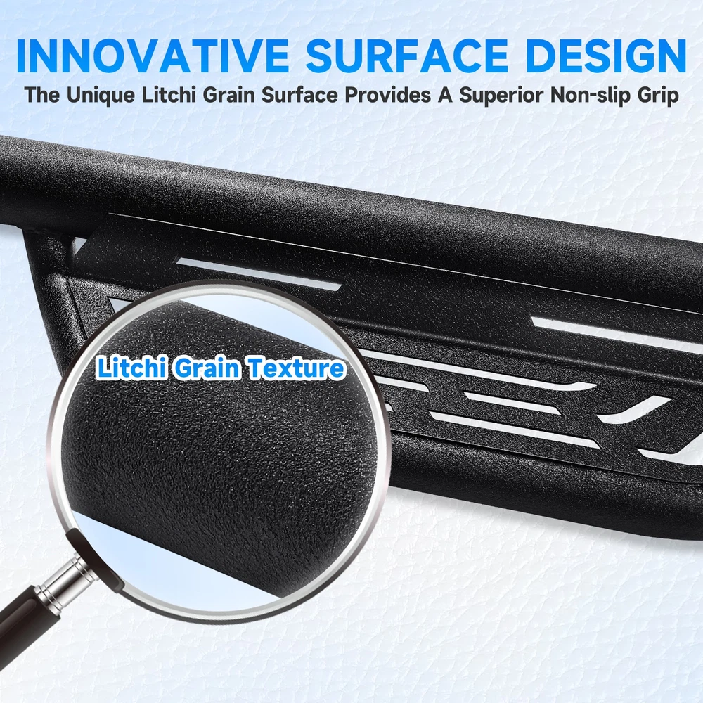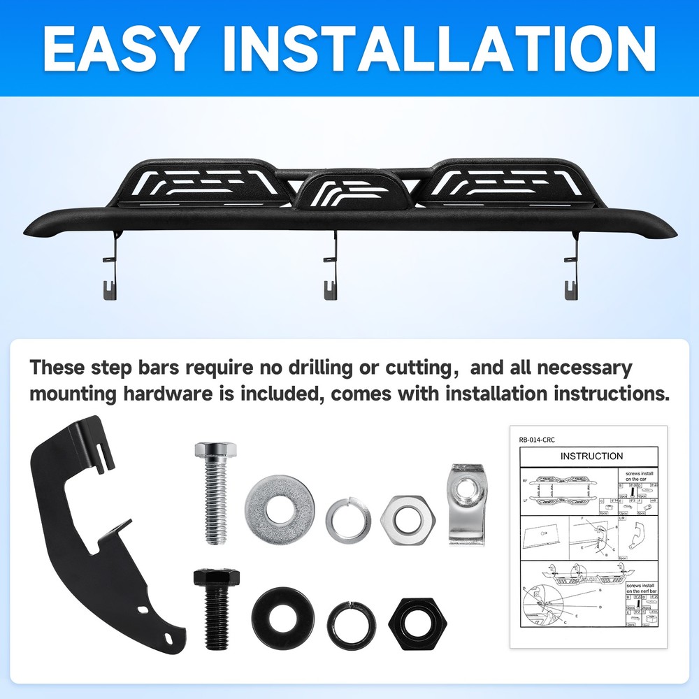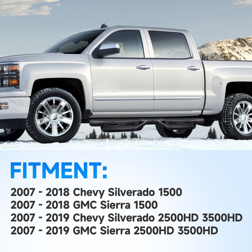 Running Boards For 2007-2018 Chevy Silverado 1500 Crew Cab 6" Nerf Bar Side Step Features: 1.Crafted from top-grade stainless steel, ensuring that they remain rust-free even in the harshest conditions 2.Litchi Grain Surface-much more resilient and making it safer and more comfortable to step on 3. Boast an exceptional load-bearing capacity(support up to 600 lbs without bending or warping) 4.Easy Installation: Hassle-free installation, no drilling or cutting required, and all necessary mounting hardware included 5.Generous Half-year warranty against any rust or corrosion Compatible with: Compatible with Crew Cab Only: 2007-2018 Chevy Silverado / GMC Sierra 1500 2500HD 3500HD (Incl. 2500HD/ 3500HD Diesel model) 2019 Chevy Silverado / GMC Sierra 2500HD 3500HD (Incl. 2500HD/ 3500HD Diesel model) 2019 Chevy Silverado / GMC Sierra 1500 LD Do not fit for Double Cab Do not fit for 2007 Classic Body Style Do not fit for ALL Diesel Engine Models Package Included: 2 x Side Steps | Nerf Bars | Running Boards (Driver & Passenger Side) Payment Shiping Policy Returns Policy Feedback Contact us Payment We accept PayPal, Google Pay, Credit Cards, and Debit Cards. Shiping Policy All Orders Will Ship Within Two Business Days.Except PR,HI,AK,GU and PO Box addresses. No local pick up All Packages Will Be Inspect Before Shipping, We Will Provide All Packing Material Needed For Your Package For Shipping Such As Boxes, Cushioning And Tape To Improve Shipping Quality. Very Important: Double check shipping address. We are not responsible for incorrect or undeliverable addresses. Returns Policy 60 Days returns satisfaction guarantee. All of Our Items Are 100% Brand New. If The Item Shows Up Defective or Broken, Please Contact Us Within 3 Business Days By Using "Ask A Question" Link Located At The Bottom of Our Listing. Your Questions/Concerns Will Be Responded Within 12 Hours Monday To Friday. Buyers May Contact us On The Weekends or Pubic Holidays And We Will Respond On The Next Working Day. We Will Offer Replacements, Exchange or Full Refund. 100% Satisfaction Guaranteed. We Will File Damage Or Lost Claim For Our Buyers Feedback We will leave a positive feeback immediately after payment is received. We appreciate a positive feedback as much as you do. If you have any issue with order,pls. contact us before leaving a feedback. We will glad to resolve your issue.Your satisfaction is our priority. Contact us If you have any concerns, Pls. feel free to contact us at any time.