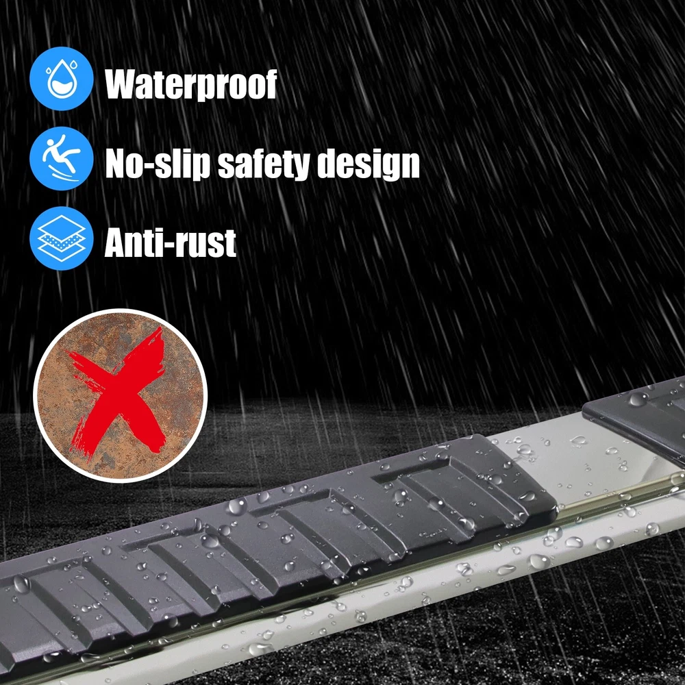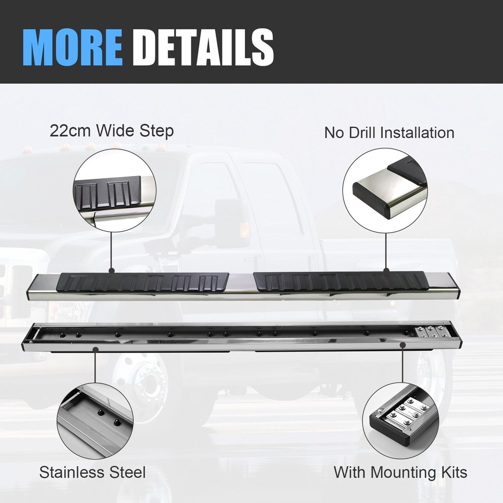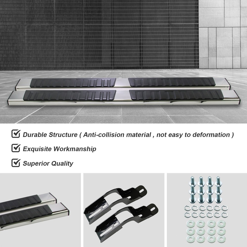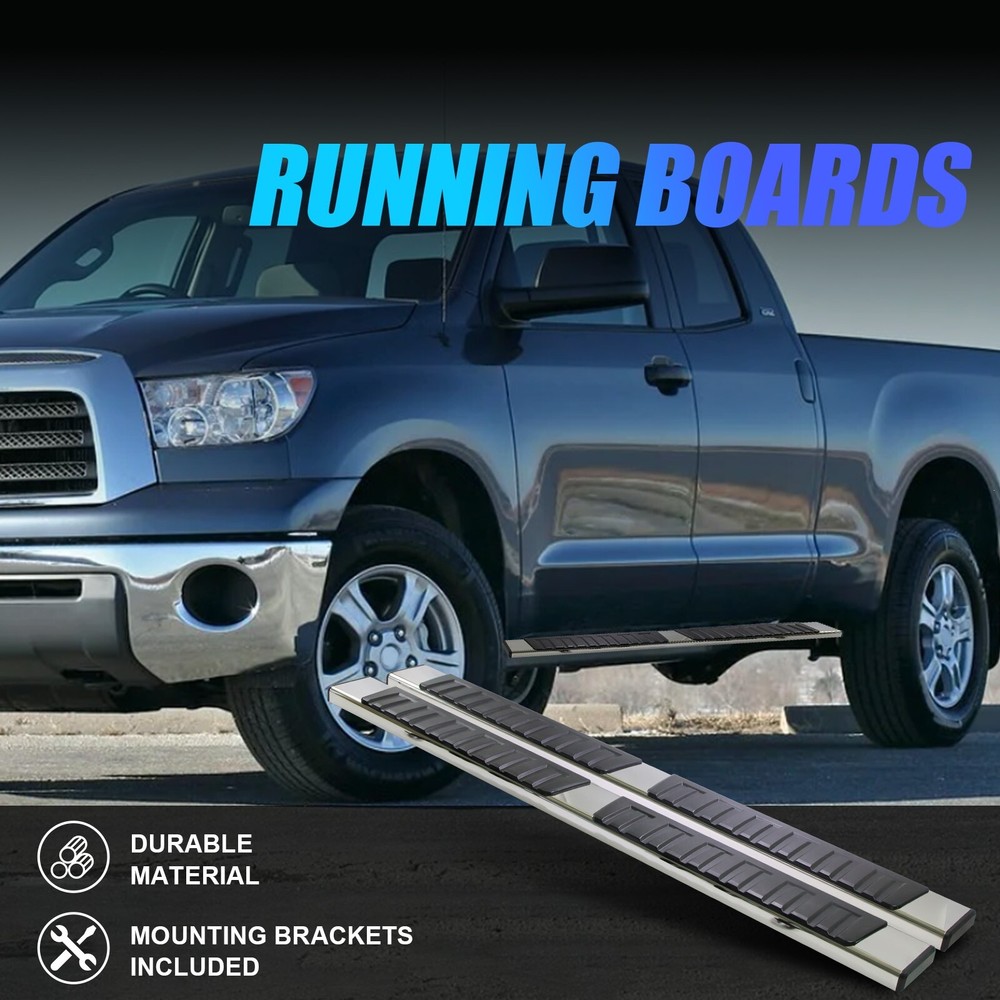 Specification Package Include: 1x Pair of Running Boards (Left + Right) Brackets on Each Side Mounting Hardware Sealing End Cover: Yes Manufacturer Warranty: 1 Year Color: Black, Silver Vehicle Service Type: Truck Fitment Type: Direct Replacement Placement on Vehicle: Left+Right Material: Stainless Steel,ABS Only Fit: Double Cab Item Weight(lbs): 45.08 Package Dimensions(LengthxWidthxHeight:inch): 79.53x8.66x8.66 Package Weight(lbs): 47.29 Condition: New Style: OE Style Installation Instruction: Not Included Tread(inch):6" Fitment 2007-2021 Toyota Tundra Description 1. Made with durable, heavy-duty high light stainless steel and ABS plastic. Seamless joined ABS plastic tread with powder coated body surface to achieve great UV rays, rust, and slippery resistance. 2. Our running boards are made from the finest aluminum alloy, which is sturdy, durable, wear-resistant and rust-resistant. After repeated tests, they can resist the corrosion of salt spray, and withstand UV radiation without discoloration. 3. To a certain extent, they also help protect the paint on the side of the car from being scratched. At the same time, you can easily reach the top of your car when you need it, such as accessing the luggage rack or cleaning the rooftop. 4. Slider Design, Able to adjust position on vehicle forward & backwards for better customization. the whole closed end design make your running board inside clean. 5. Whatever finish you choose, the result is a smooth, finished look that complements your factory chrome and trim perfectly. 6. Running Boards & Side Steps make your life safe and simple for taking your coworkers to the job place, take your pets go out or carpooling the kids to school both. You have a very solid under foot feeling thanks to the Anti-slip tread surface and rugged construction. 7. Easy bolt-on installation: No cutting or drilling.