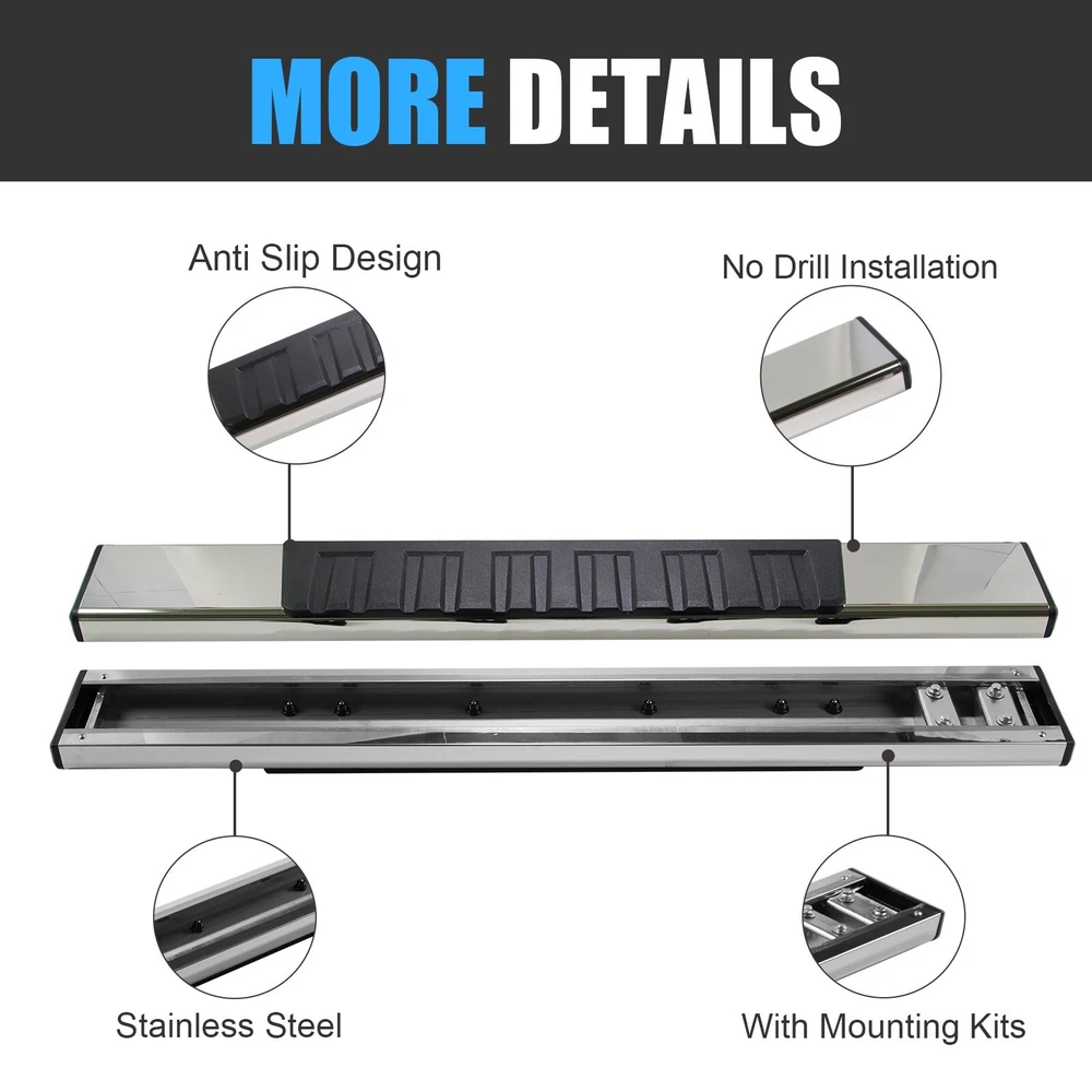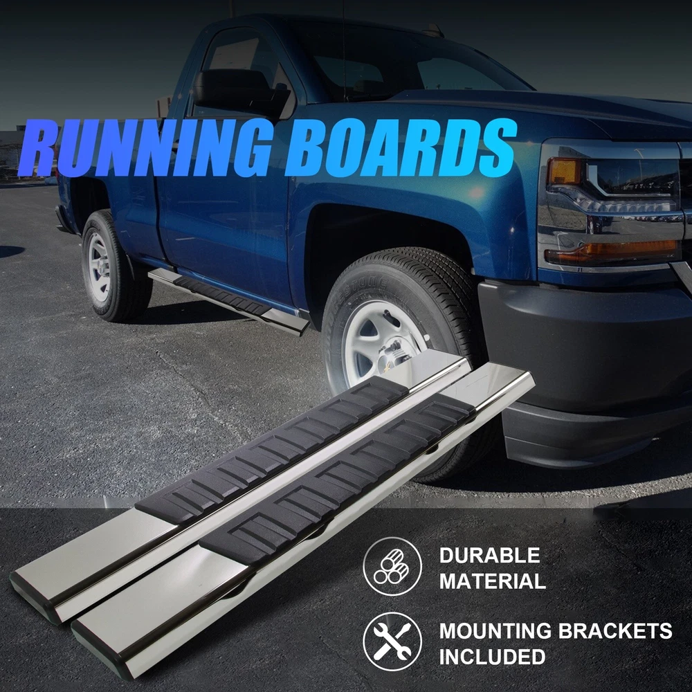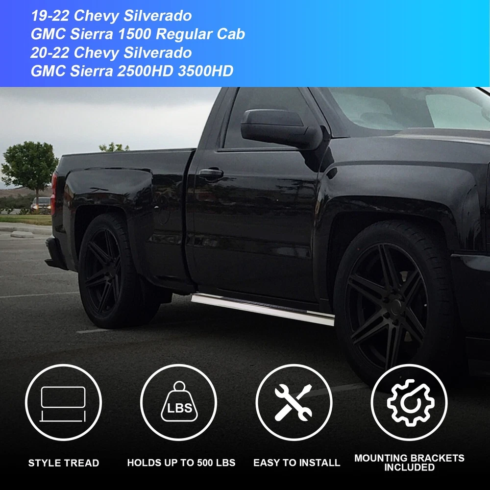 Specification Style: OE Style Installation Instruction: Not Included Condition: New Package Weight(lbs): 33.4 Package Dimensions(LengthxWidthxHeight:inch): 55.91x8.66x8.66 Item Weight(lbs): 31.2 Package Include: 1x Pair of Running Boards (Left + Right) Brackets on Each Side Mounting Hardware Manufacturer Warranty: 1 Year Color: Black, Silver Fitment Type: Direct Replacement Vehicle Service Type: Truck Placement on Vehicle: Left+Right Material: Stainless Steel,ABS Only Fit: Regular Cab Sealing End Cover: Yes Tread(inch):6" Fitment 2019 - 2022 Chevrolet Silverado 1500 Regular Cab 2020 - 2022 Chevrolet Silverado 2500HD/3500HD Regular Cab 2019 - 2022 GMC Sierra 1500 Regular Cab 2020 - 2022 GMC Sierra 2500HD/3500HD Regular Cab Fits Regular Cab models only Description 1. Made with durable, heavy-duty high light stainless steel and ABS plastic. Seamless joined ABS plastic tread with powder coated body surface to achieve great UV rays, rust, and slippery resistance. 2. Our running boards are made from the finest aluminum alloy, which is sturdy, durable, wear-resistant and rust-resistant. After repeated tests, they can resist the corrosion of salt spray, and withstand UV radiation without discoloration. 3. To a certain extent, they also help protect the paint on the side of the car from being scratched. At the same time, you can easily reach the top of your car when you need it, such as accessing the luggage rack or cleaning the rooftop. 4. Slider Design, Able to adjust position on vehicle forward & backwards for better customization. the whole closed end design make your running board inside clean. 5. Whatever finish you choose, the result is a smooth, finished look that complements your factory chrome and trim perfectly. 6. Running Boards & Side Steps make your life safe and simple for taking your coworkers to the job place, take your pets go out or carpooling the kids to school both. You have a very solid under foot feeling thanks to the Anti-slip tread surface and rugged construction. 7. Easy bolt-on installation: No cutting or drilling. On Nov 18, 2024 at 01:48:46 PST, seller added the following information: On Nov 22, 2024 at 02:00:59 PST, seller added the following information:
