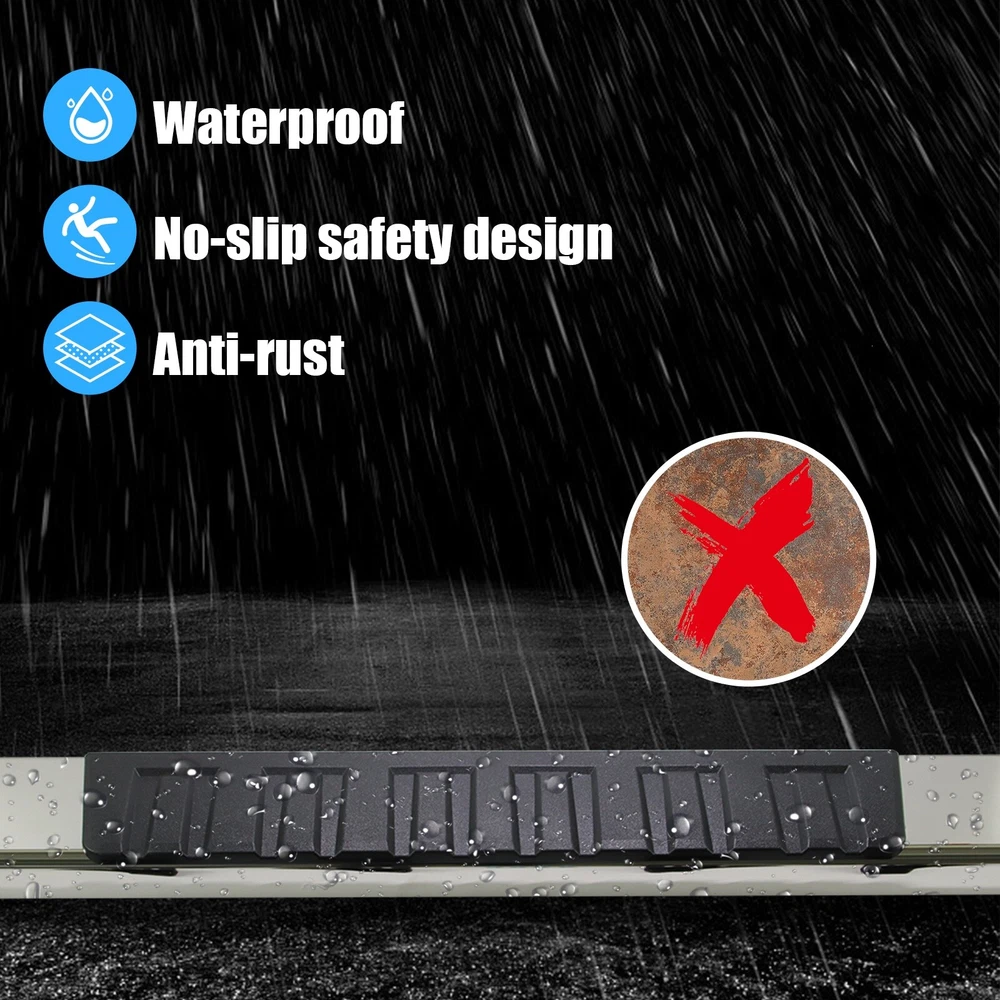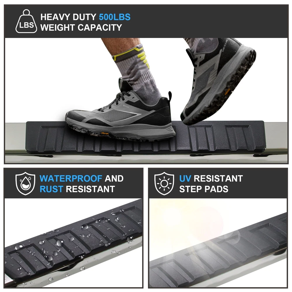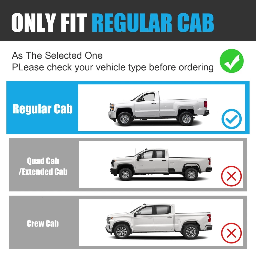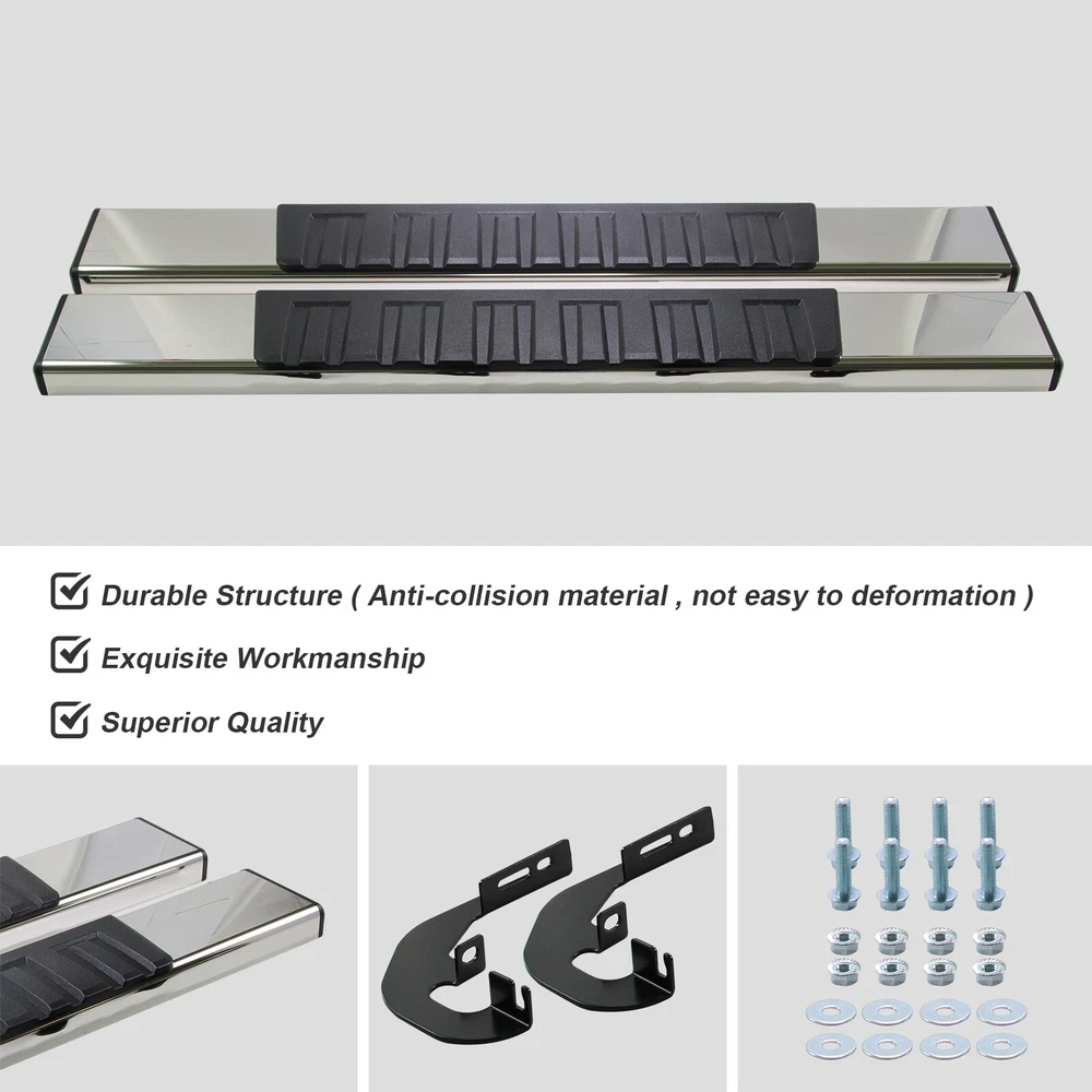 Specification Style: OE Style Installation Instruction: Not Included Condition: New Package Weight(lbs): 33.4 Package Dimensions(LengthxWidthxHeight:inch): 55.91x8.66x8.66 Item Weight(lbs): 31.2 Package Include: 1x Pair of Running Boards (Left + Right) Brackets on Each Side Mounting Hardware Manufacturer Warranty: 1 Year Color: Black, Silver Fitment Type: Direct Replacement Vehicle Service Type: Truck Placement on Vehicle: Left+Right Material: Stainless Steel,ABS Only Fit: Regular Cab Sealing End Cover: Yes Tread(inch):6" Fitment 2019 - 2022 Chevrolet Silverado 1500 Regular Cab 2020 - 2022 Chevrolet Silverado 2500HD/3500HD Regular Cab 2019 - 2022 GMC Sierra 1500 Regular Cab 2020 - 2022 GMC Sierra 2500HD/3500HD Regular Cab Fits Regular Cab models only Description 1. Made with durable, heavy-duty high light stainless steel and ABS plastic. Seamless joined ABS plastic tread with powder coated body surface to achieve great UV rays, rust, and slippery resistance. 2. Our running boards are made from the finest aluminum alloy, which is sturdy, durable, wear-resistant and rust-resistant. After repeated tests, they can resist the corrosion of salt spray, and withstand UV radiation without discoloration. 3. To a certain extent, they also help protect the paint on the side of the car from being scratched. At the same time, you can easily reach the top of your car when you need it, such as accessing the luggage rack or cleaning the rooftop. 4. Slider Design, Able to adjust position on vehicle forward & backwards for better customization. the whole closed end design make your running board inside clean. 5. Whatever finish you choose, the result is a smooth, finished look that complements your factory chrome and trim perfectly. 6. Running Boards & Side Steps make your life safe and simple for taking your coworkers to the job place, take your pets go out or carpooling the kids to school both. You have a very solid under foot feeling thanks to the Anti-slip tread surface and rugged construction. 7. Easy bolt-on installation: No cutting or drilling. On Nov 18, 2024 at 01:48:46 PST, seller added the following information: On Nov 22, 2024 at 02:00:59 PST, seller added the following information: