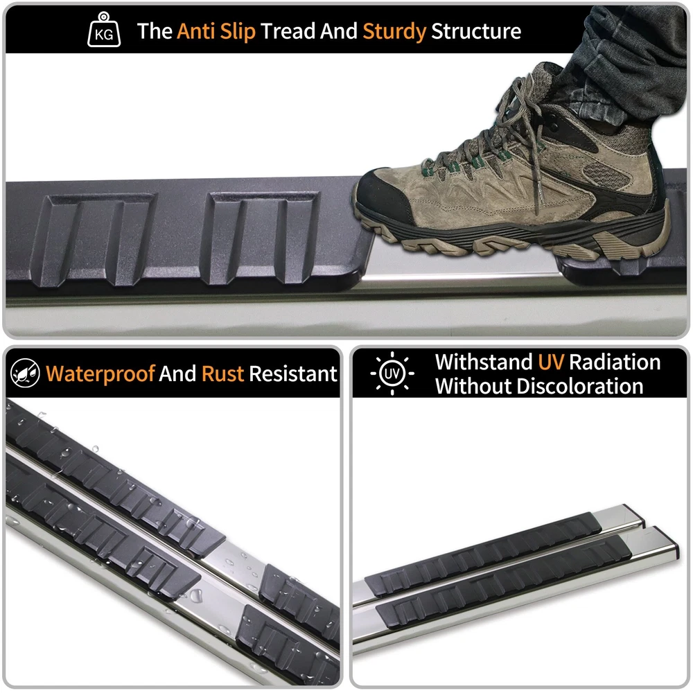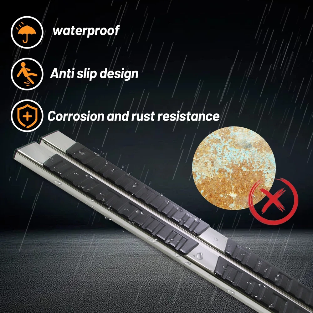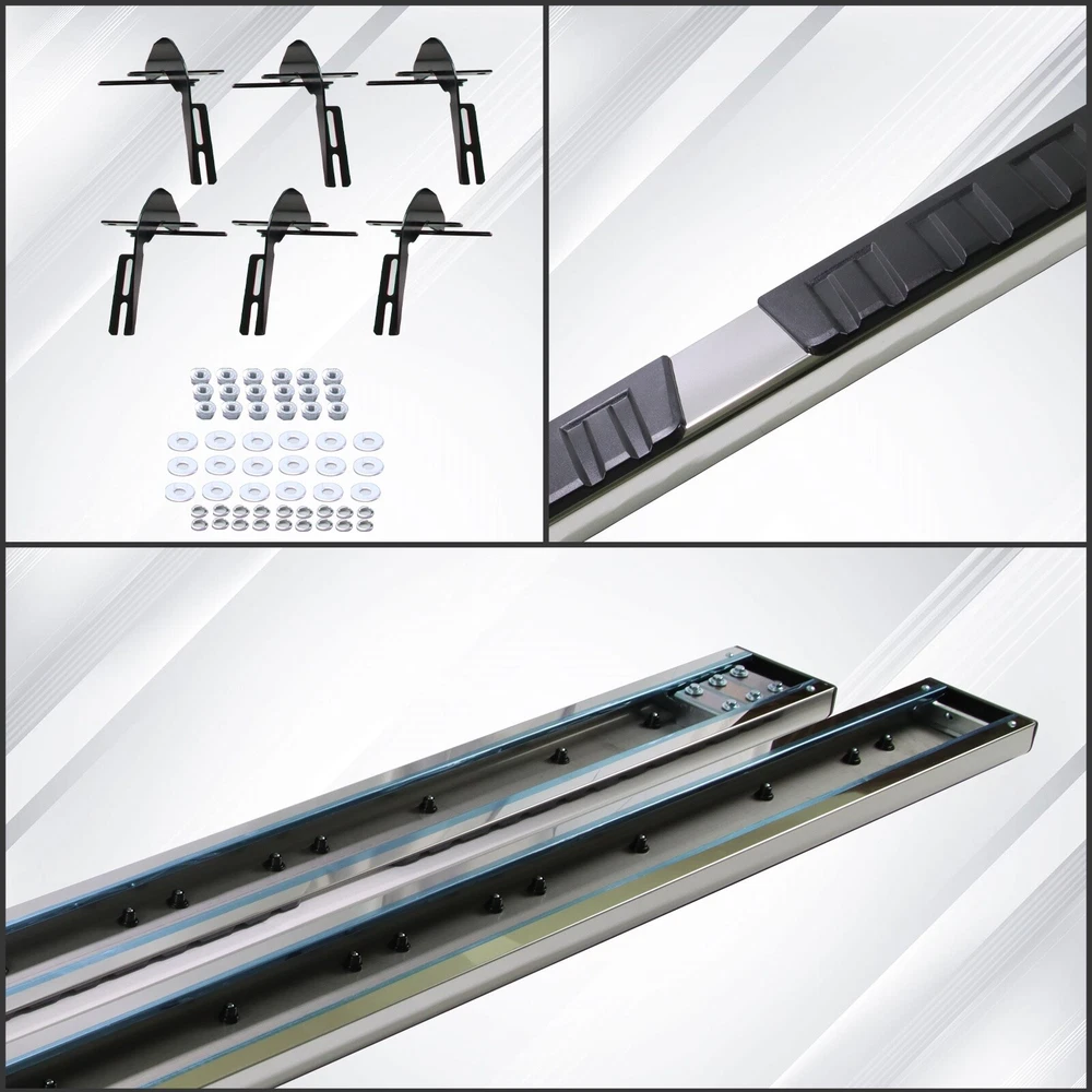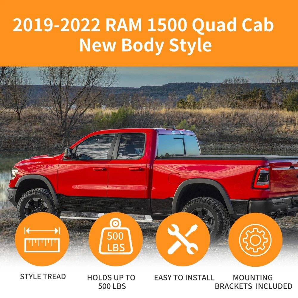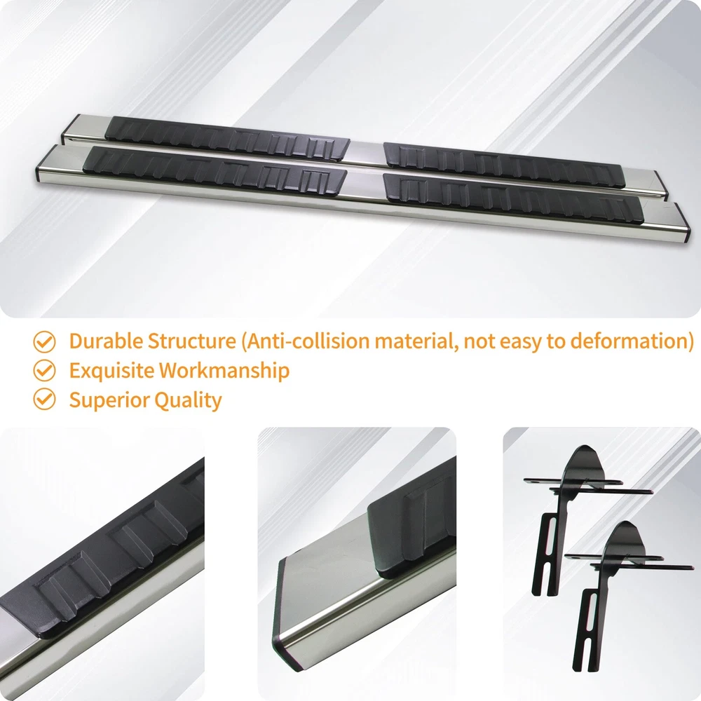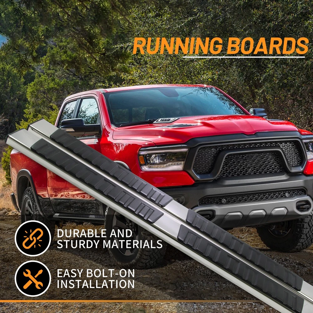 Specification Placement on Vehicle: Left+Right Material: Stainless Steel,ABS Only Fit: Quad Cab Item Weight(lbs): 45.19 Package Dimensions(LengthxWidthxHeight:inch): 79.53x9.45x8.66 Package Weight(lbs): 47.4 Condition: New Vehicle Service Type: Truck Style: OE Style Installation Instruction: Not Included Fitment Type: Direct Replacement Manufacturer Warranty: 1 Year Color: Black, Silver Package Include: 1x Pair of Running Boards (Left + Right) Brackets on Each Side Mounting Hardware Sealing End Cover: Yes Tread(inch):6 " Fitment 2019-2024 Dodge Ram 1500 Quad Cab/Extended Cab (Only fit new body,do not fit classic.) Description 1. Made with durable, heavy-duty high light stainless steel and ABS plastic. Seamless joined ABS plastic tread with powder coated body surface to achieve great UV rays, rust, and slippery resistance. 2. Our running boards are made from the finest aluminum alloy, which is sturdy, durable, wear-resistant and rust-resistant. After repeated tests, they can resist the corrosion of salt spray, and withstand UV radiation without discoloration. 3. To a certain extent, they also help protect the paint on the side of the car from being scratched. At the same time, you can easily reach the top of your car when you need it, such as accessing the luggage rack or cleaning the rooftop. 4. Slider Design, Able to adjust position on vehicle forward & backwards for better customization. the whole closed end design make your running board inside clean. 5. Whatever finish you choose, the result is a smooth, finished look that complements your factory chrome and trim perfectly. 6. Running Boards & Side Steps make your life safe and simple for taking your coworkers to the job place, take your pets go out or carpooling the kids to school both. You have a very solid under foot feeling thanks to the Anti-slip tread surface and rugged construction. 7. Easy bolt-on installation: No cutting or drilling. On Nov 18, 2024 at 05:36:27 PST, seller added the following information: On Nov 22, 2024 at 02:00:55 PST, seller added the following information:
