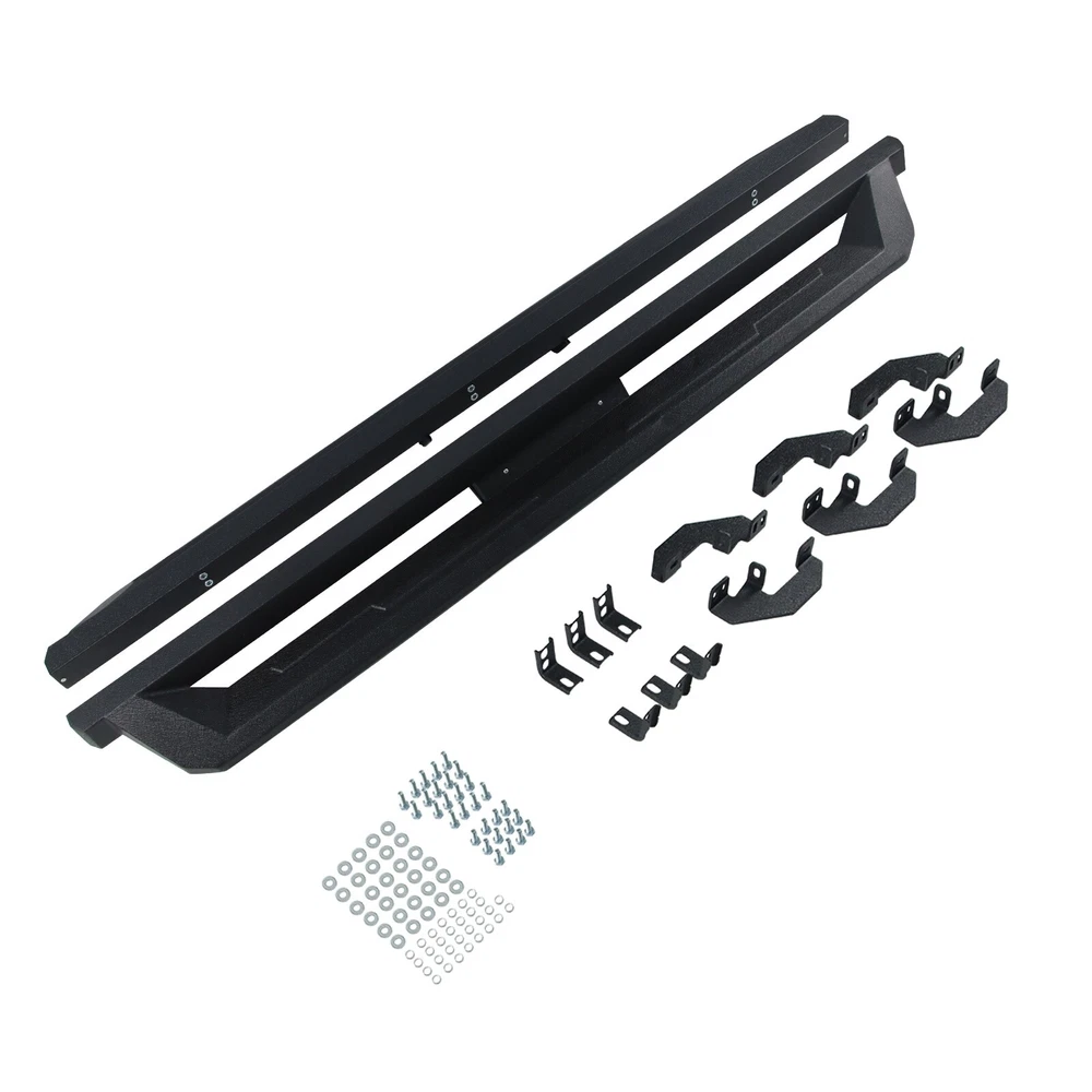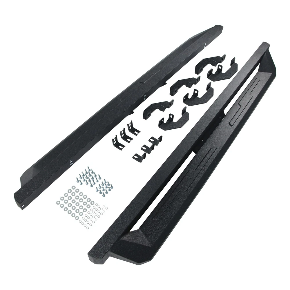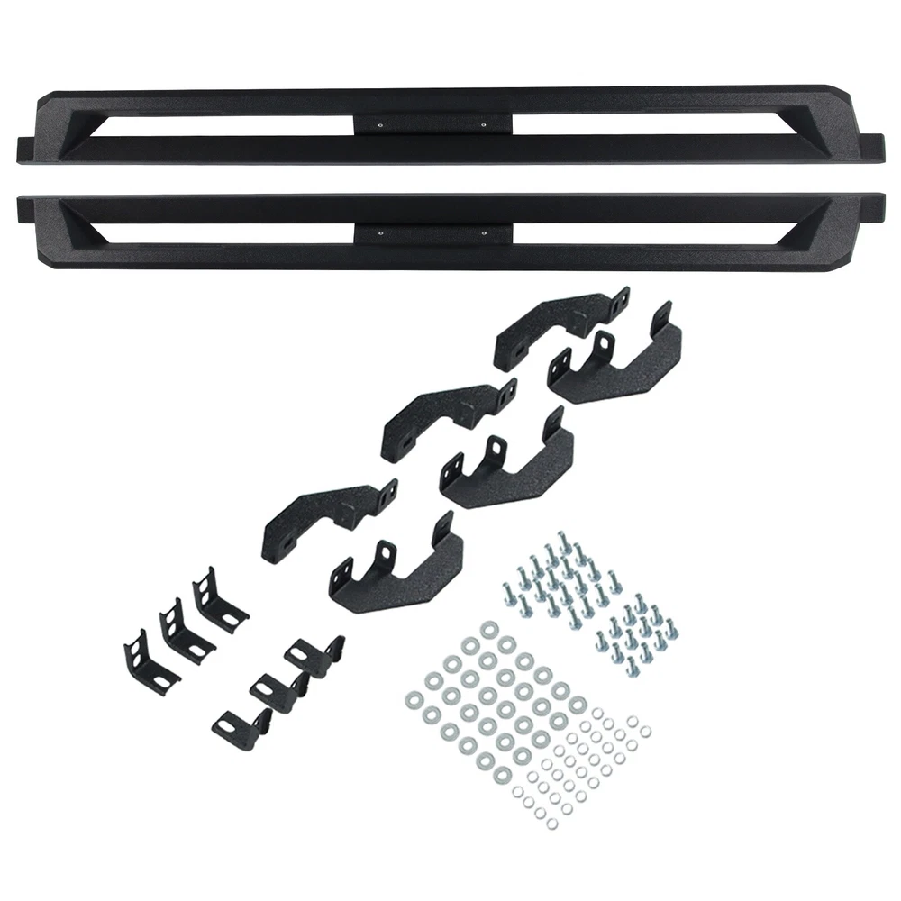 Specification Color: Black Material: Carbon Steel Finish: Powder-Coated,Textured Package Include: 2x Running Boards (left&right) 1x Set Mounting Brackets and hardware 1x Installation instruction Cab fit: Double Cab Placement on Vehicle: Left+Right Tread Width(inch): 4.7 Item Length(inch): 77.9 Item Height(inch): 4.8 Item Weight(lbs): 58.11 Package Dimensions (LengthxWidthxHeight:inch): 79.92*11.02*9.06 Package Weight(lbs): 62.52 Manufacturer Warranty: 1 Year Warranty for Quality Problems Condition: New Fitment 2022-2022 GMC Sierra 1500 Limited 2020-2024 GMC Sierra 2500 HD 2020-2023 GMC Sierra 3500 HD 2019-2023 GMC Sierra 1500 2022-2022 Chevrolet Silverado 1500 LTD 2020-2024 Chevrolet Silverado 3500 HD 2020-2024 Chevrolet Silverado 2500 HD 2019-2023 Chevrolet Silverado 1500 Features & Benefits 1.Performant Design:Running Boards feature a unique drop-down design with a 4.7-inch wide surface that helps seniors, children and women get in and out of vehicles with high chassis more safely and easily.The surface has a 3D pattern, providing an excellent grip and slip resistance. 2.Strong and Durable:The pedal is made of high-quality steel, sturdy and durable, with better load-bearing capacity and less prone to bending and deformation. The powder-coated surface ensures that the pedal will be rust-resistant and durable for an extended period, even with daily use. It is designed to withstand harsh weather conditions, which makes it ideal for outdoor and indoor use. 3.Installation Easy:Assembly is quick and simple. Bolt-on Installation.No cutting or drilling required. 4.Car Protection: The nerf bars come with a car-side protective panel that reduces the impact of accidental collisions while providing a space for you to clean your boots. This feature ensures that your car remains scratch-free, making it an ideal addition to any car. 5.No-hassle Service and Note: Should any inquiries arise, feel free to contact us directly. For your safety, professional installation recommended.And the size and weight of the products are measured manually by hand and may have a slight error On Nov 18, 2024 at 01:46:20 PST, seller added the following information: On Nov 22, 2024 at 02:00:43 PST, seller added the following information: