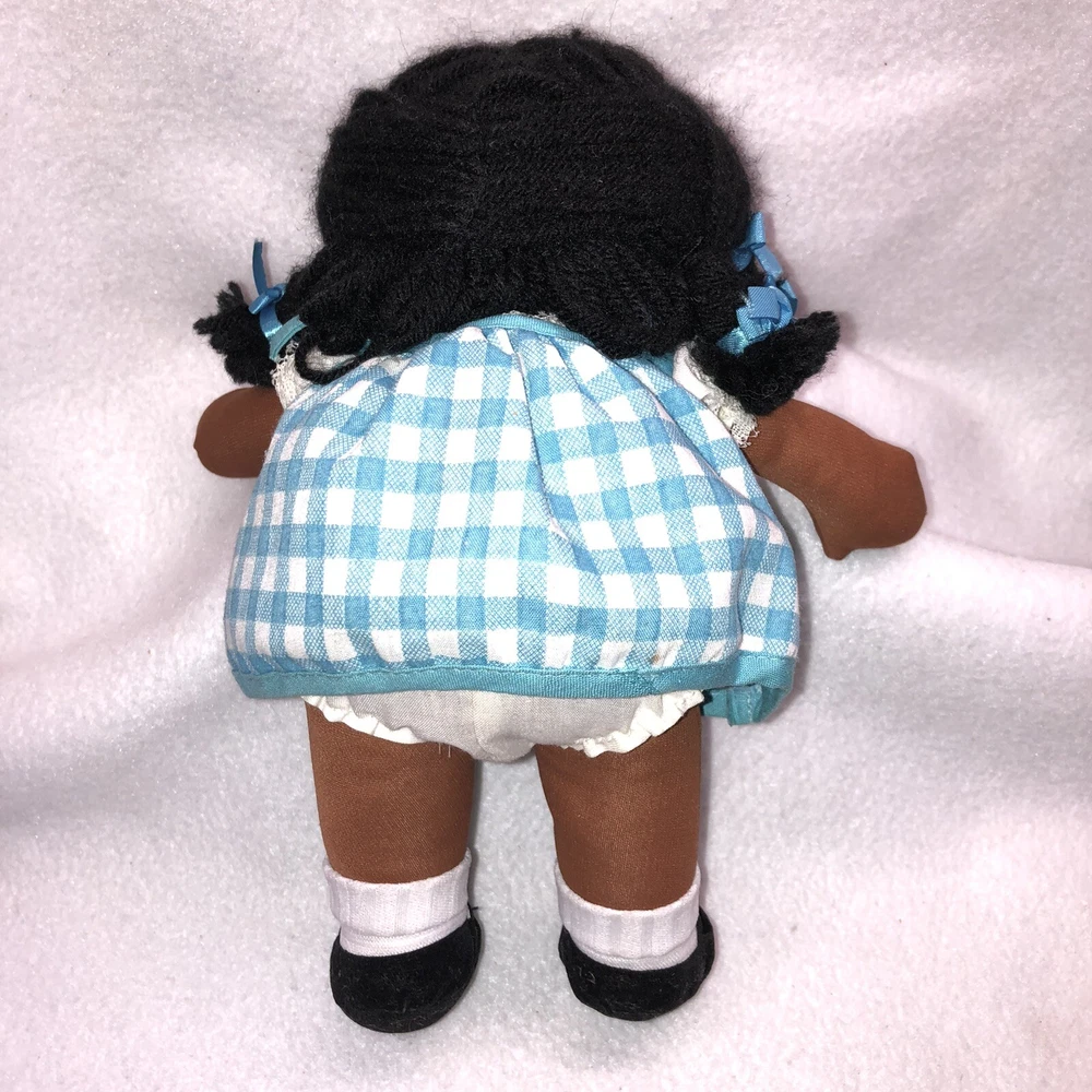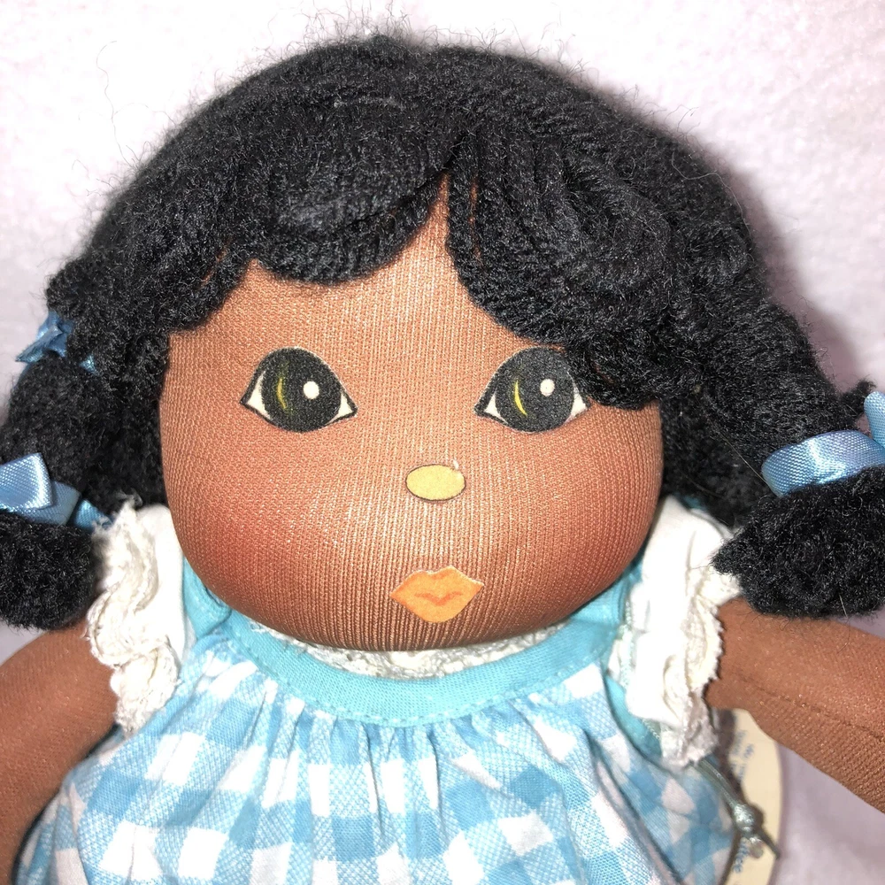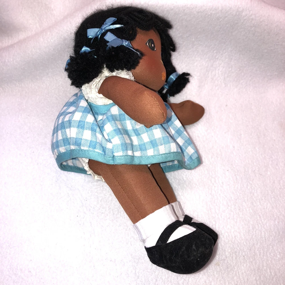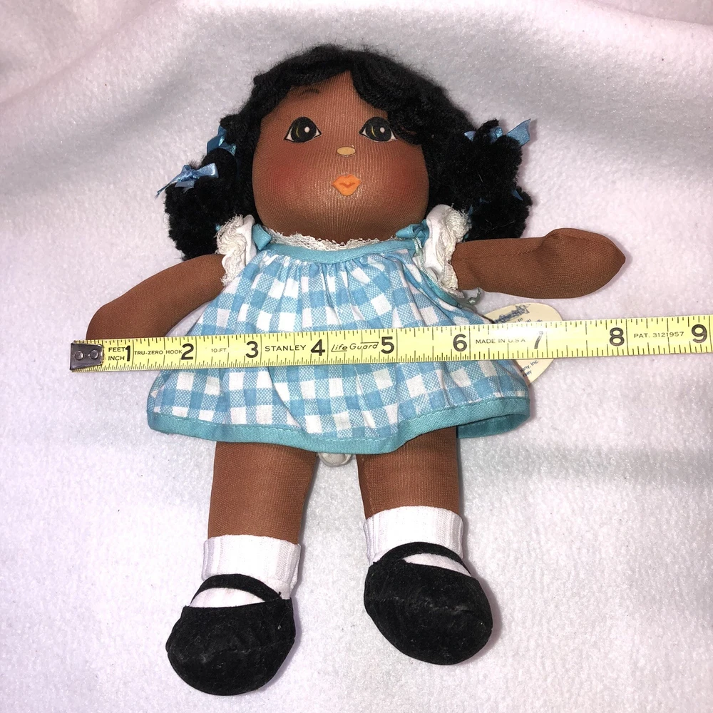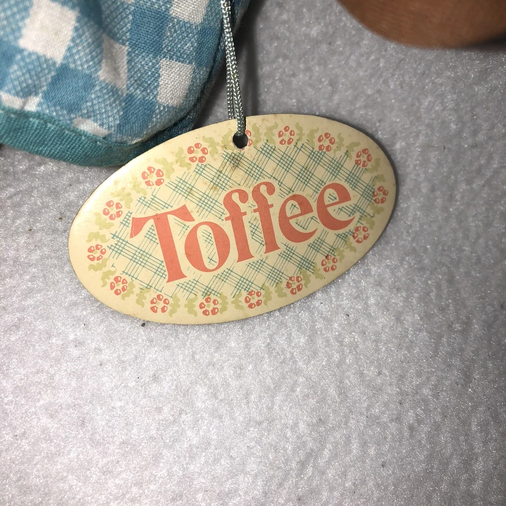 This is a sweet vintage doll from Russ Berrie and Company Inc. She is named "TOFFEE" and she comes dress in a blue and white checkered dress with a white undergarmet that is trimmed in lace that peeks out of the arm holes and neckline. She has white socks and black shoes that are attached. Her hair is black yarn that is braided into four pigtails and I believe her head is styrofoam under the fabric. Toffee's original Russ tag reads "My name is Toffee and I want you to know that I'll be your friend wherever you go. You'll recognize me by my pigtails and bows. I'm as sweet as can be from my head to my toes." She measures approximately 9 inches tall and is about 8 inches from tip of her hand to the tip of her other hand and is number 667. If I had to guess, I would date her to the 1970's. Doll is in good vintage pre-owned condition. She appears to be missing one blue bow on her left side (see 2nd photo). There are three on the right and I am assuming they were symmetrical and there should be three on the left. She comes with her original Russ tag still attached. There is some writing on the back of the tag (see 7th photo). I did note a small spot on the back of her dress near the hem (see last photo). Please review and enlarge all photos as they contain additional details, views and measurements. Shipped via USPS Ground Advantage.