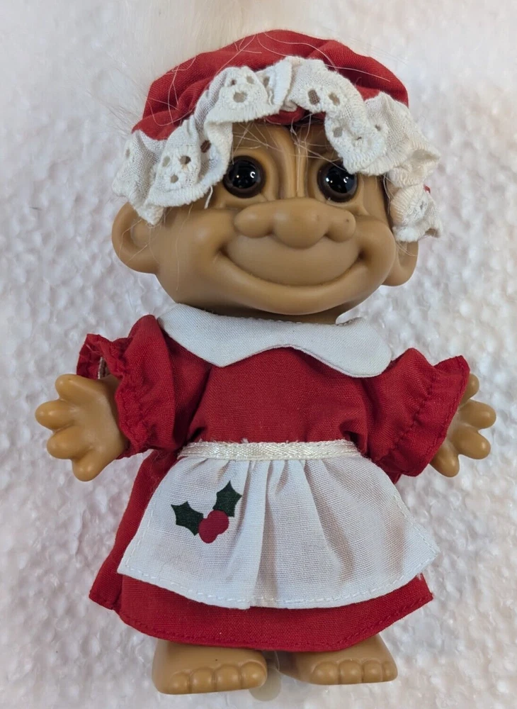 Embrace the festive spirit with the charming Russ Berrie Troll Mrs. Claus figurine. At 5 inches tall, this delightful character is decked out in her signature red and white, complete with a holly apron, exuding the warmth and cheer of Christmas. Crafted from durable vinyl, this piece captures the whimsy of the holiday season and is a treasured addition to any collection. Whether displayed on a mantel or nestled among your holiday decor, this medium-sized, multicolored figurine is suitable for both adult and kid audiences, making it a versatile gift or a quaint keepsake. It's a genuine original, complete with the original Russ sticker on its foot, celebrating its vintage appeal and the joy of the yuletide season.