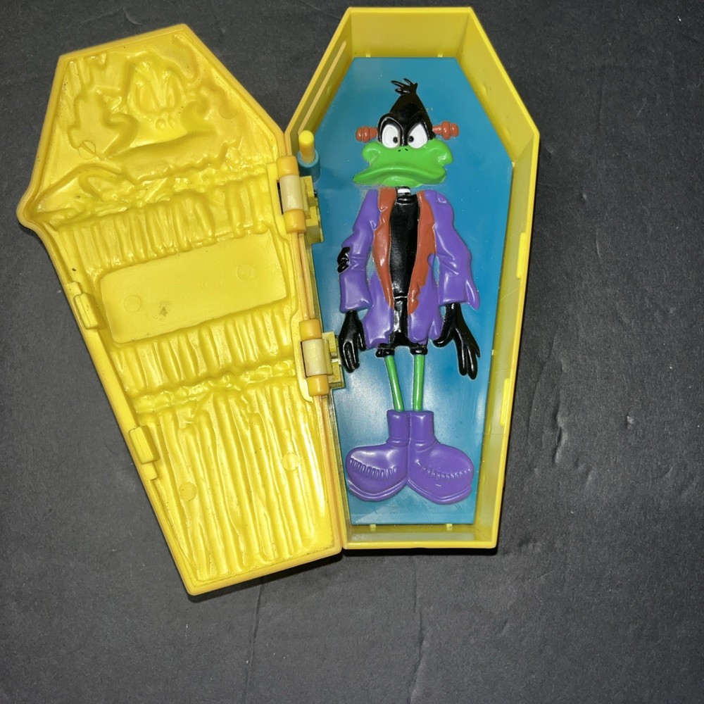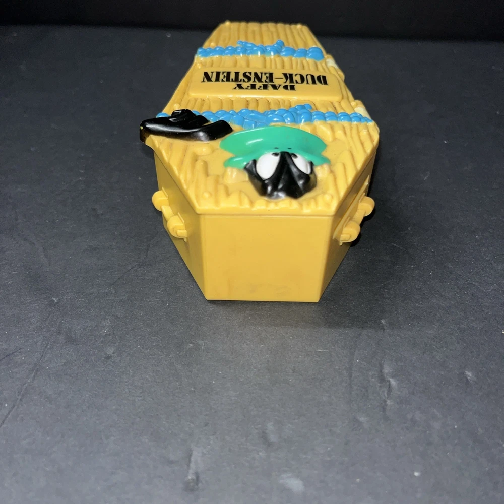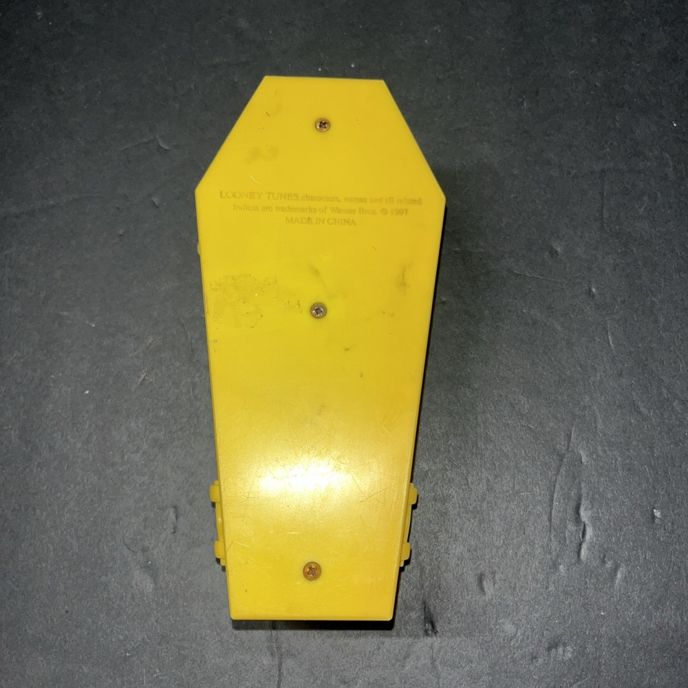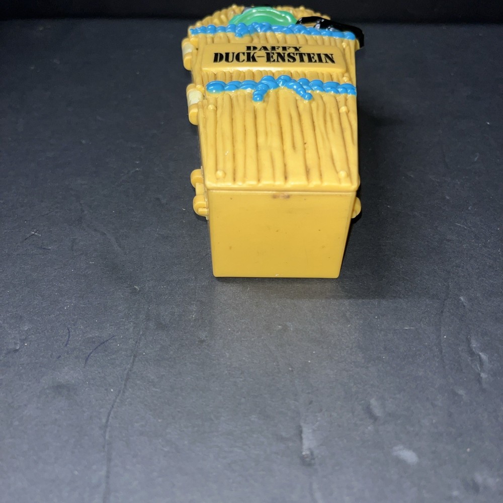 The product is a vintage Looney Tunes Daffy Duck candy container from 1997, featuring the iconic character in a yellow plastic design. This collectible item does not come with any candies included, making it a unique and fun addition to any Daffy Duck or Looney Tunes fan's collection. The container was manufactured in China and is a must-have for enthusiasts of the classic animated series.